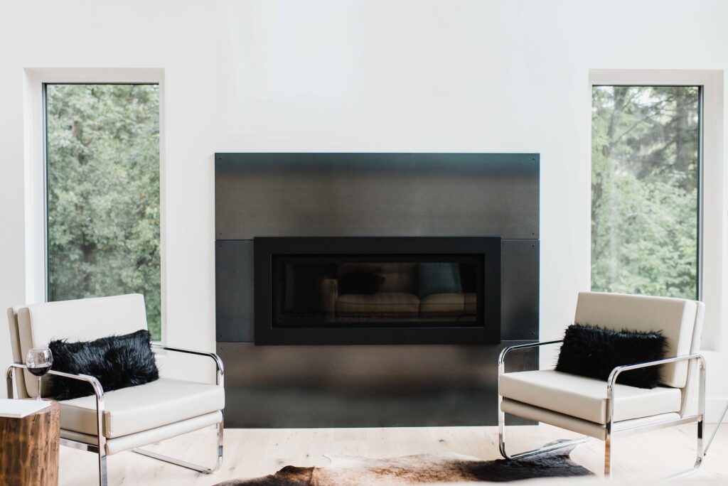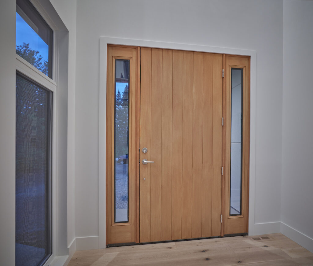 This contemporary custom home features and open concept layout, contemporary design, and luxurious finishes. The main living space has a unique, contemporary window layout that is nicely complimented by the high ceilings. The modern light wood floors and white walls bring a very bright and open feel that continues through to the kitchen/dining area. A unique element to this kitchen is the reclaimed wood feature wall. This adds a more rustic feel to the home that matches nicely to the dark tiled ribbon fireplace.