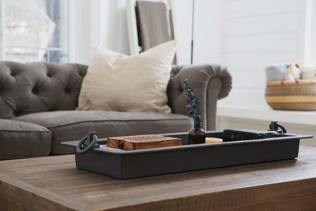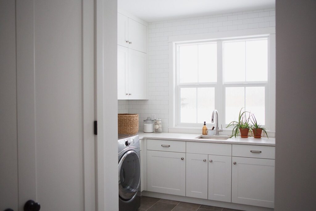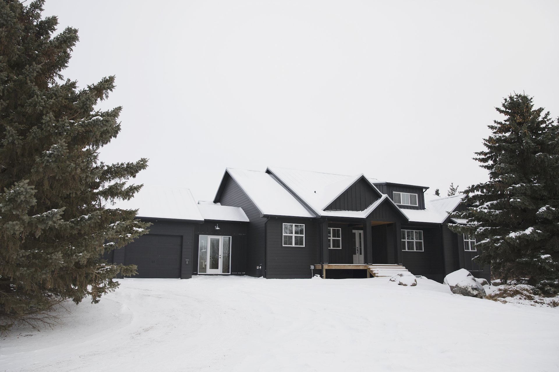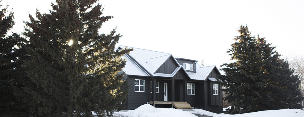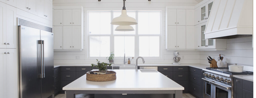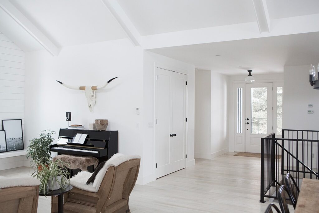 This custom home features high vaulted ceilings with a bright and open concept living area. The farmhouse design of the interior brings a warmth to such an open and bright home.