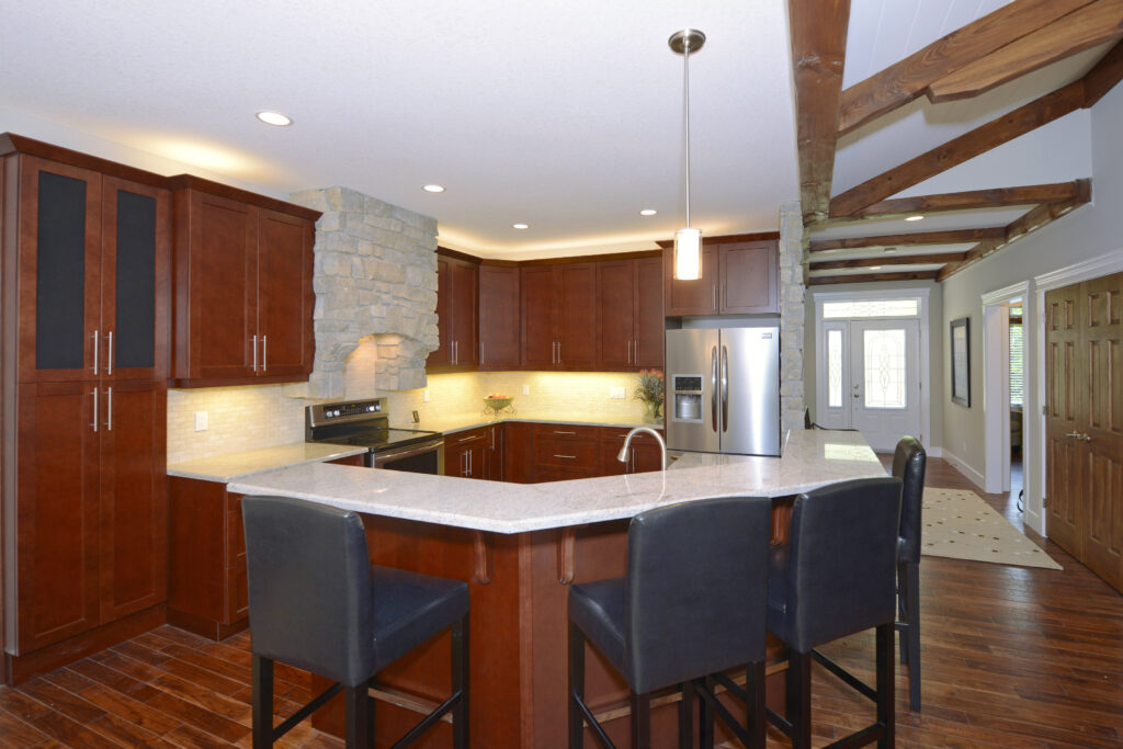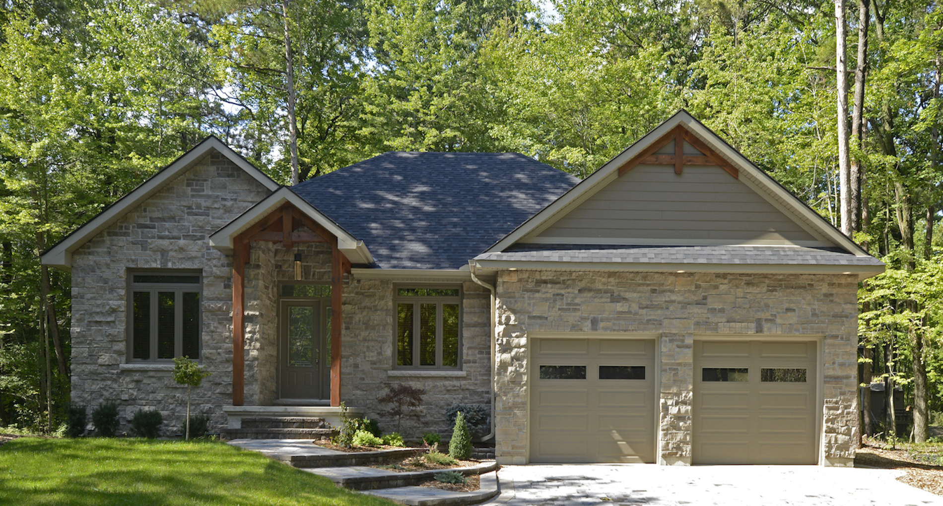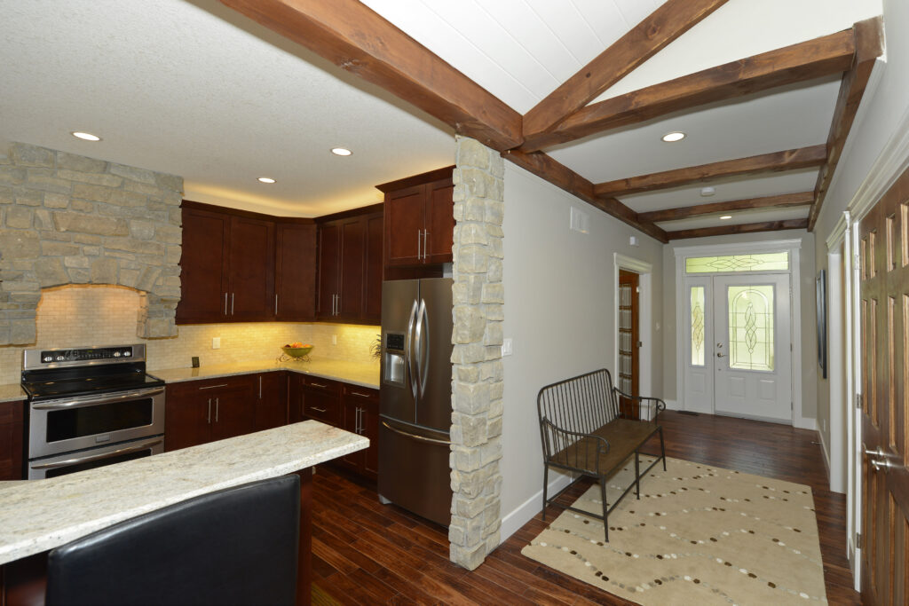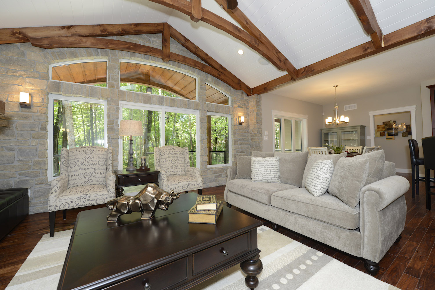 Located in the countryside, this custom home takes inspiration from traditional, rustic and modern styles. The stone walls and wooden beams the home features gives it the feel of a country cottage, while the modern design proves it also has sophistication and class.