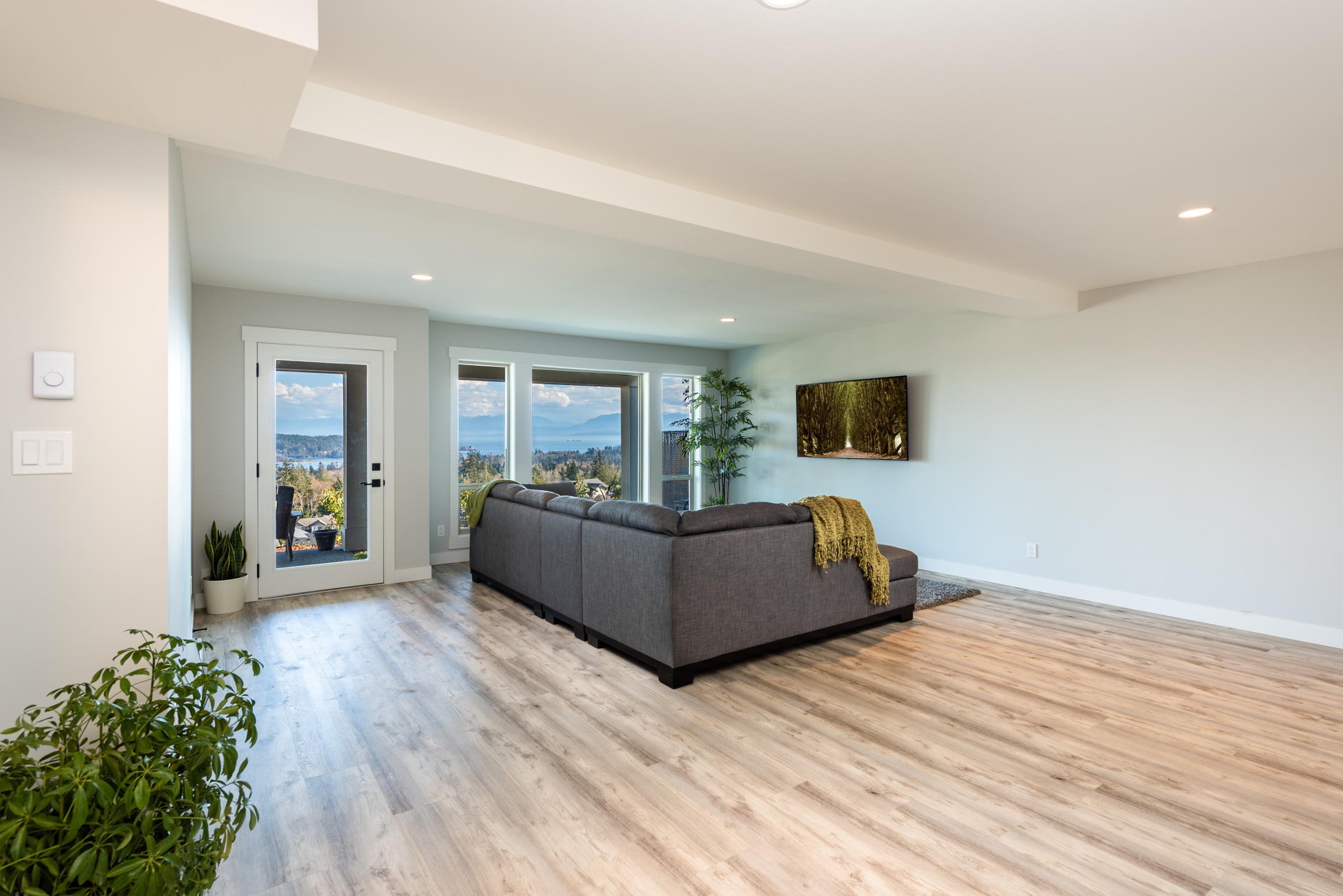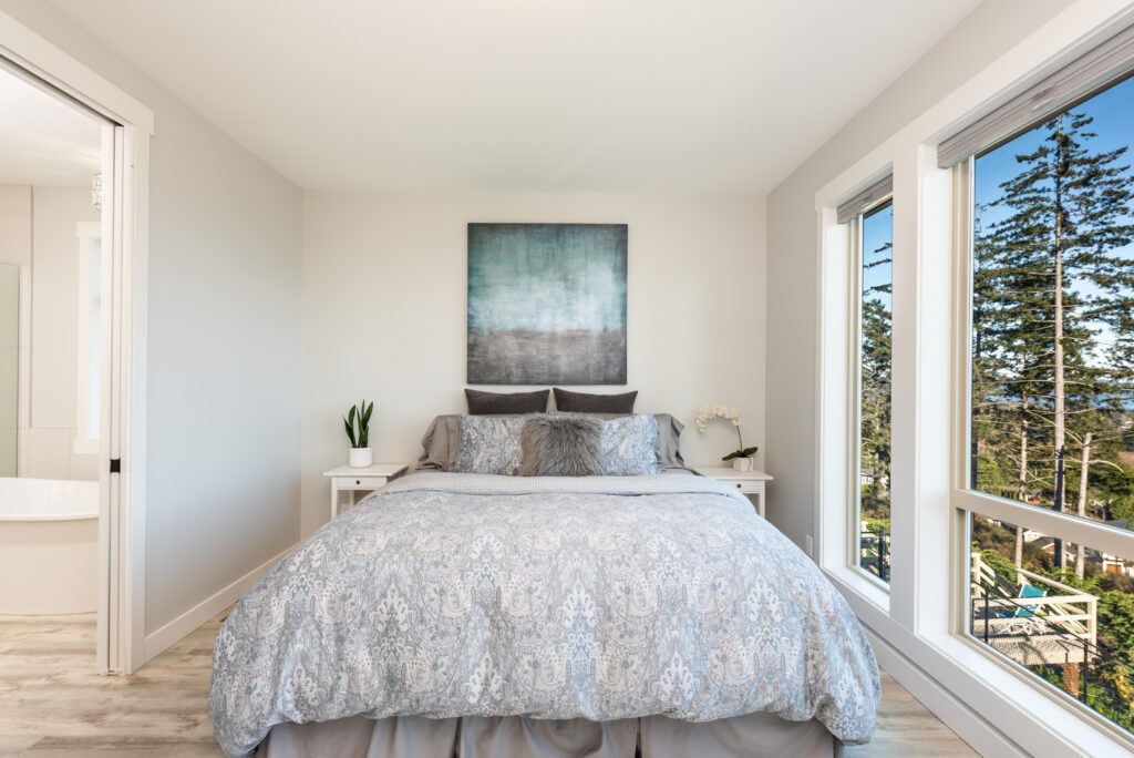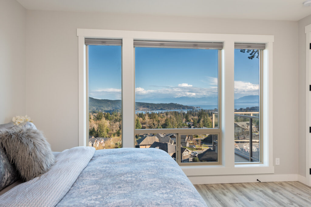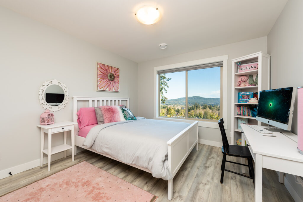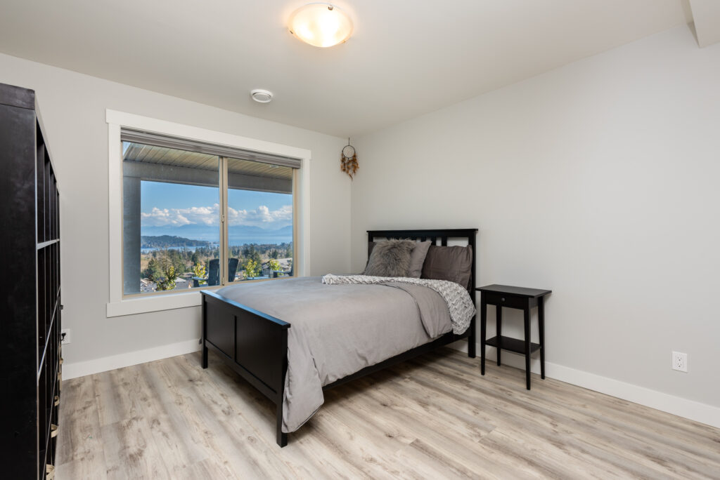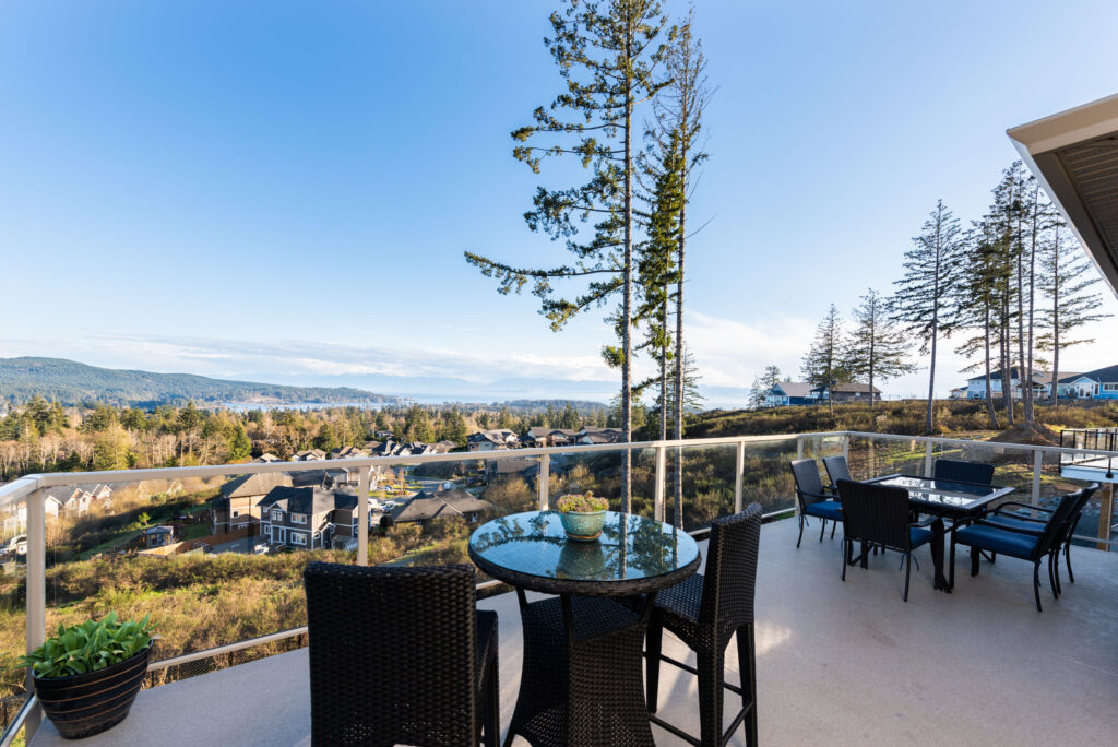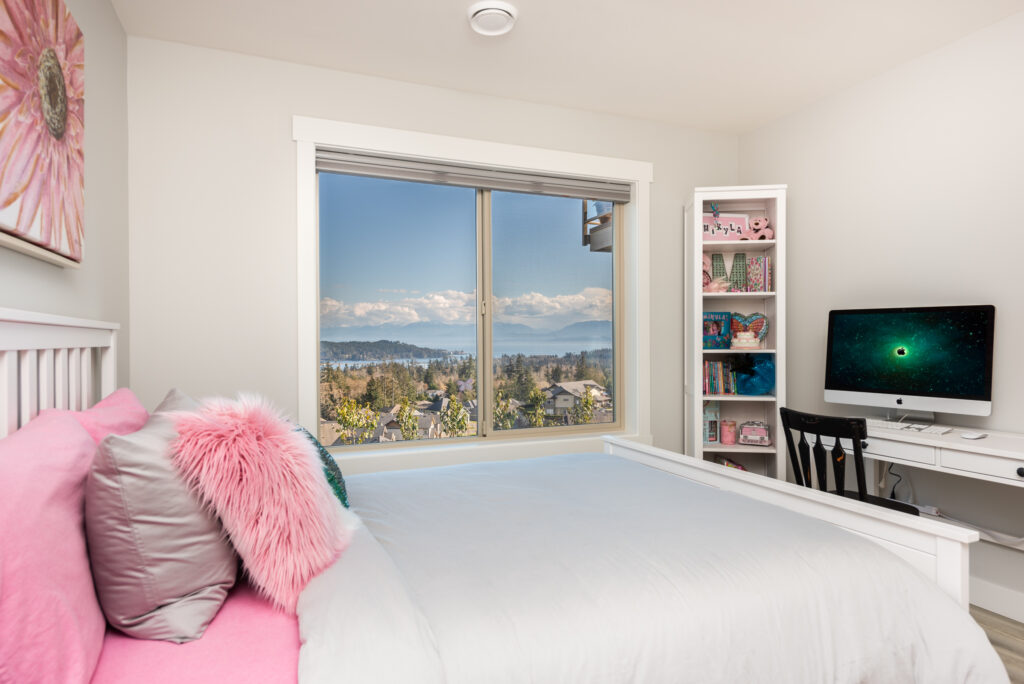 This custom home features an extensive open floor plan with ocean and mountain views. The kitchen has white shaker cabinetry, gas cooking, and quartz countertops. This is an excellent family home with stunning views.