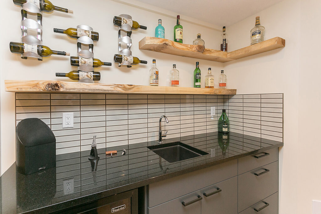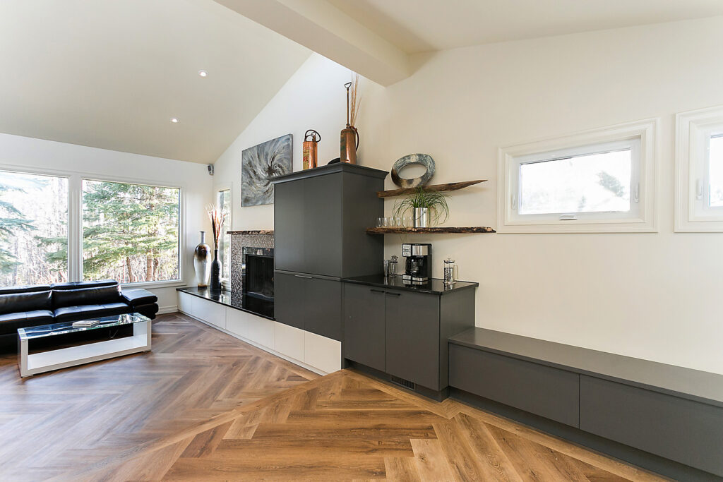 This modern designed custom home features an open-concept layout, hardwood floors throughout the main living areas, unique tile backsplashes, and high-end finishes. The large windows bring in plenty of natural light.