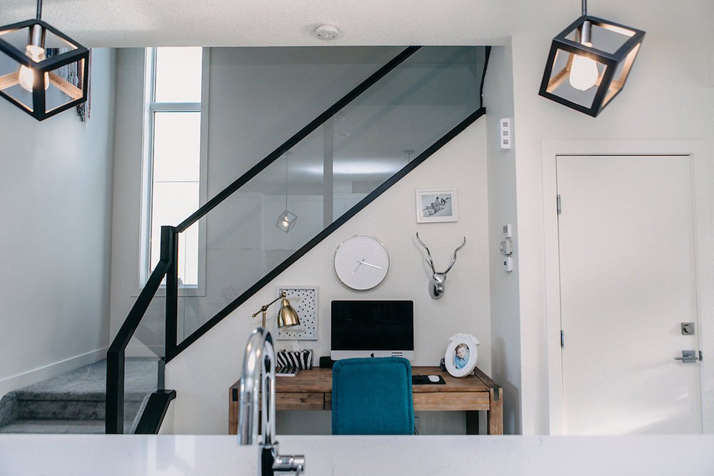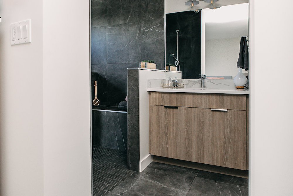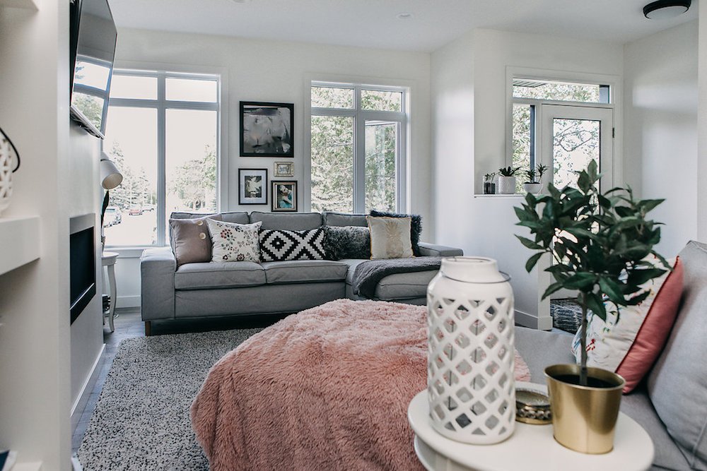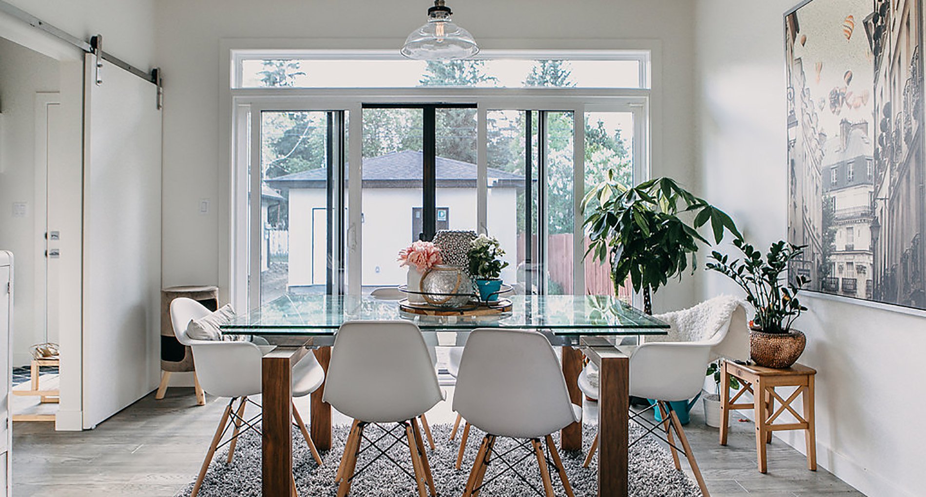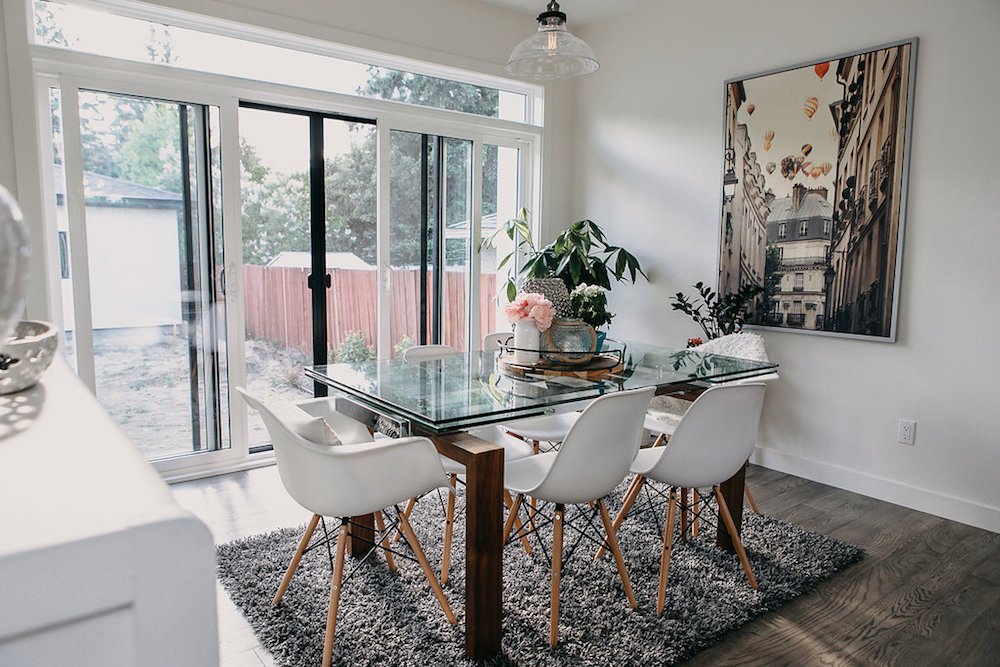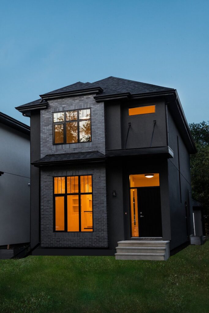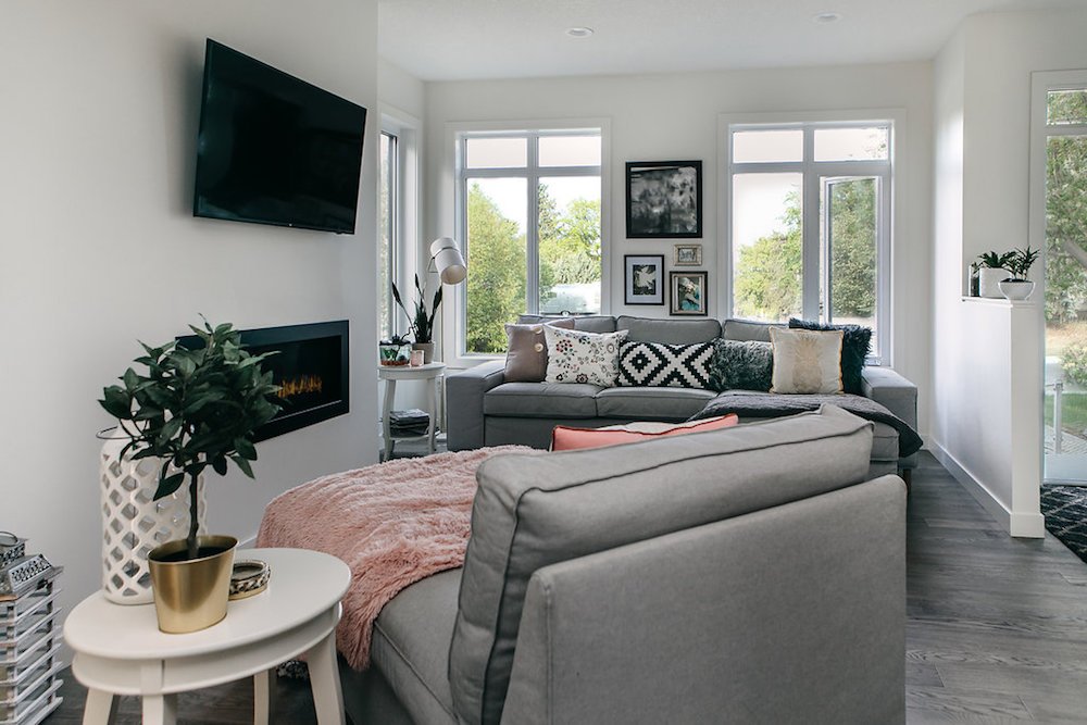This modern custom home features large open windows and an open concept layout, creating a bright and airy main living space. The living room features a modern fireplace, hardwood floors, and large, open windows, creating a cozy atmosphere.