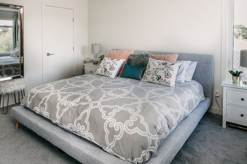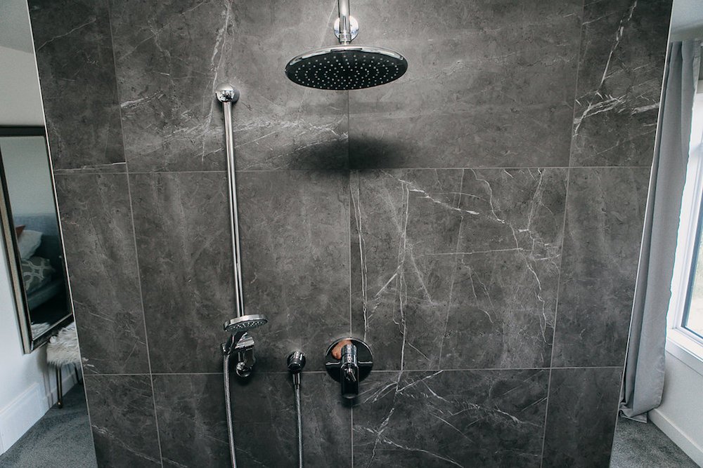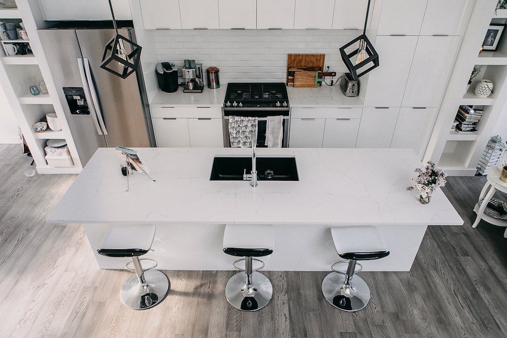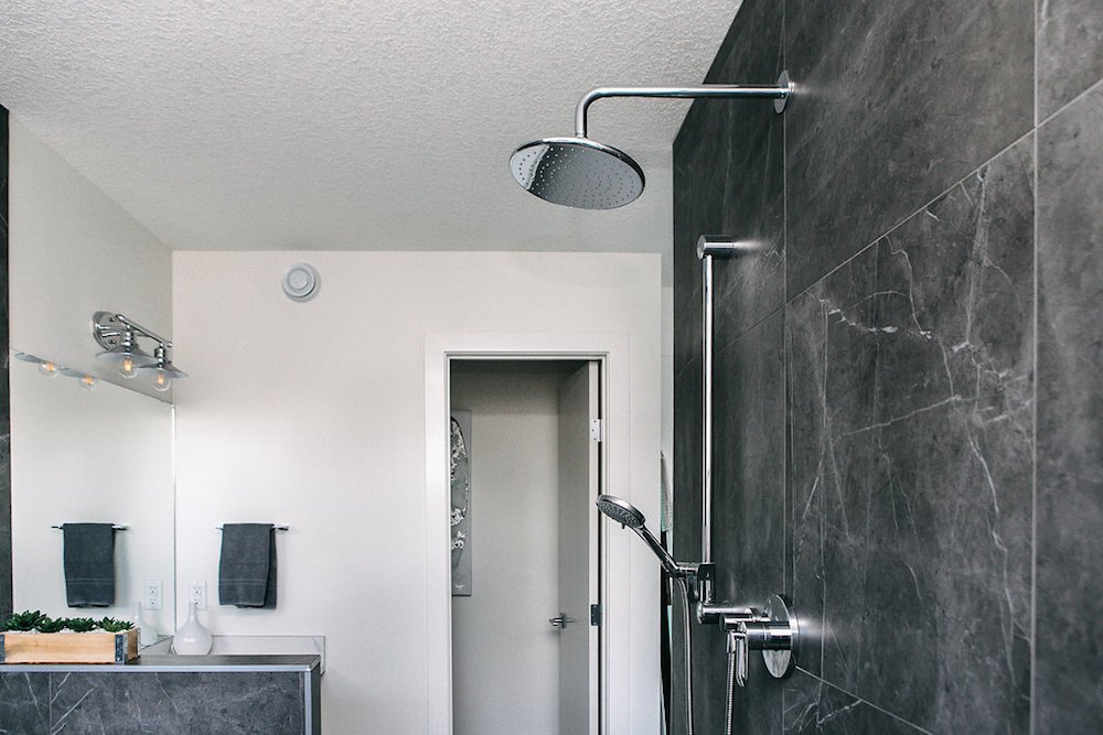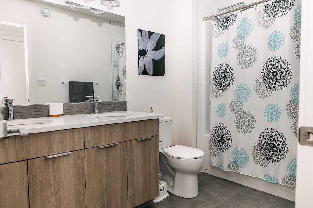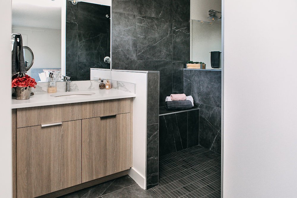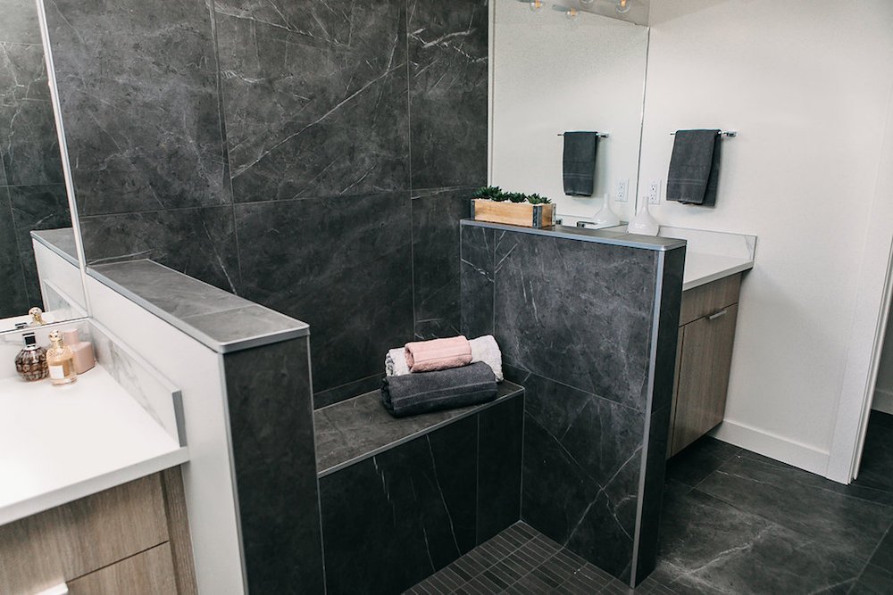 This modern custom home features large open windows and an open concept layout, creating a bright and airy main living space. The living room features a modern fireplace, hardwood floors, and large, open windows, creating a cozy atmosphere.
