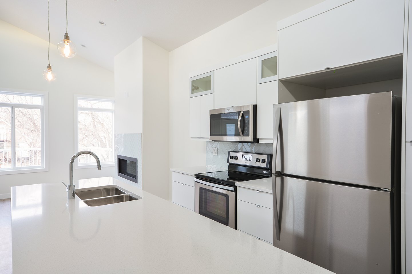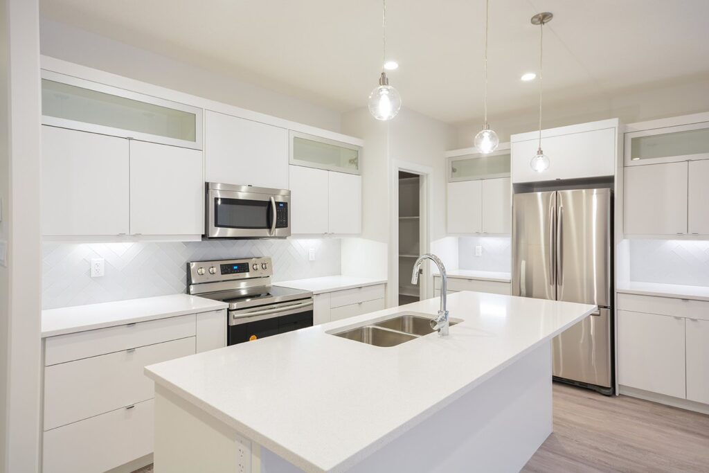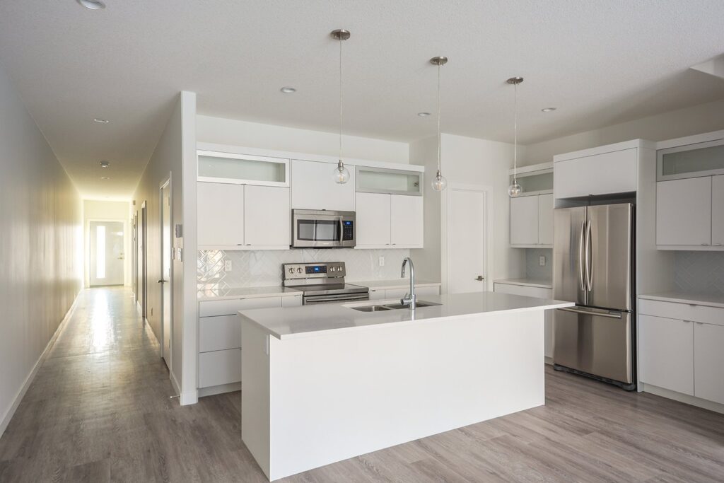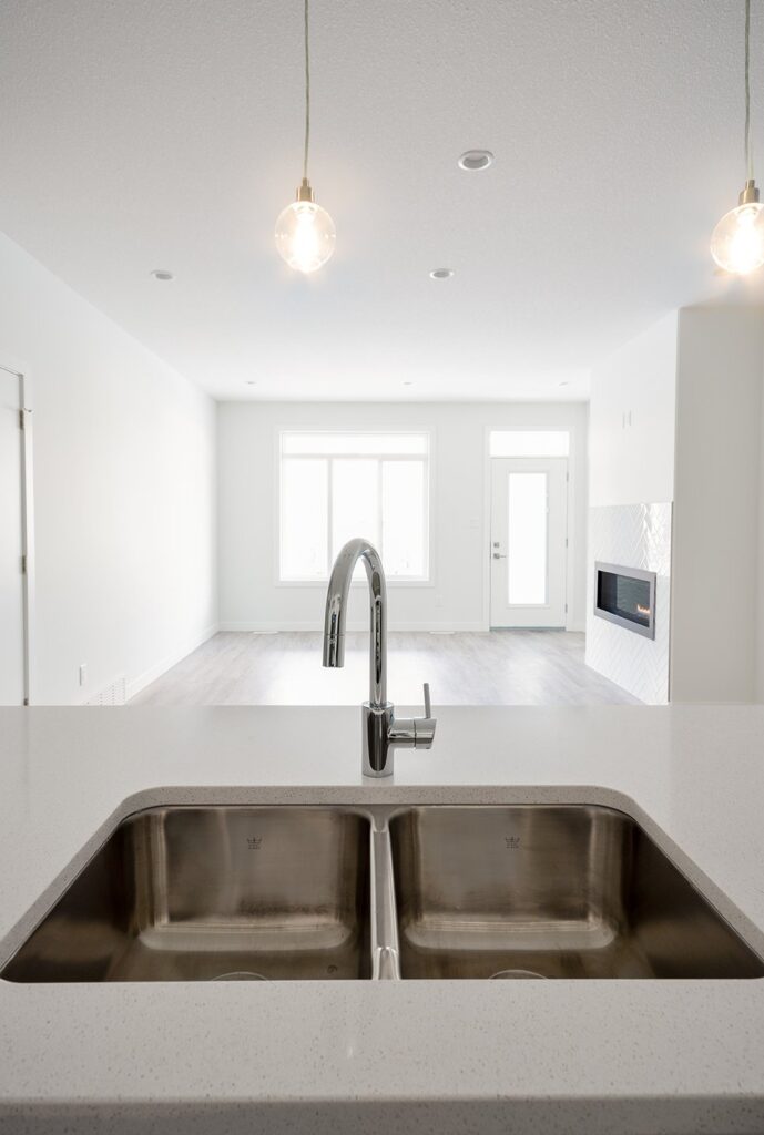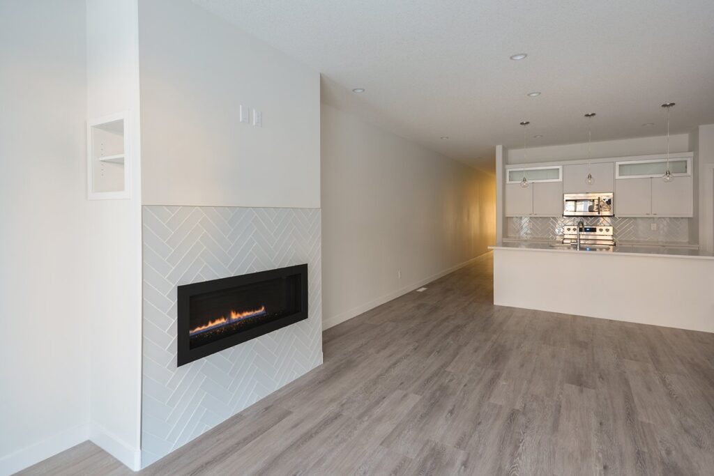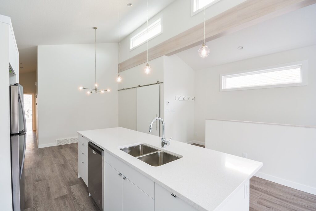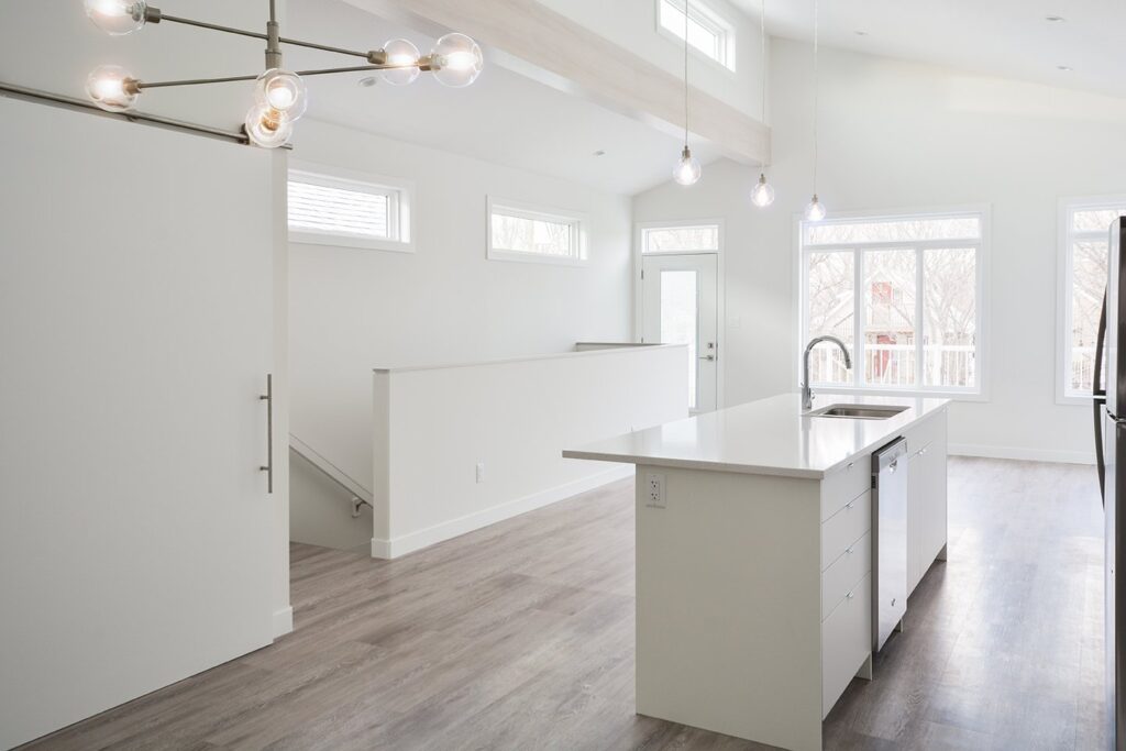This custom home features a bright and open concept living area, kitchen, and high ceilings.