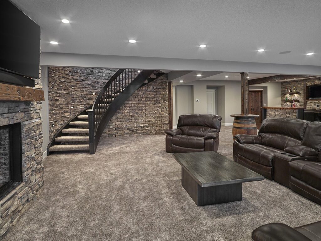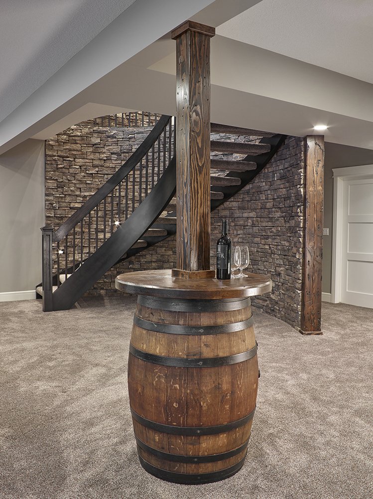 Custom beam work was done on site to add the “rustic” element to many of the rooms, most specifically the bar area. An old wine barrel was used to wrap around a structural post in the basement, continuing the rustic theme and providing a stylish way of covering a necessary structural post.