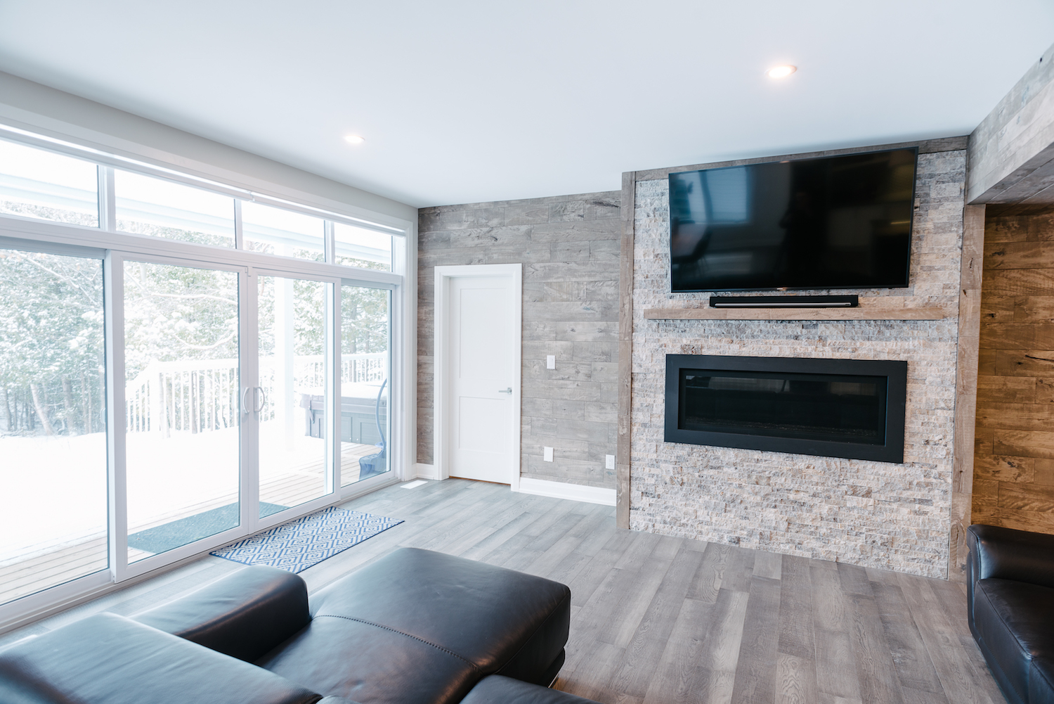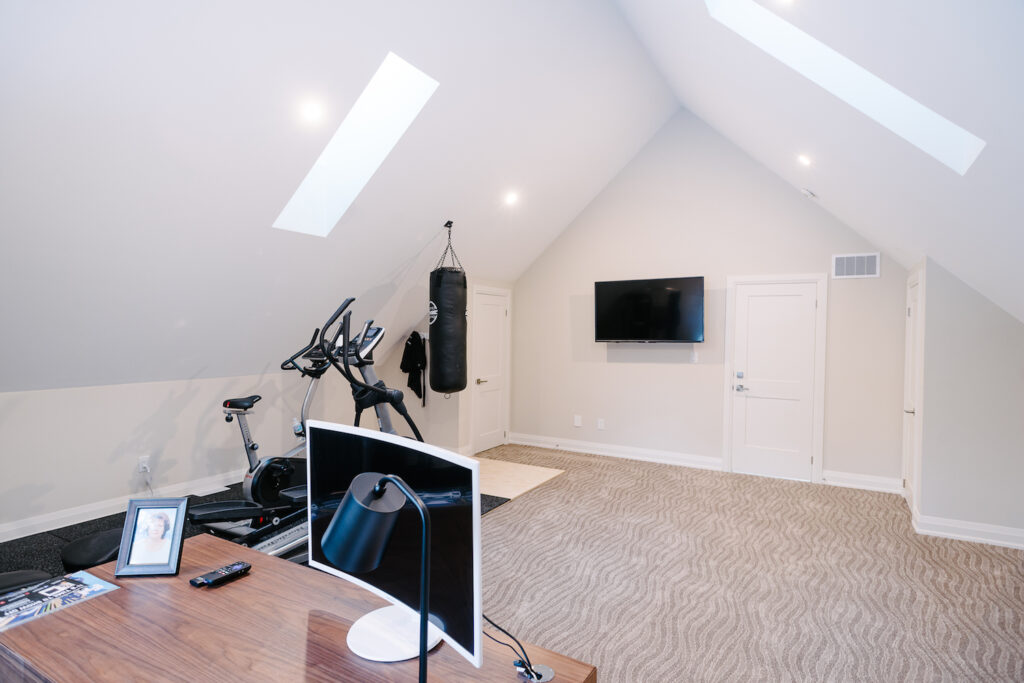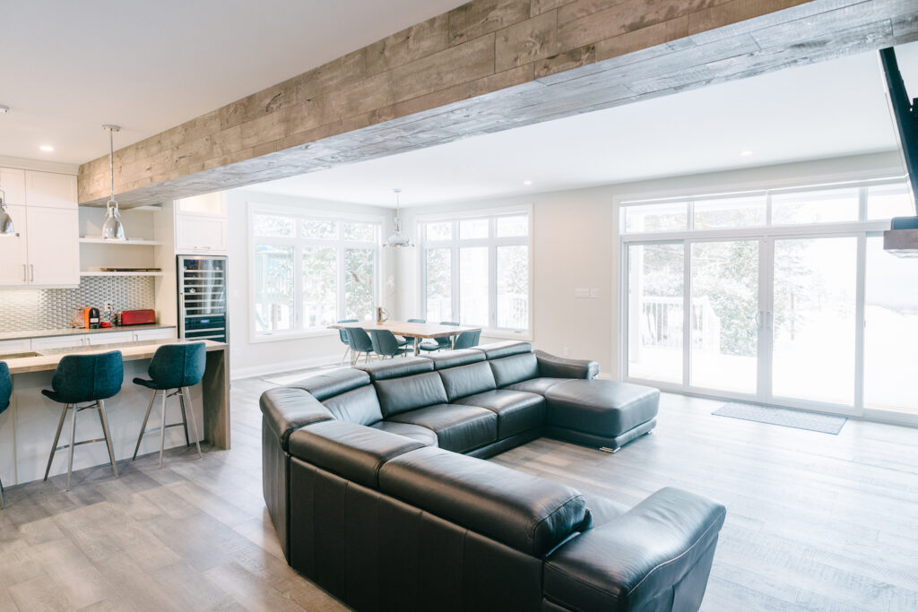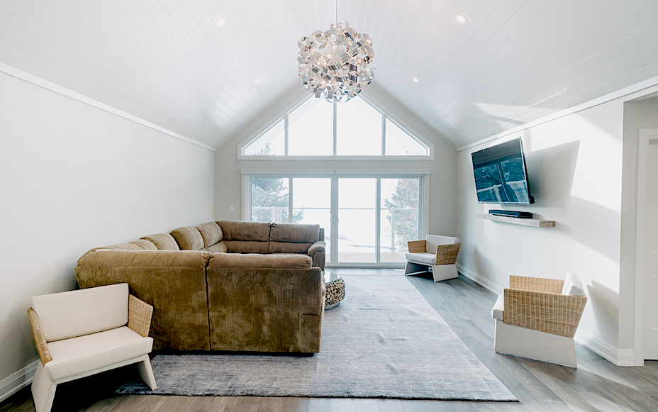 This Georgian Bay waterfront beach home is 4,500 sqft and features 5 bedrooms, 3.5 baths, office, gym, media room, main floor and upper floor great rooms with vaulted ceilings and a custom kitchen.