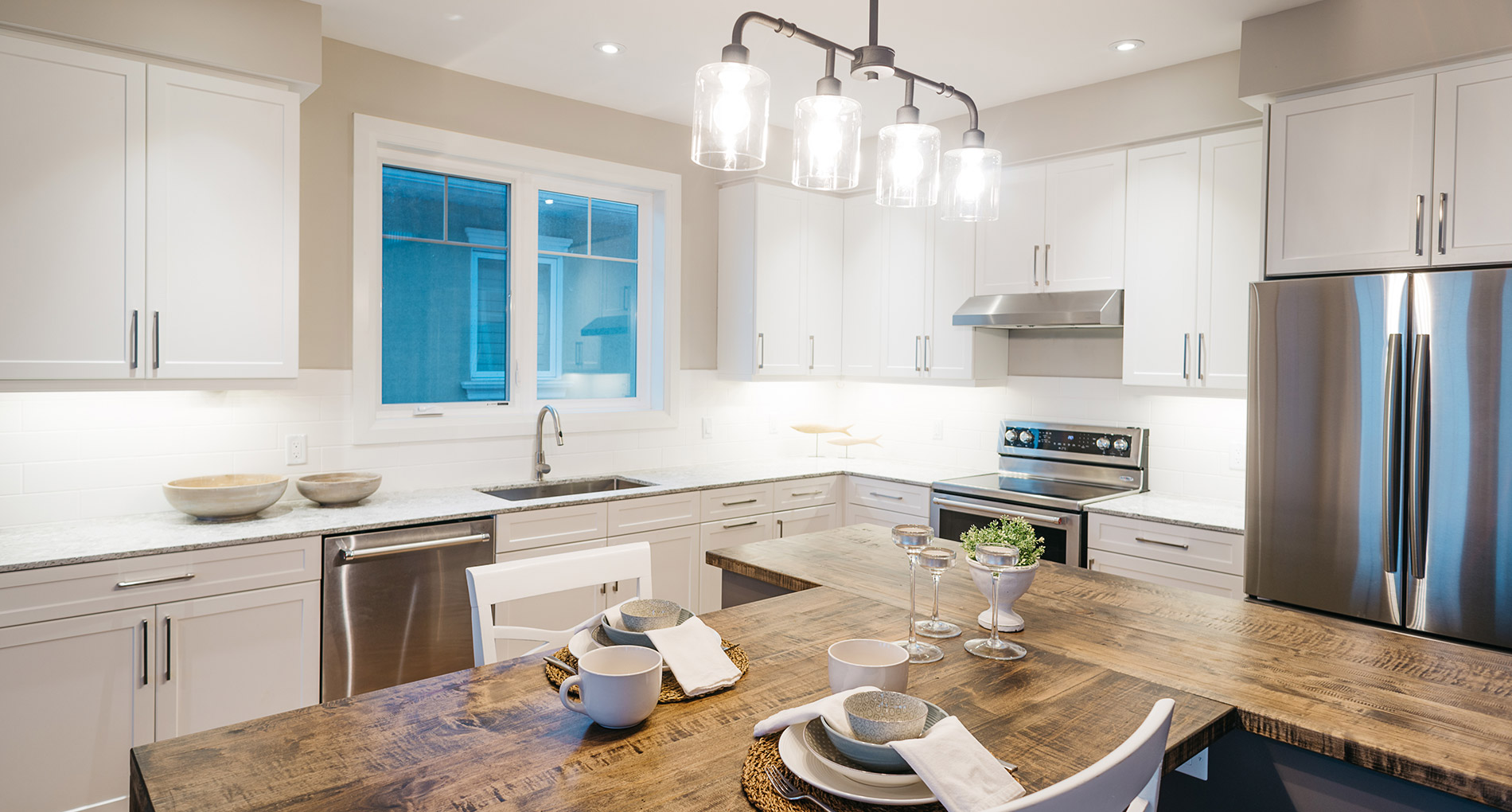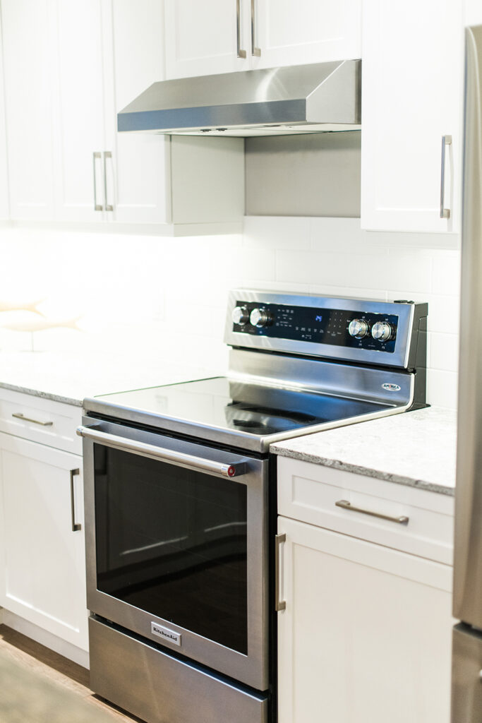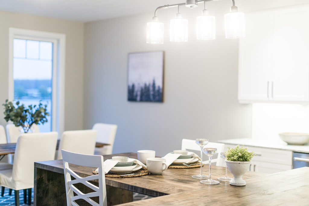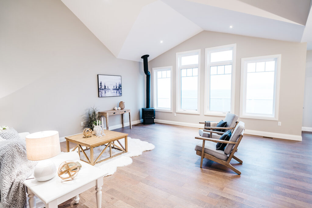 This 4 bedroom, 2.5 bath custom home features an open-concept layout with vaulted ceilings and hardwood floors throughout. The kitchen and living room features a blend of rustic and modern design elements – distressed wood counters and finishes, white cabinets and chairs, and stainless-steel appliances create a cozy and sophisticated atmosphere. The wood stove in the living room adds to the rustic charm of the space.