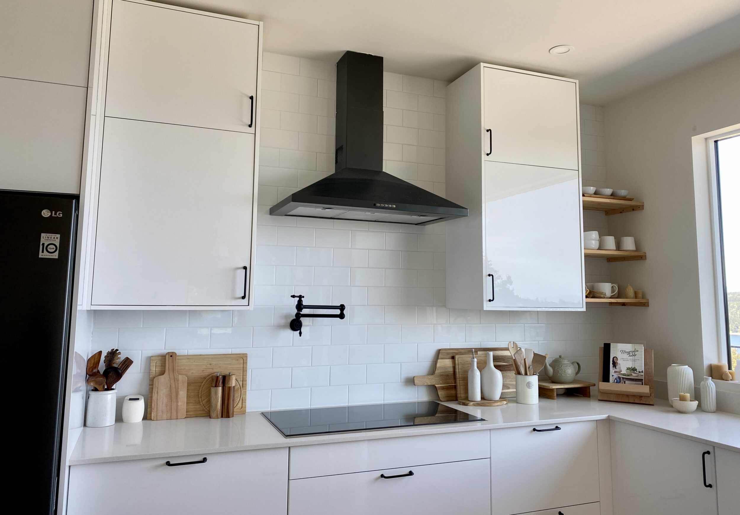 For some contrast, we installed a black appliance set and black hardware and fixtures. It really makes this space pop.