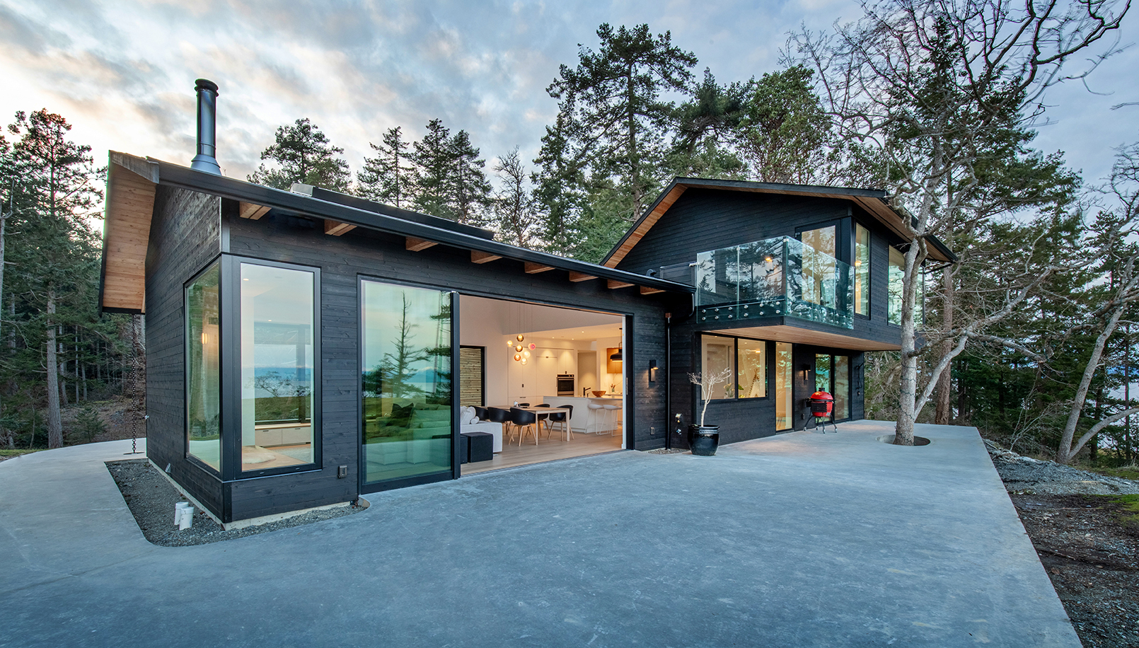 Stacking Innotech/Fleetwood doors, open to the large patio, which extends the indoor living space to the outdoors, maximizing the inspiring views. A large deciduous tree that was spared from removal, is now surrounded by the concrete patio and is enjoyed as a permanent addition to the home.