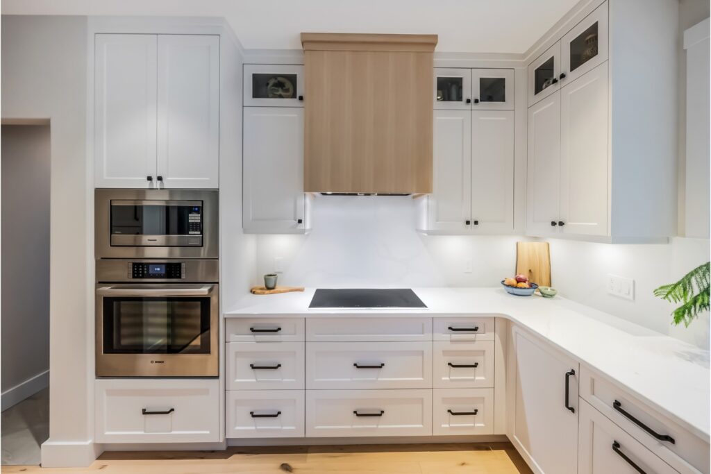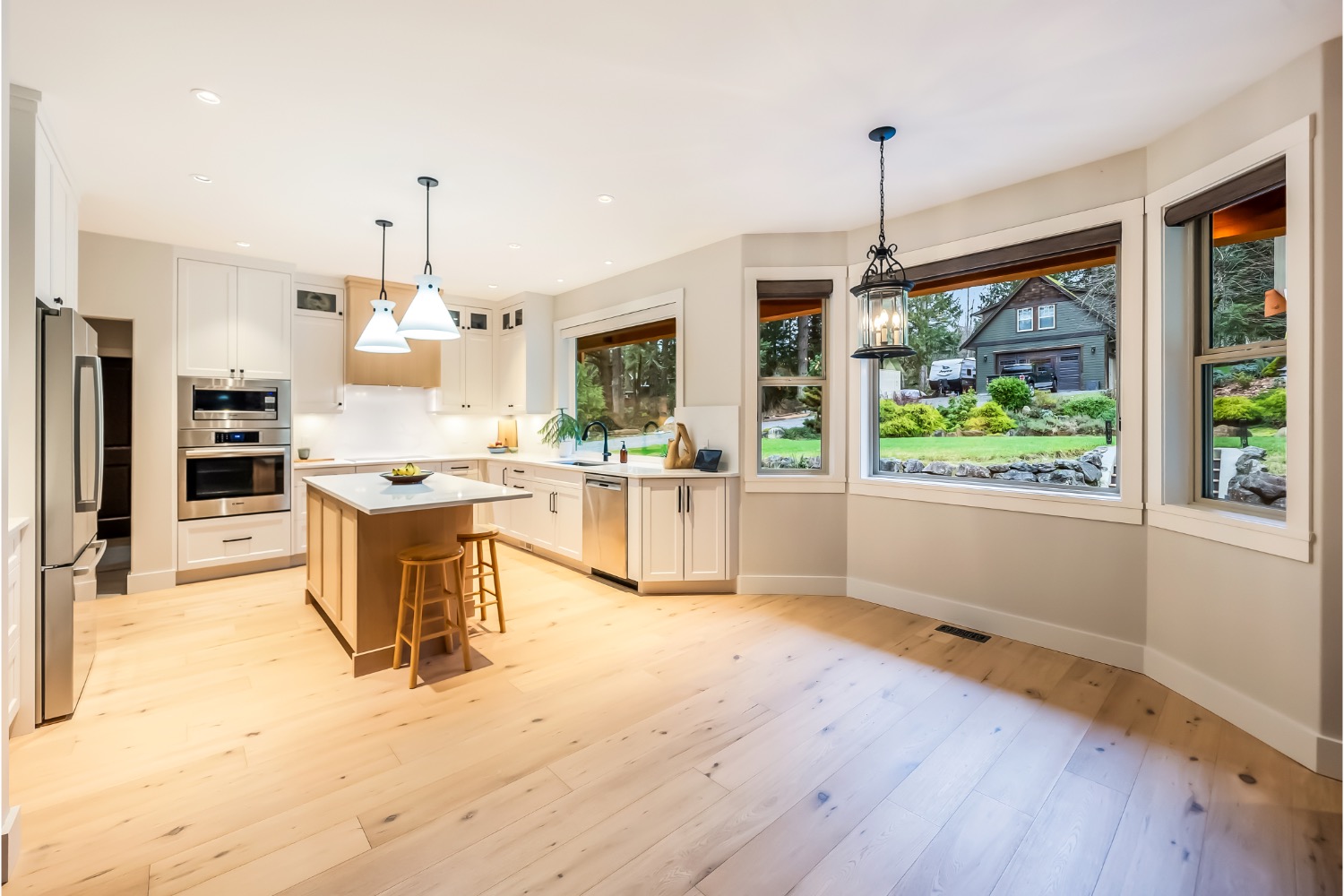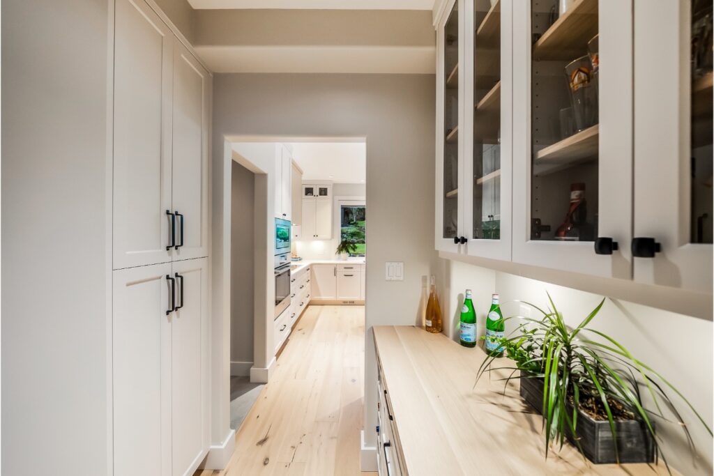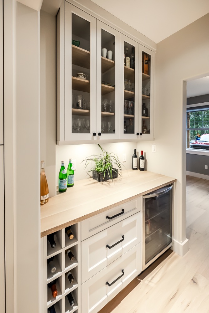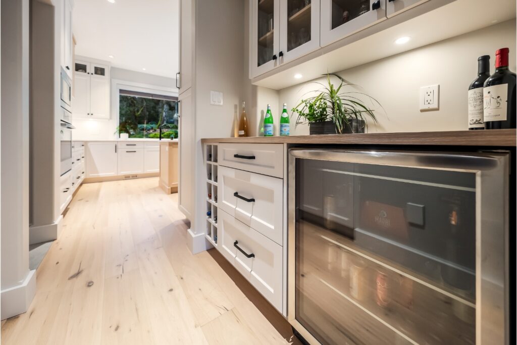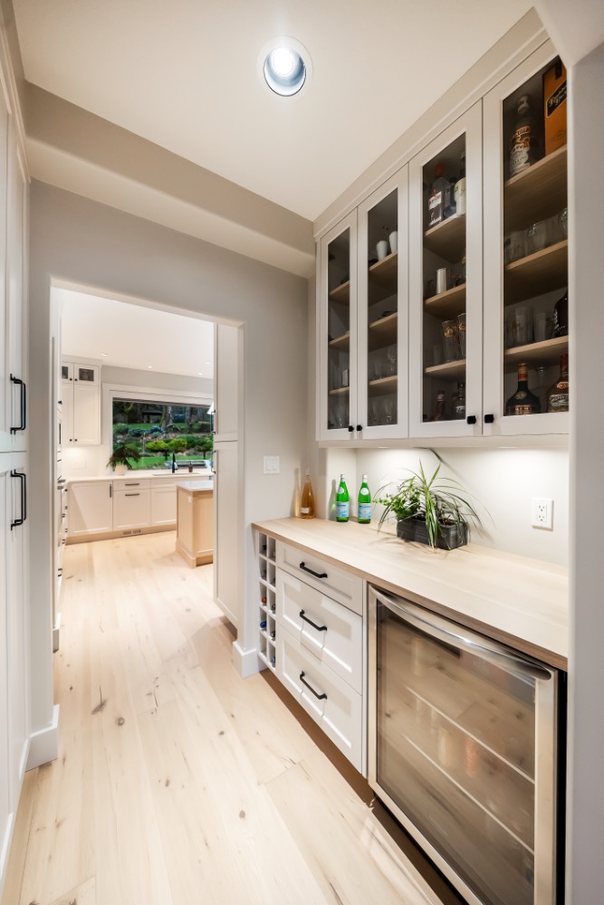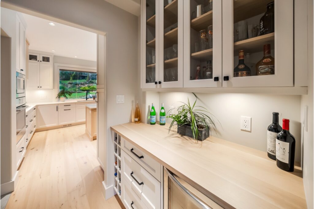 The kitchen shines as the heart of the home, featuring rift sawn white oak and sleek white cabinets for a modern yet timeless aesthetic. A new island with seating invites connection and casual dining, while under-cabinet lighting highlights quartz countertops and backsplash, adding practicality and luxury. Just off the kitchen, the stylish bar area is perfect for entertaining, with a butcher block countertop, glass cabinetry doors, a wine rack, and a pantry cabinet equipped with pull-out storage.