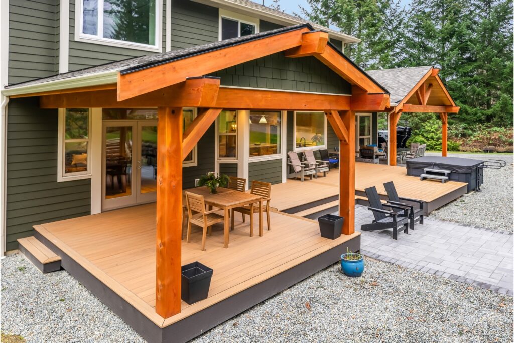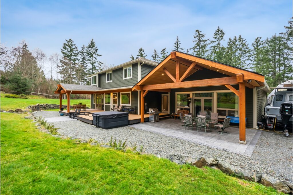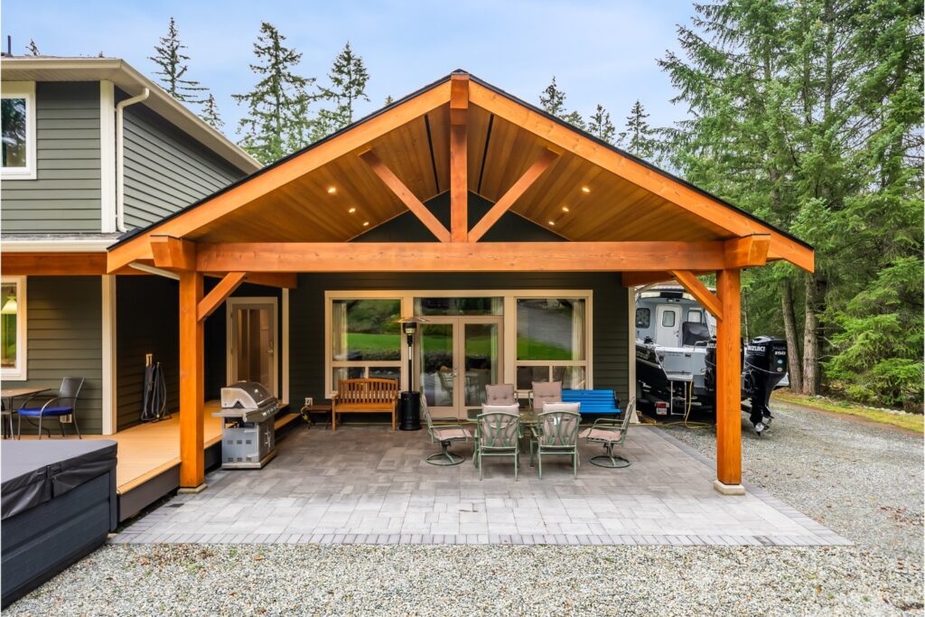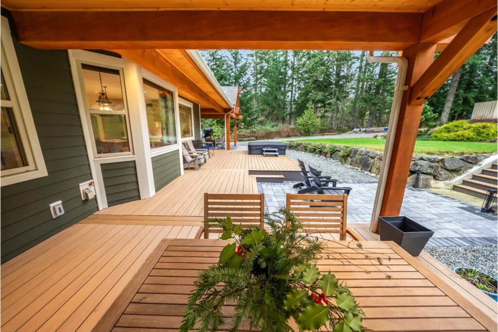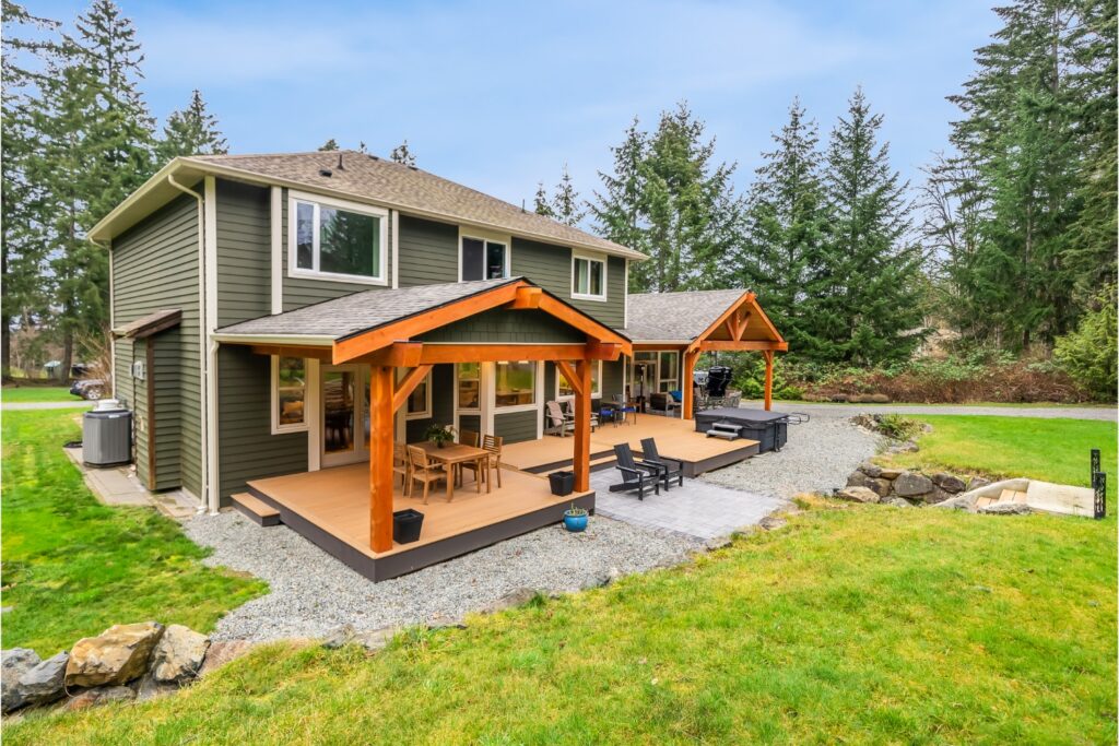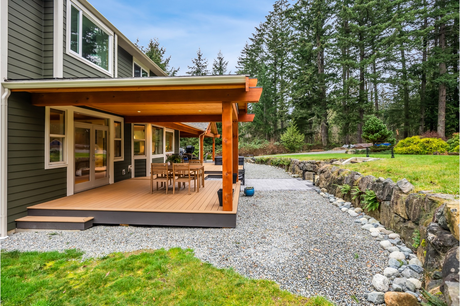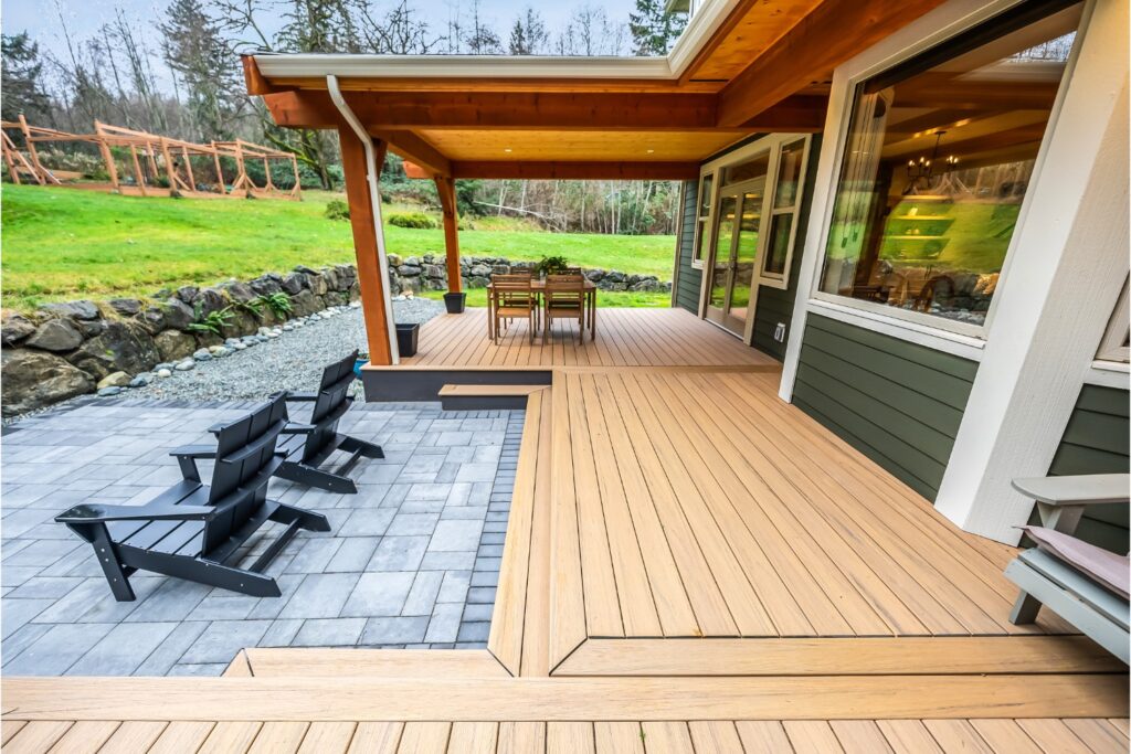 Outside, the backyard is a haven of relaxation. New windows and siding frame the expanded deck, which includes two timber-framed covered areas—a cozy dining nook and a vaulted space designed for family time around the firepit. The serene views of trees and expansive garden beds complete this outdoor retreat.