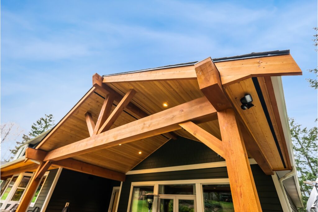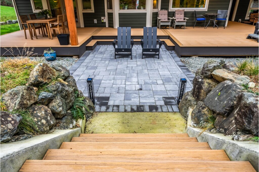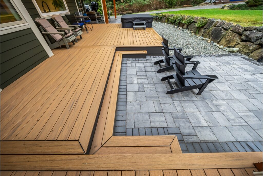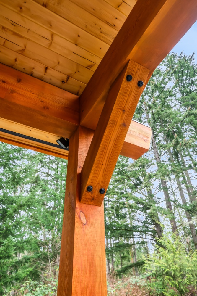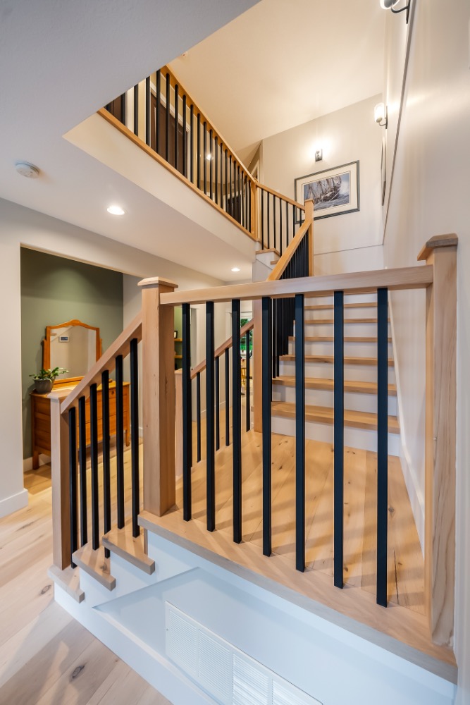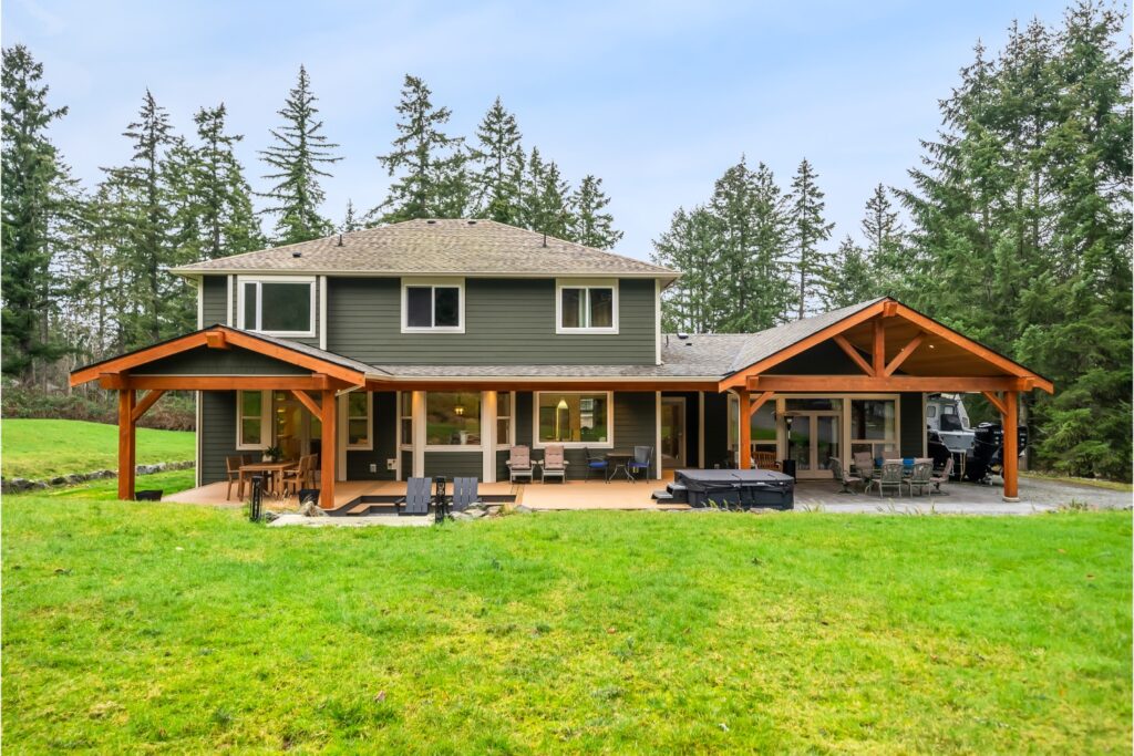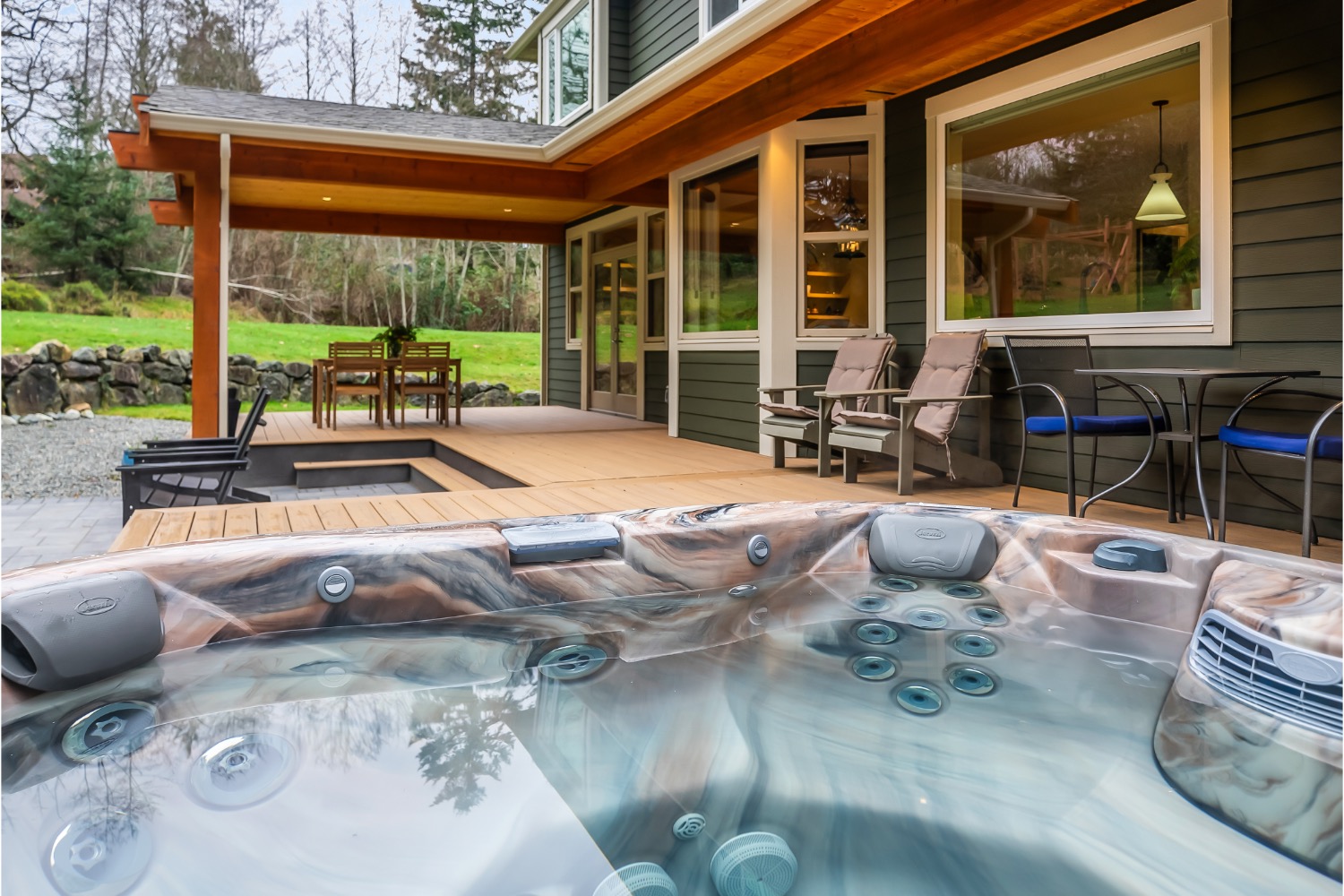 Outside, the backyard is a haven of relaxation. New windows and siding frame the expanded deck, which includes two timber-framed covered areas—a cozy dining nook and a vaulted space designed for family time around the firepit. The serene views of trees and expansive garden beds complete this outdoor retreat.