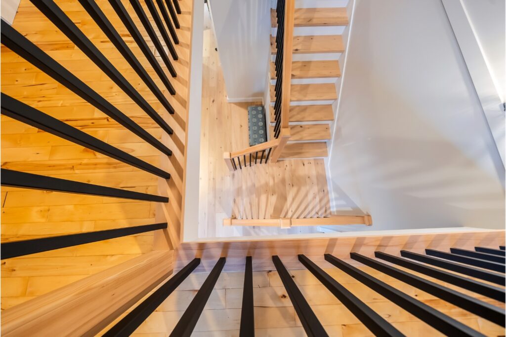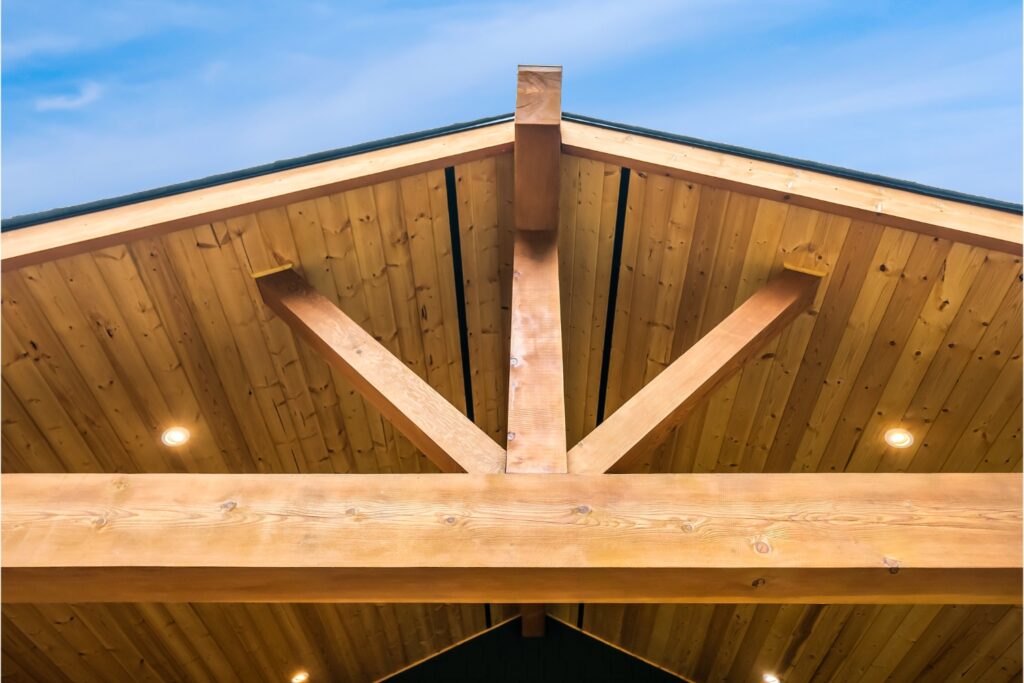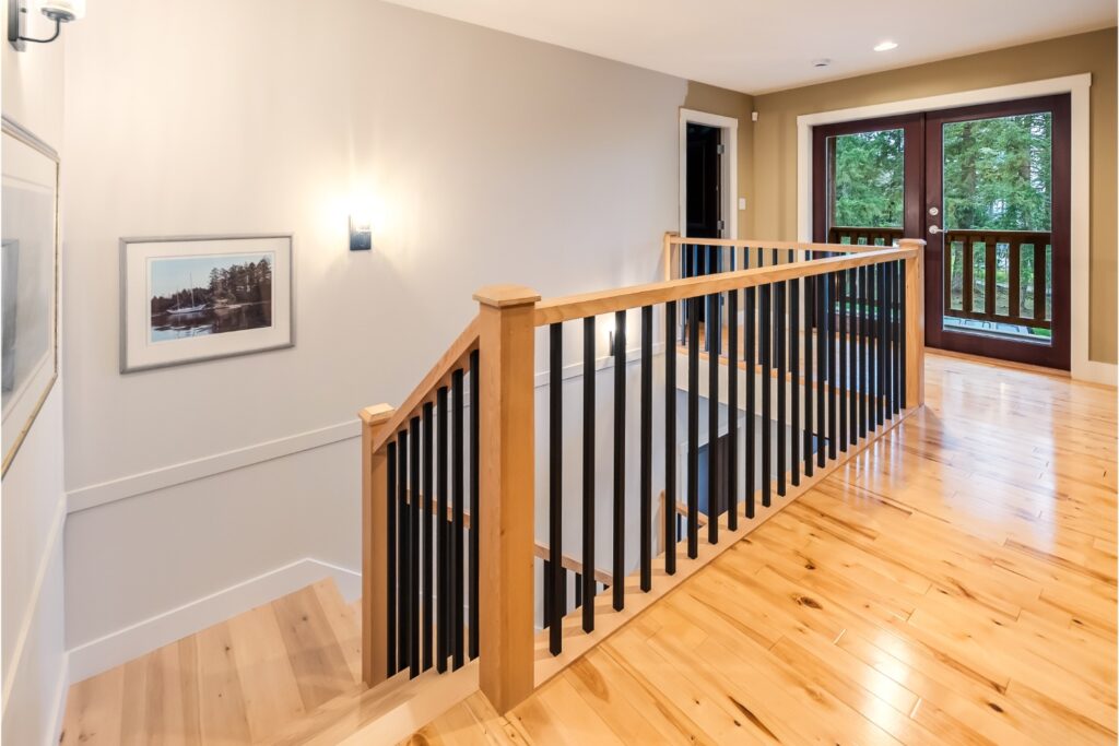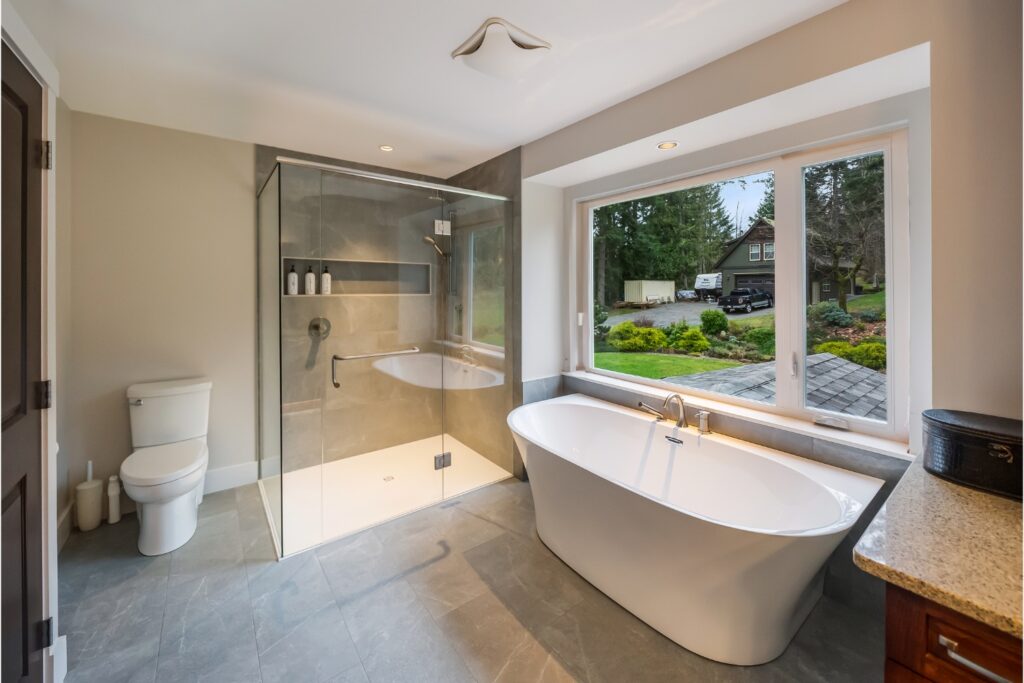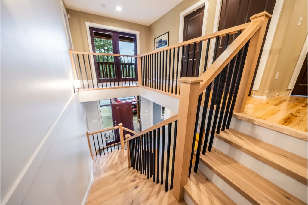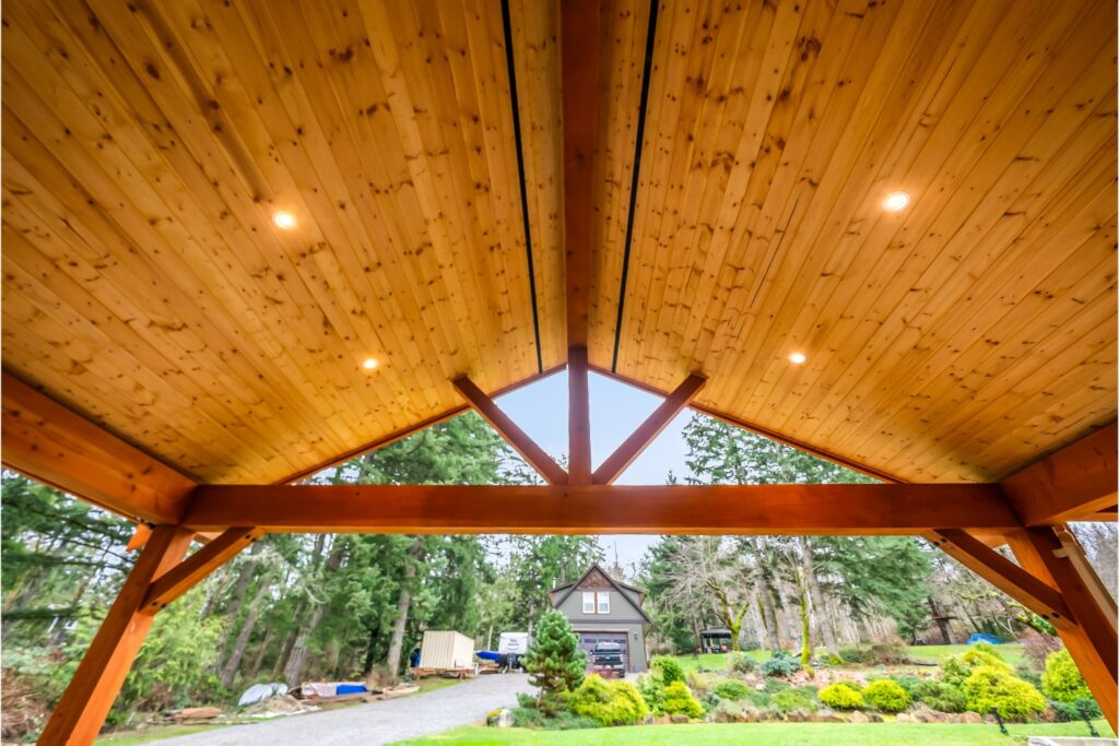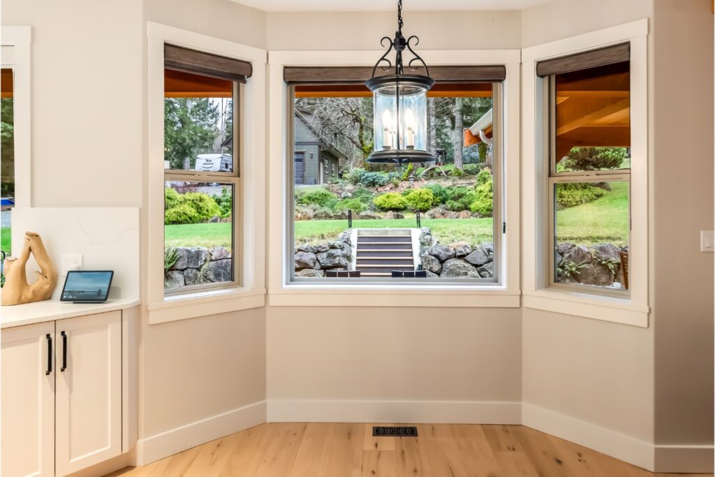 Outside, the backyard is a haven of relaxation. New windows and siding frame the expanded deck, which includes two timber-framed covered areas—a cozy dining nook and a vaulted space designed for family time around the firepit. The serene views of trees and expansive garden beds complete this outdoor retreat.