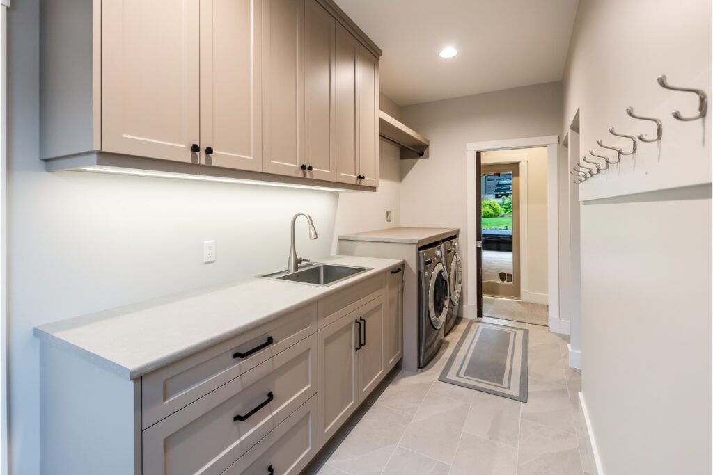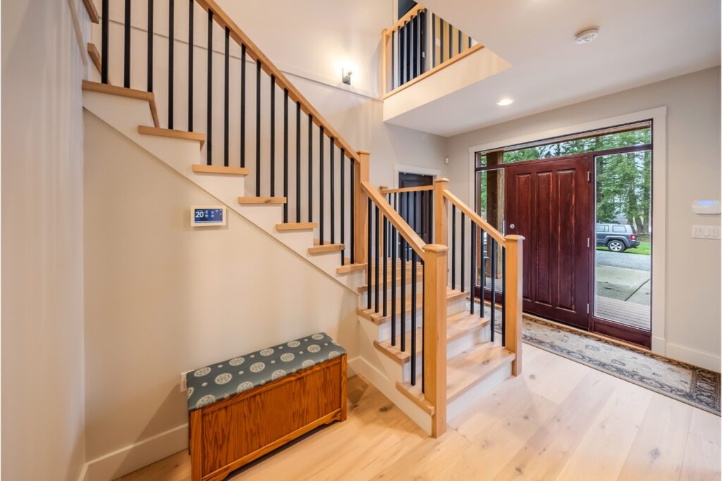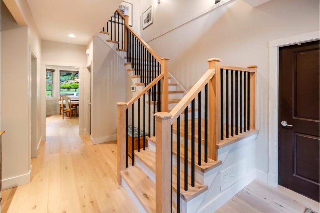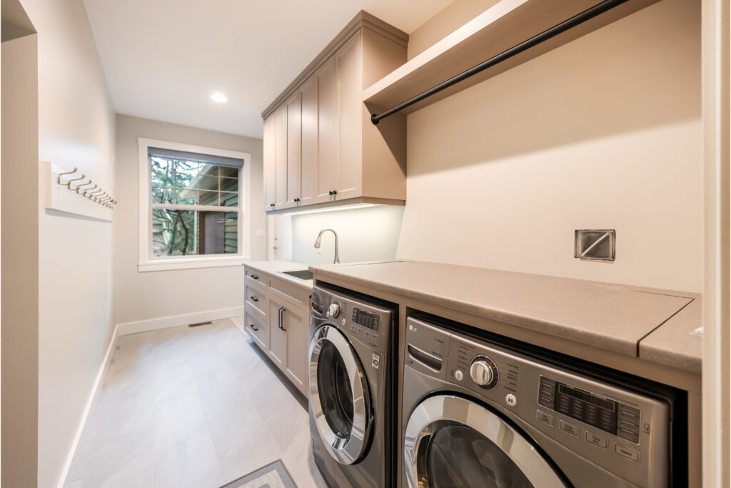 The master bathroom offers a spa-like experience with a luxurious freestanding tub and a beautifully designed shower space. Even the staircase has been revitalized, with existing newel posts refinished in a lighter, clear coat for a sleek yet traditional look. The laundry room matches the home’s refreshed style, featuring tile flooring, fresh paint, and custom cabinetry for a polished and practical space.