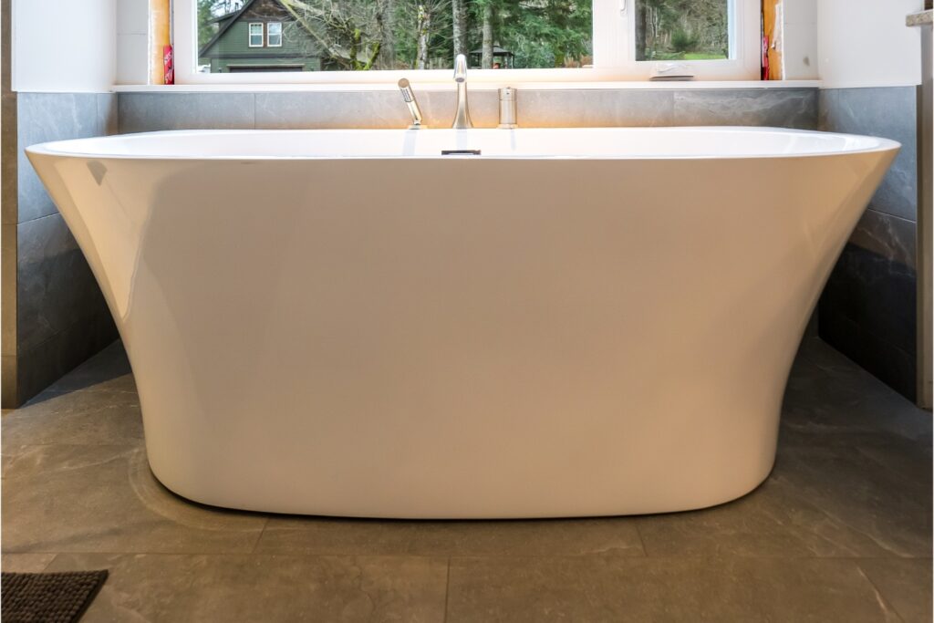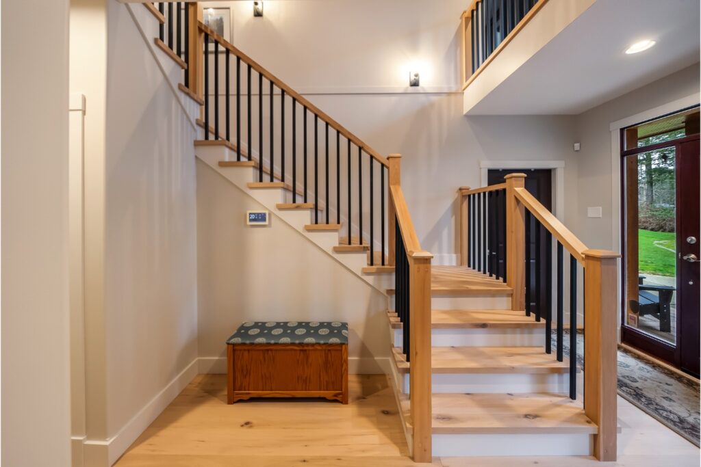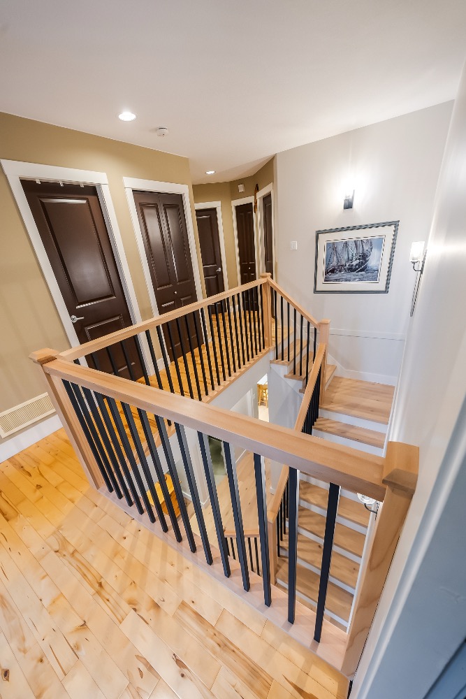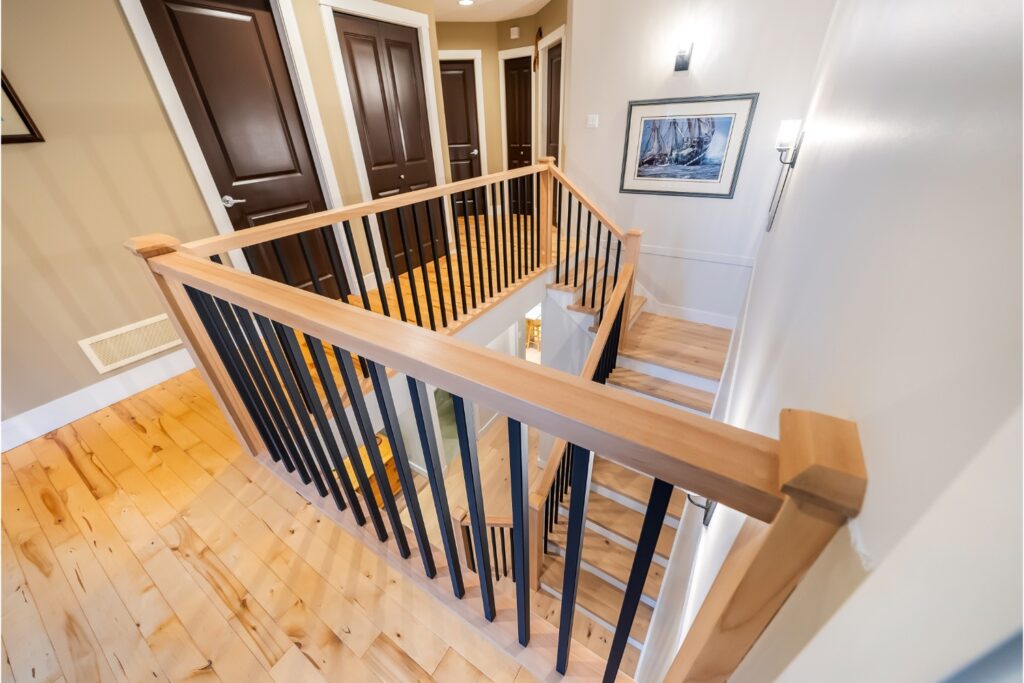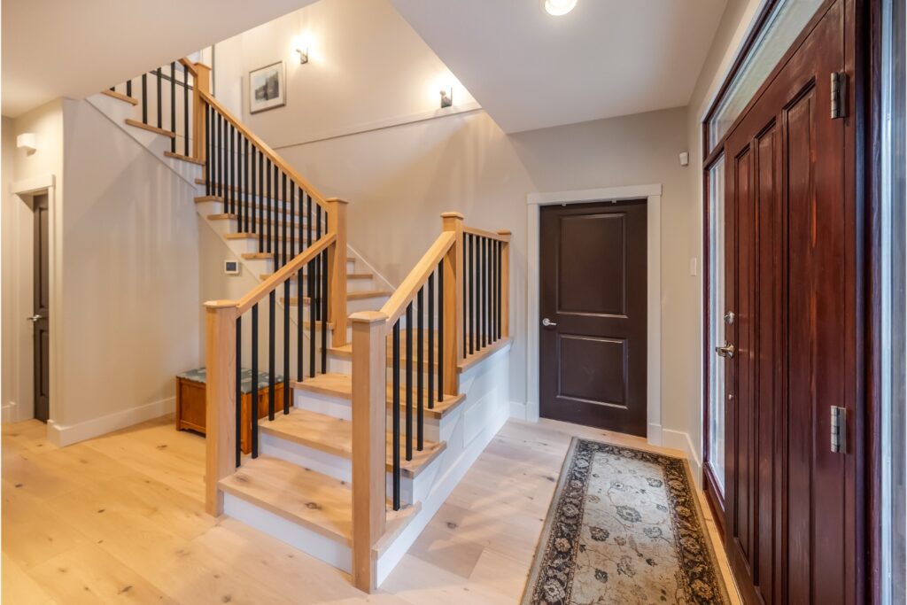 The master bathroom offers a spa-like experience with a luxurious freestanding tub and a beautifully designed shower space. Even the staircase has been revitalized, with existing newel posts refinished in a lighter, clear coat for a sleek yet traditional look. The laundry room matches the home’s refreshed style, featuring tile flooring, fresh paint, and custom cabinetry for a polished and practical space.
