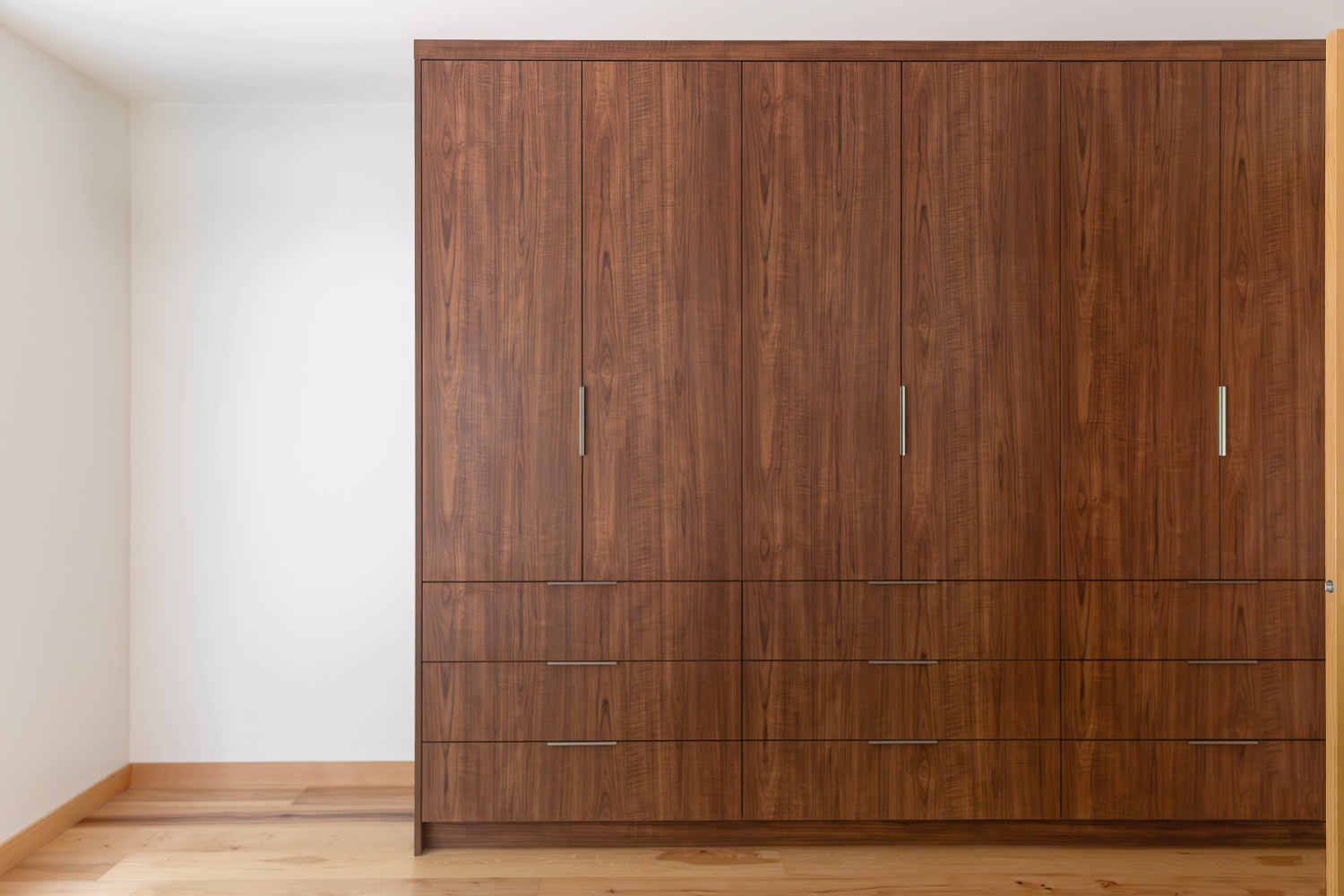 Grain-Matched Black Walnut Cabinet Fronts: Adds a sense of continuity and sophistication in cabinetry design.