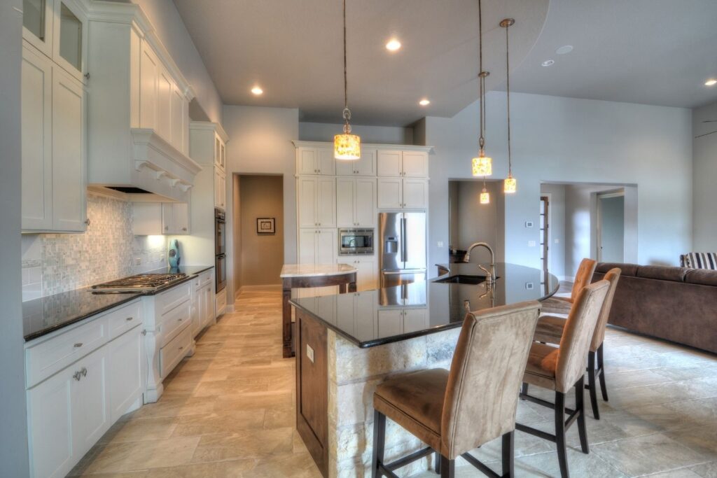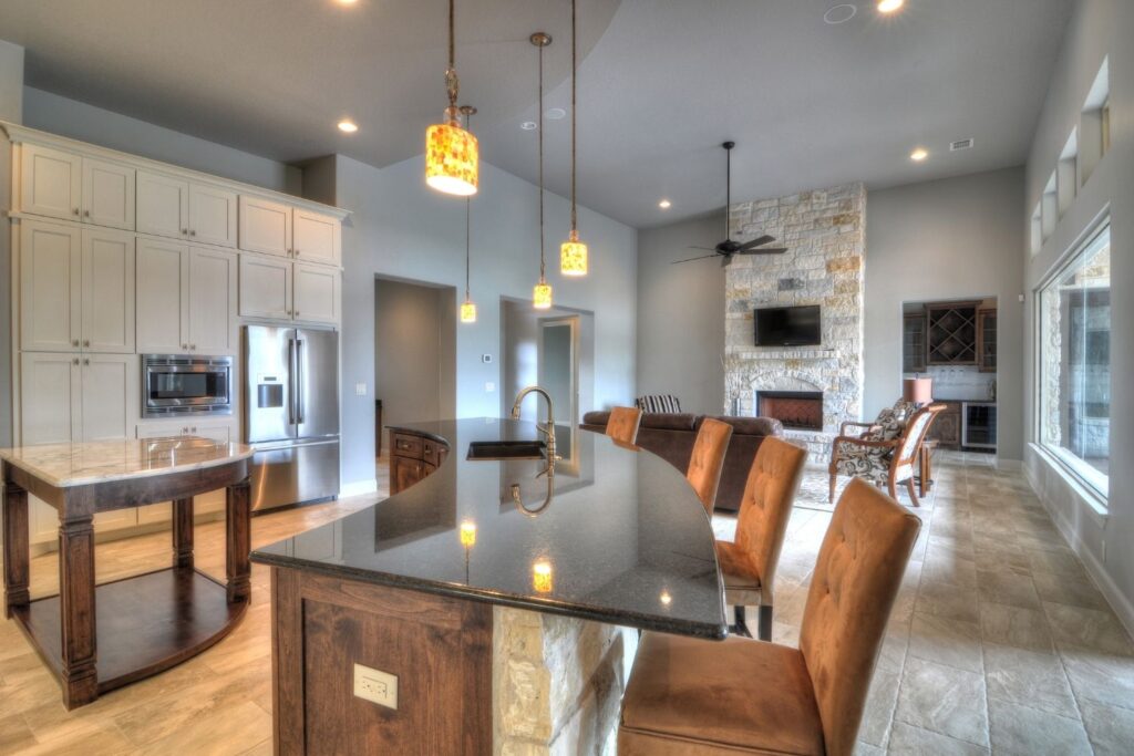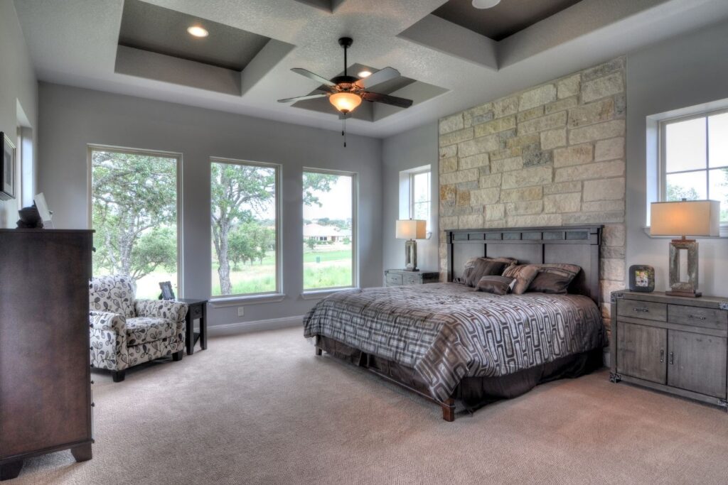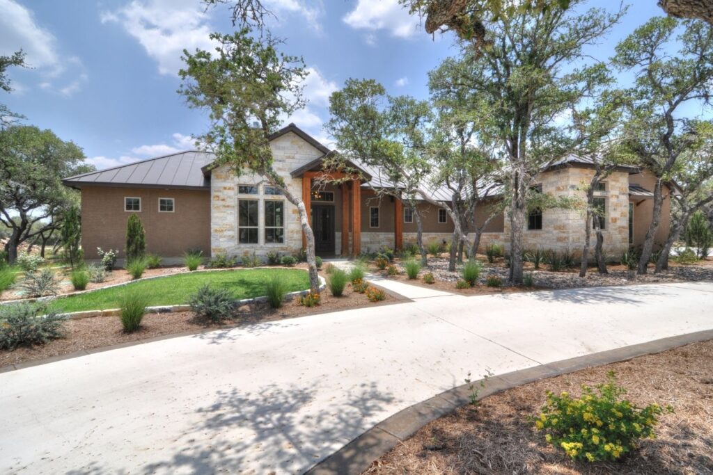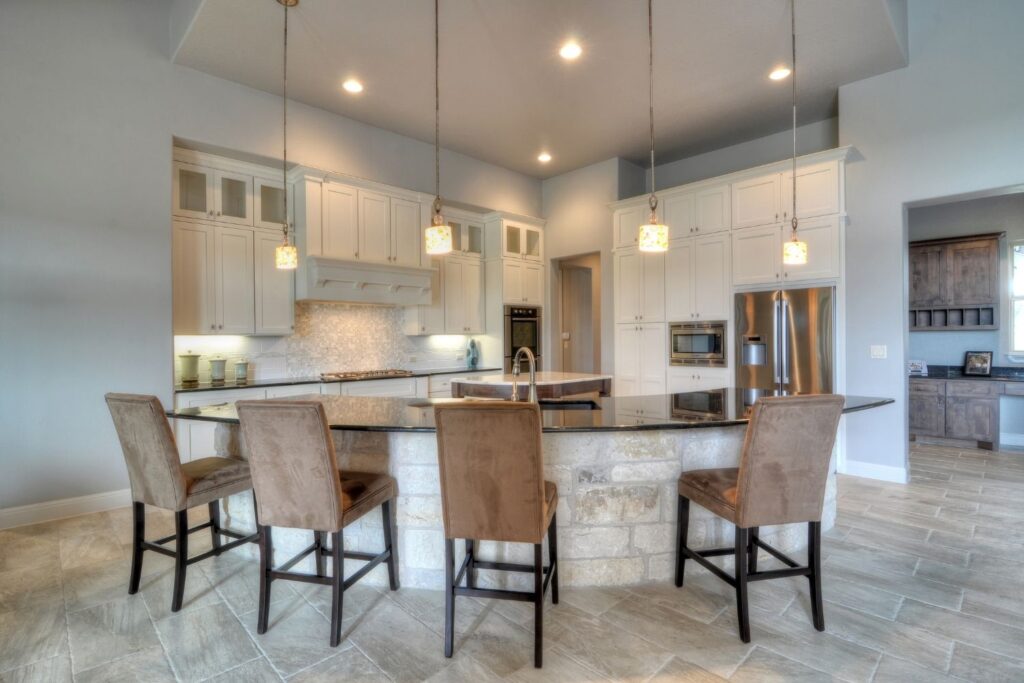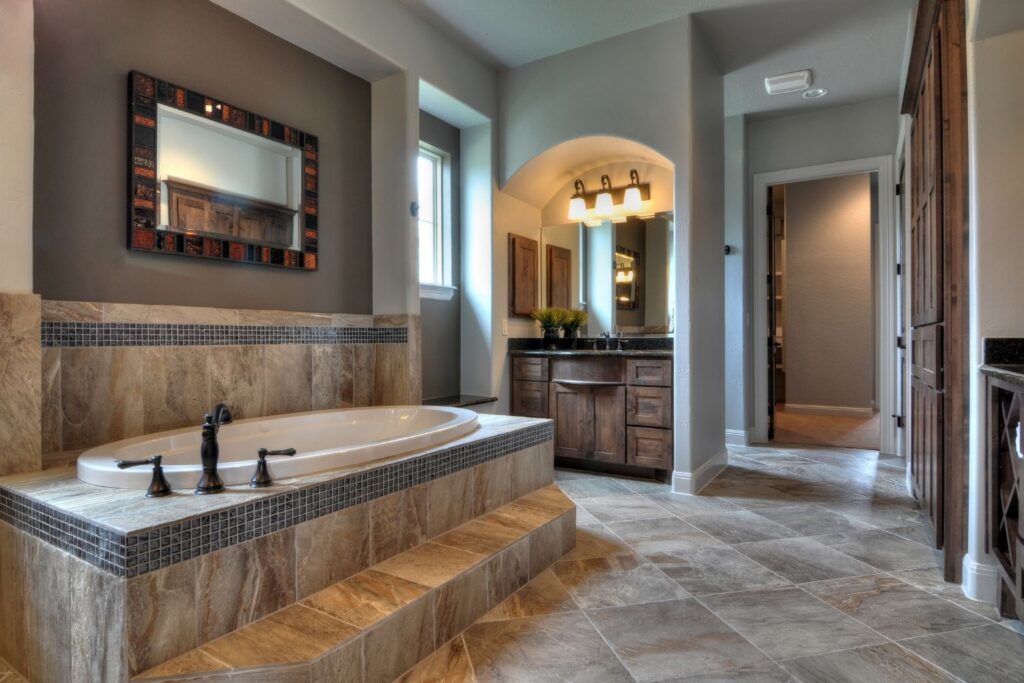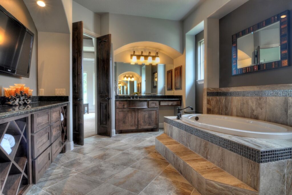 A modern traditional custom home featuring an open concept layout, custom cabinetry, stone accents, and a spa-like master bathroom.