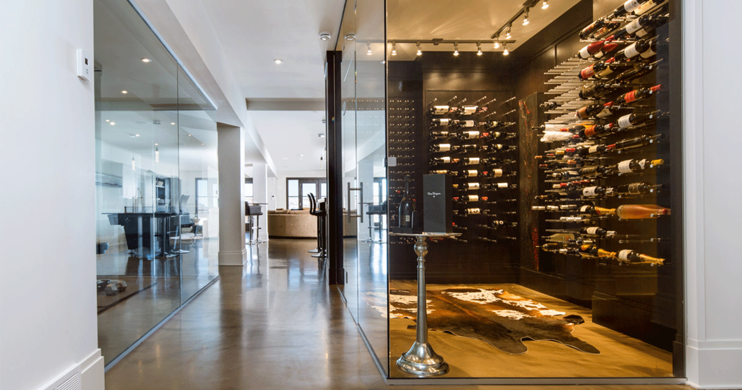If you are wondering how to maximize the extra basement space, consider building a wine cellar. Wine cellars benefit from the cool and dark conditions in the basement. One homeowner took it to the next level by lighting it with designer LEDs and installing a UV-resistant glass ceiling. Above, guests in the living area enjoy both the wine and the unique view below.