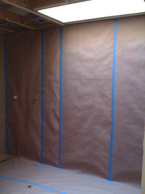 - Then roll out and cover the entire surface in Ram Board (a thick cardboard-like product that can be cut easily with a utility knife), connecting the board to the painters tape and to itself with sheathing tape (a red tape with a very strong adhesive; used to seal vapour barrier). I like this tape as it’s quite sticky and will stay adhered while not allowing in dust. Keep in mind that it isn’t a good idea to forgo the painters tape as the adhesive on the sheathing tape is so strong it could damage many floor finishes.