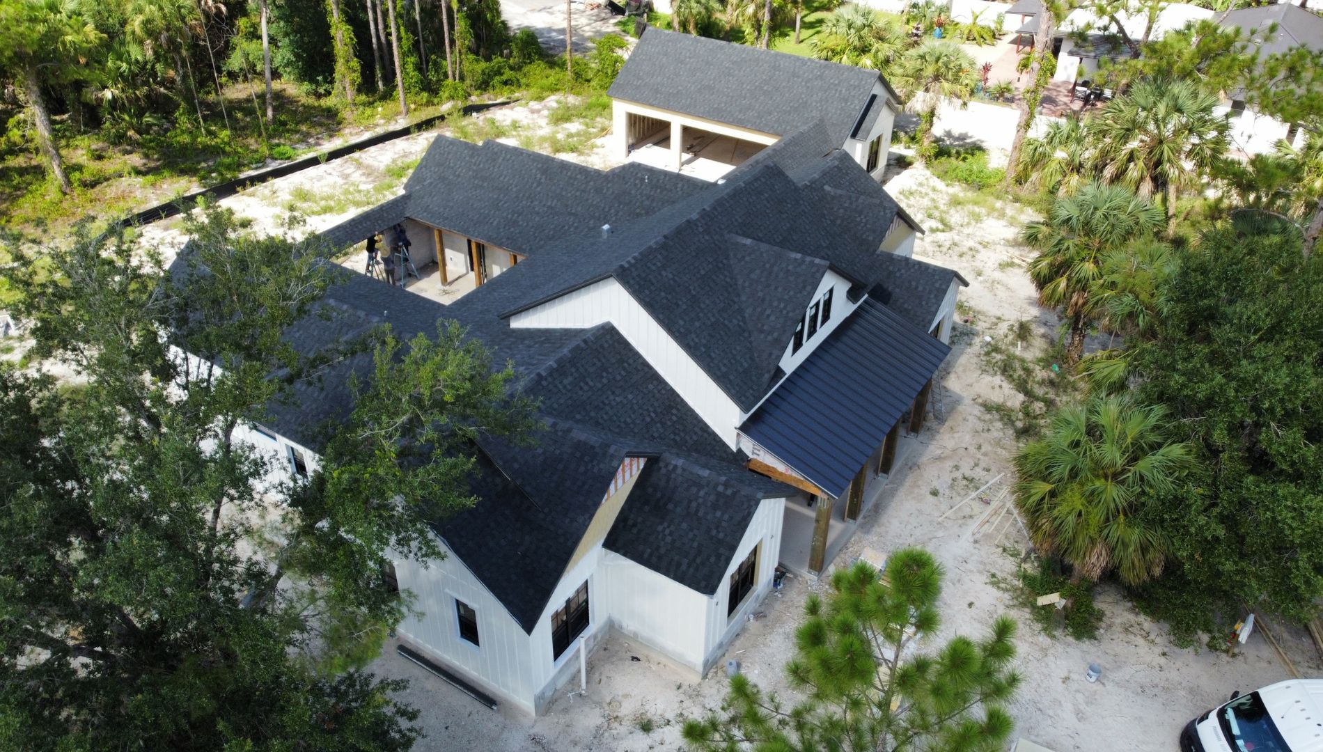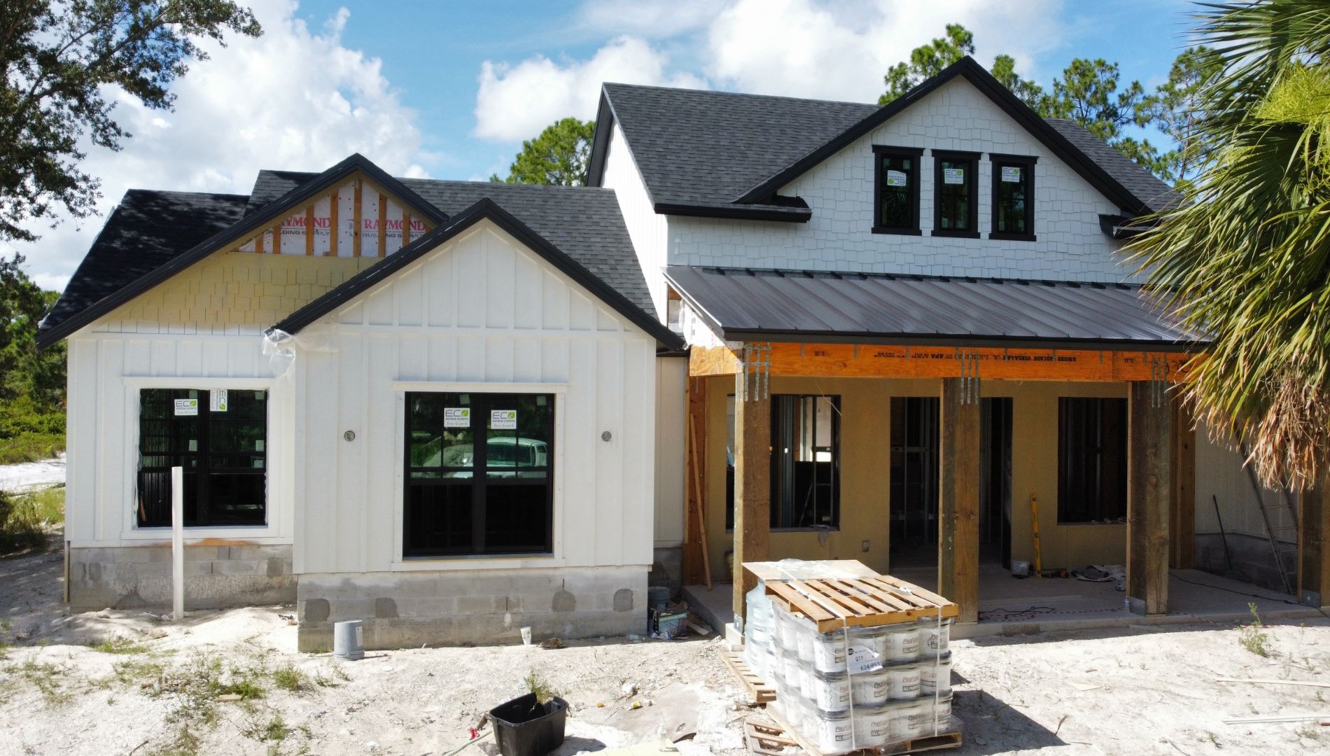 The exterior of this Golden Gate Estates home is equally impressive as its interior. Painted in Sherman Williams’ Alabaster with accents of Iron Ore, the home features a striking combination of Hardie Board & Batten siding, smooth stucco, and a standing seam metal roof over the entryway. Furthermore, the front entrance, framed by matte black gutters and rustic black roof shingles, leads to a grand entryway adorned with soon-to-be herringbone pavers that perfectly complement the home’s modern and rustic design elements.