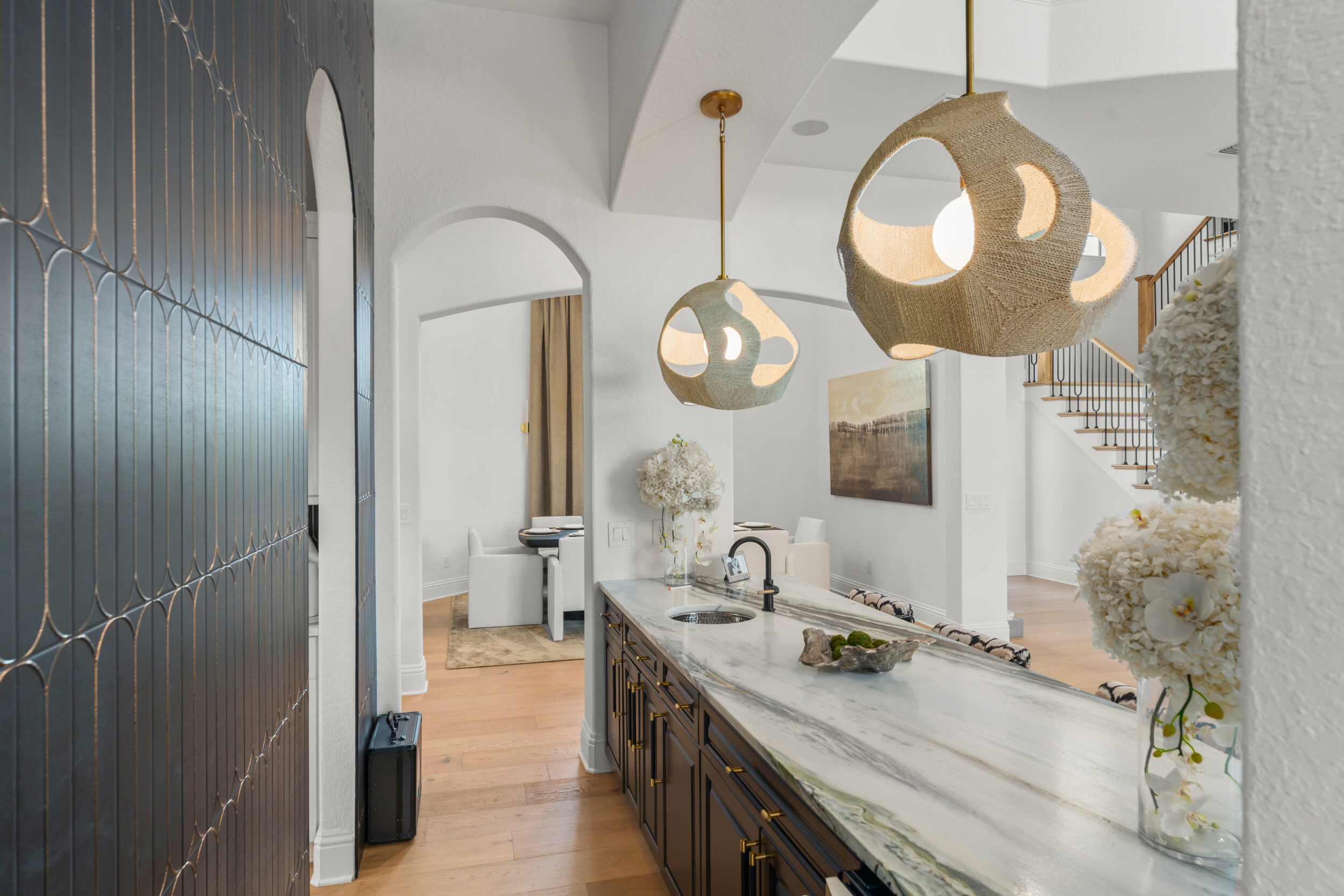 Warm wood flooring, a neutral palette, and designer lighting bring balance and sophistication, while high-end finishes, including Cosentino stone, custom cabinetry, JennAir appliances, SubZero refrigeration, and Kohler bath hardware. Thoughtfully designed for both family living and entertaining, this renovation reflects contemporary and refined comfort in the heart of Orlando.