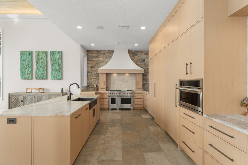 This Central Florida remodel brings the outdoors in through warm wood tones, natural materials, and light-filled living spaces designed to feel open and inviting. The kitchen is anchored by Sub-Zero refrigeration and a Wolf cooktop, blending high-performance function with a clean, timeless look.