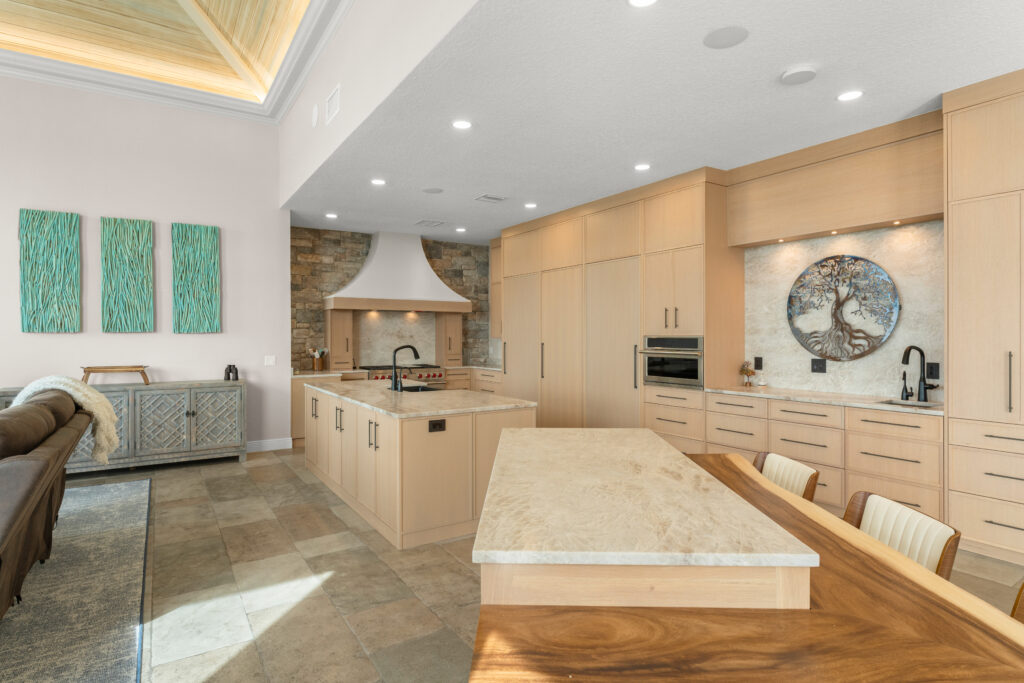 In the living area, a sculptural, Chihuly-inspired chandelier adds visual interest bringing color and texture into the space. Throughout the home, wood and natural elements create a seamless connection to Florida’s surroundings, resulting in interiors that feel relaxed, intentional, and effortlessly livable.