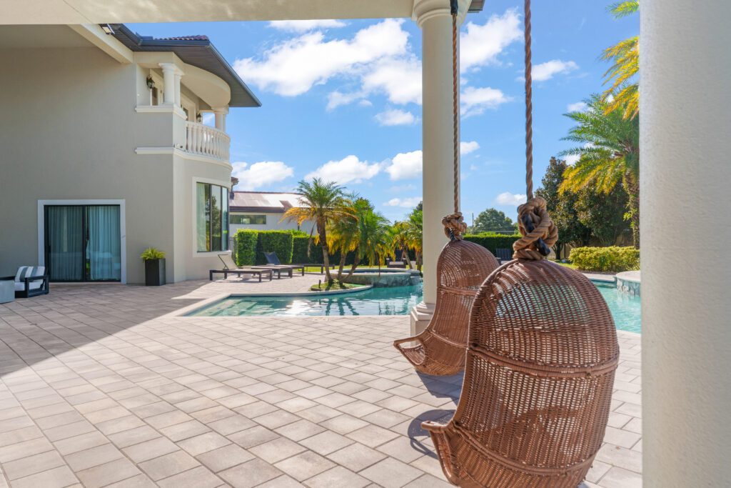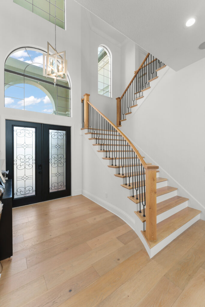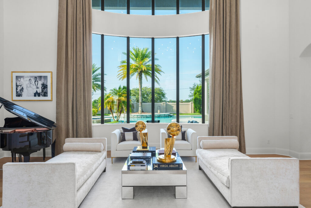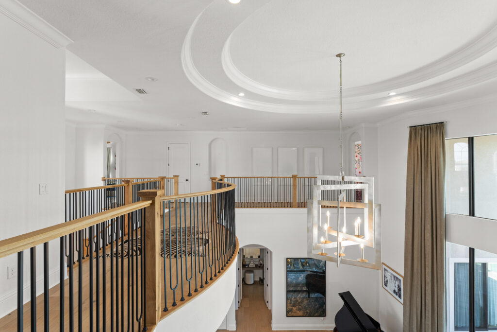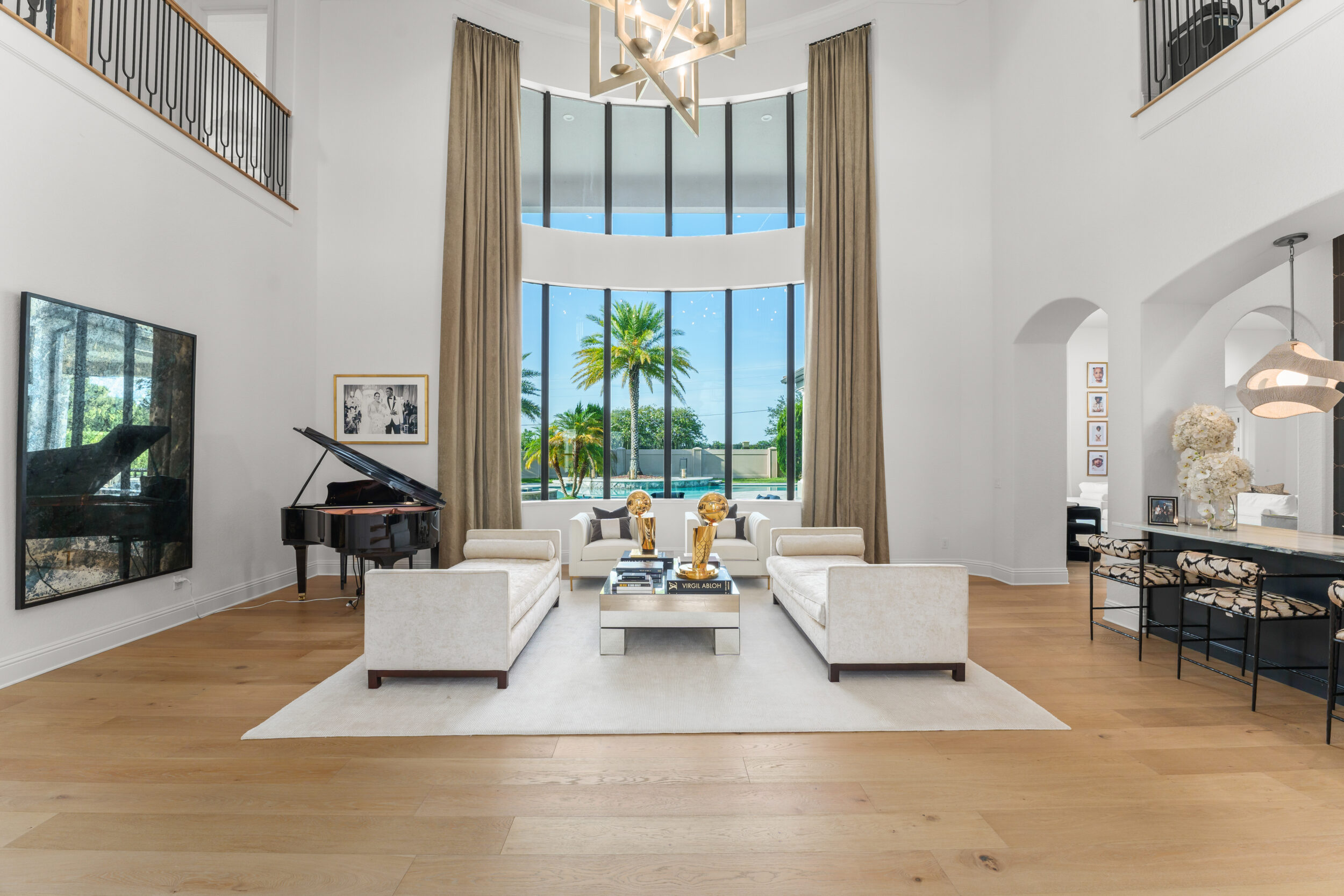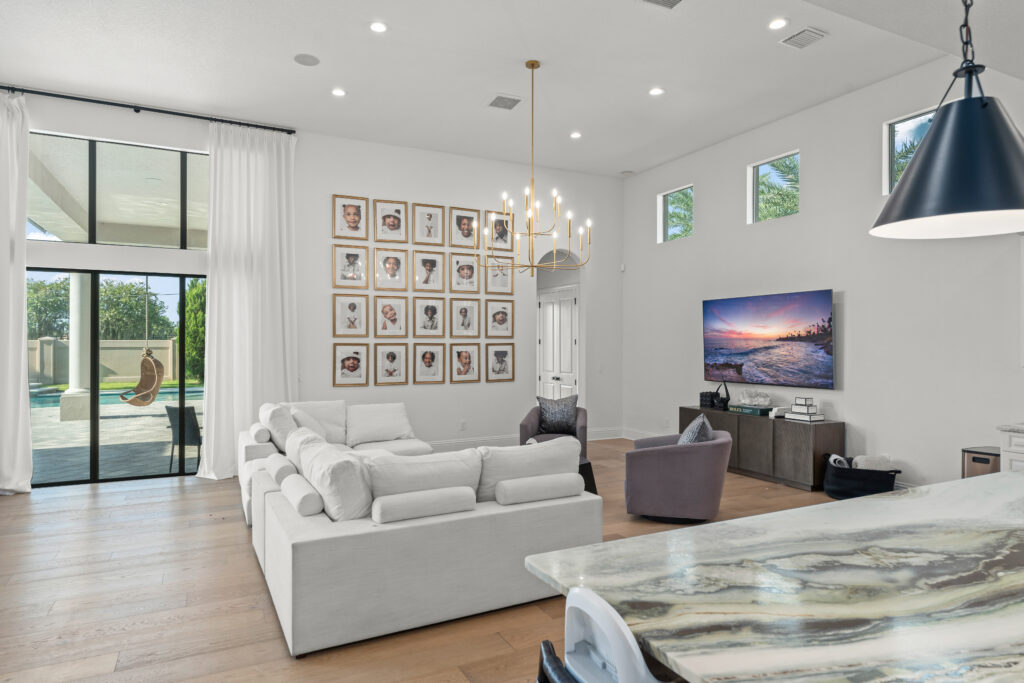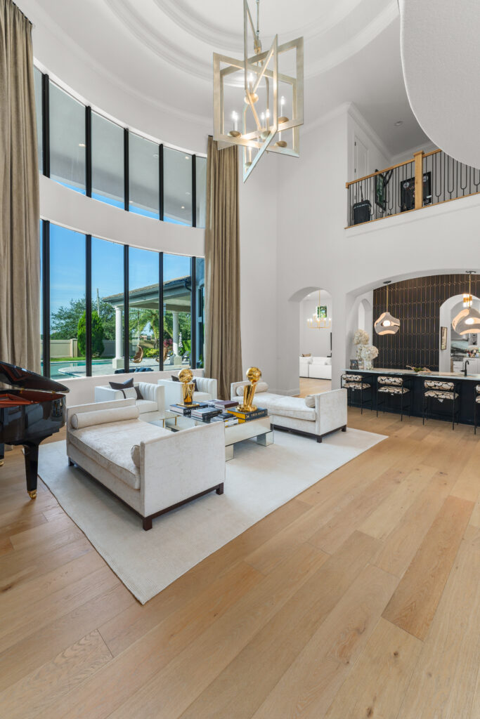 This modern Central Florida residence is defined by double-height living spaces and an abundance of natural light. A beautiful two-story living room with an expansive floor-to-ceiling window wall creates a bright, gallery-style interior that seamlessly connects indoor and outdoor living.