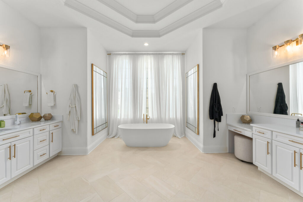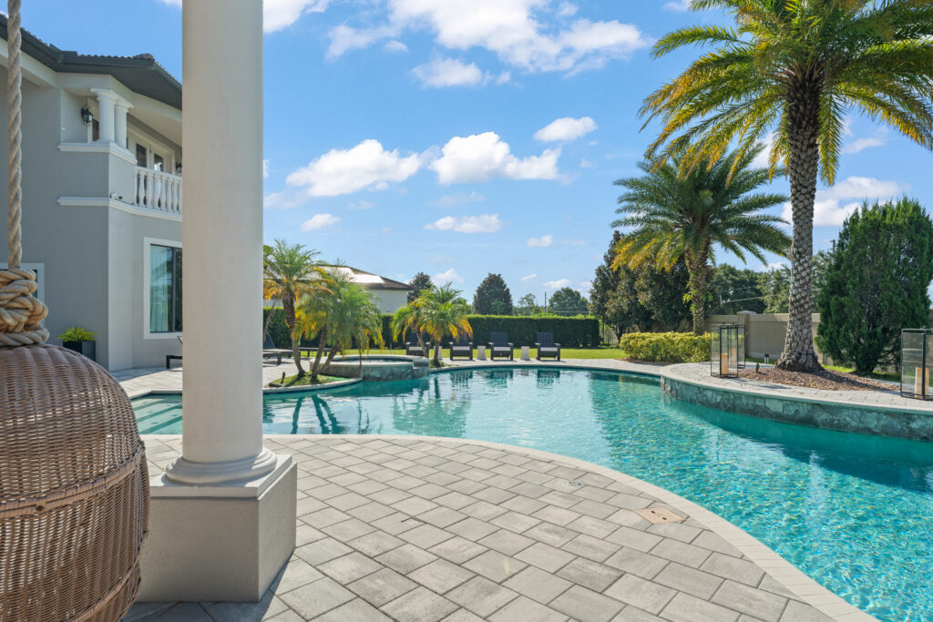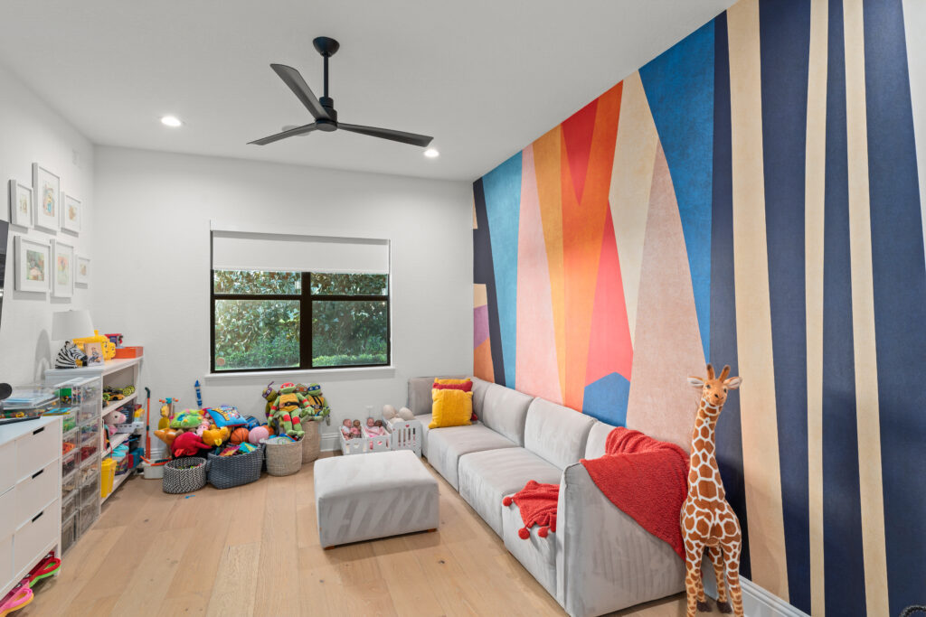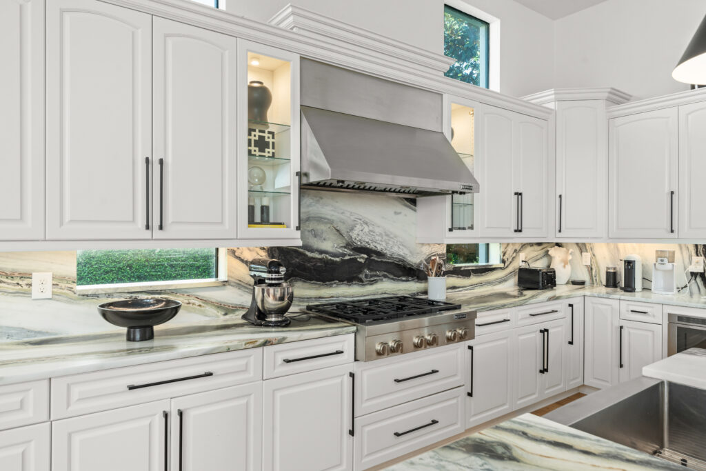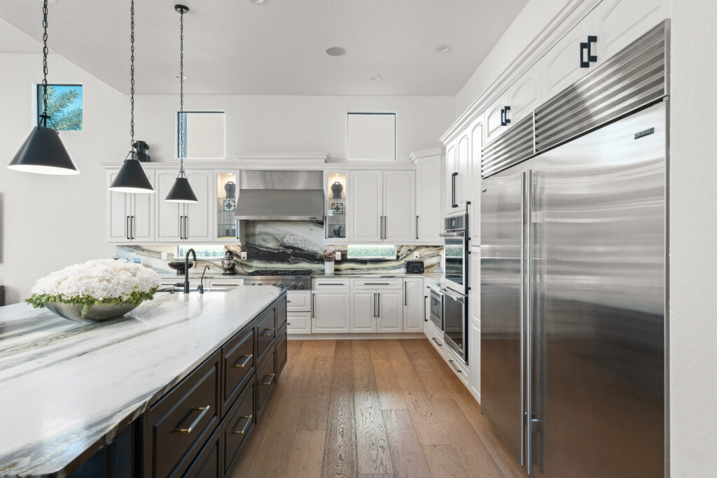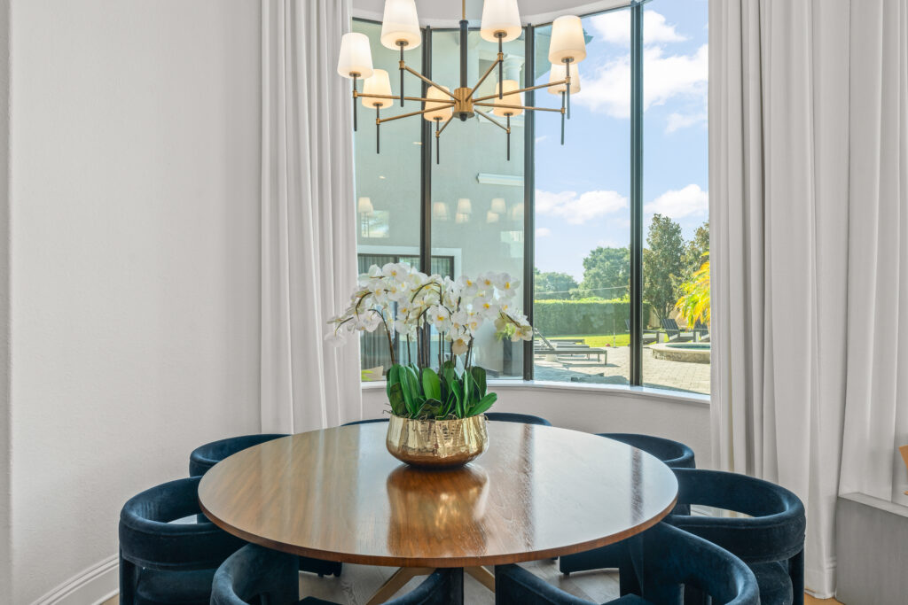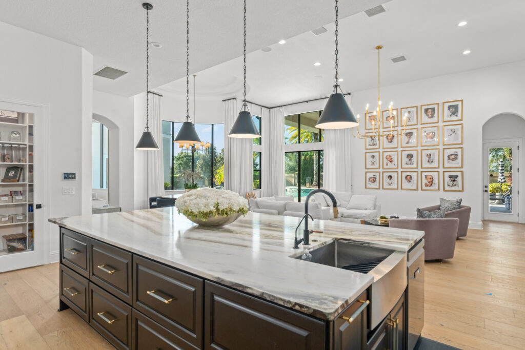 Warm wood flooring, a neutral palette, and designer lighting bring balance and sophistication, while high-end finishes, including Cosentino stone, custom cabinetry, JennAir appliances, SubZero refrigeration, and Kohler bath hardware. Thoughtfully designed for both family living and entertaining, this renovation reflects contemporary and refined comfort in the heart of Orlando.