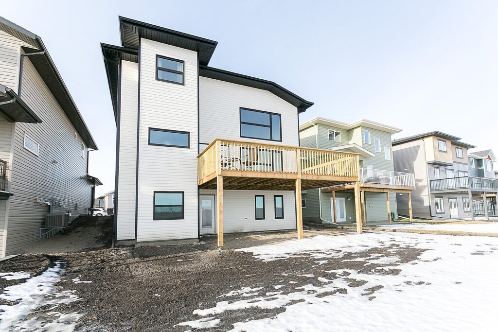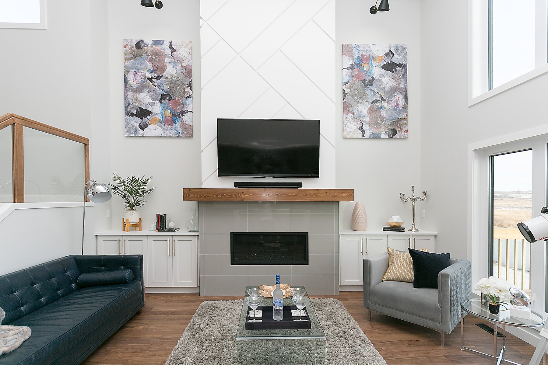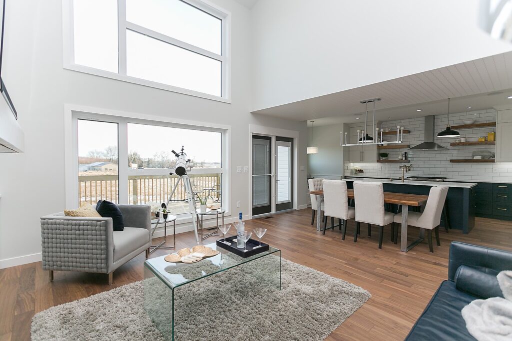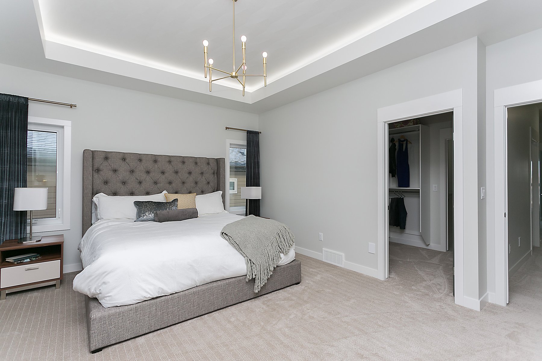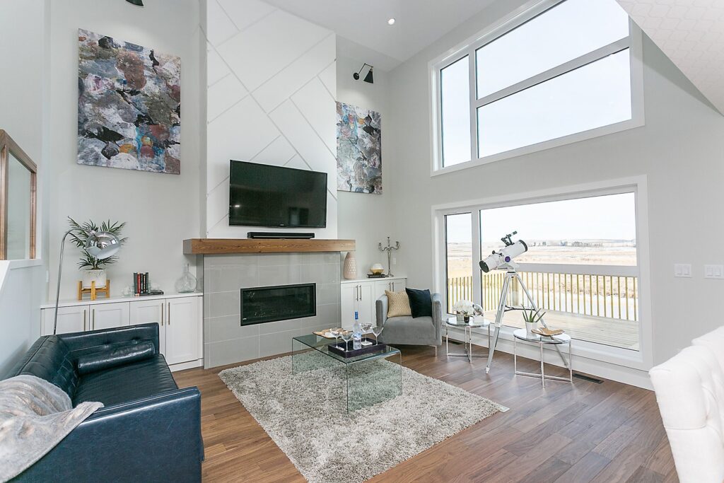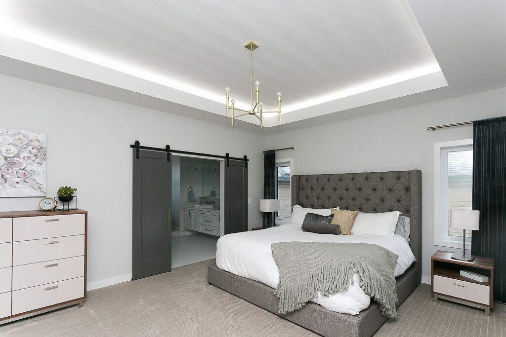 This modern custom home features a spacious open concept main floor with hardwood floors, large windows, and high ceilings. The master suite features a recessed ceiling, walk-in closet, sliding doors, and spa-like master bathroom.