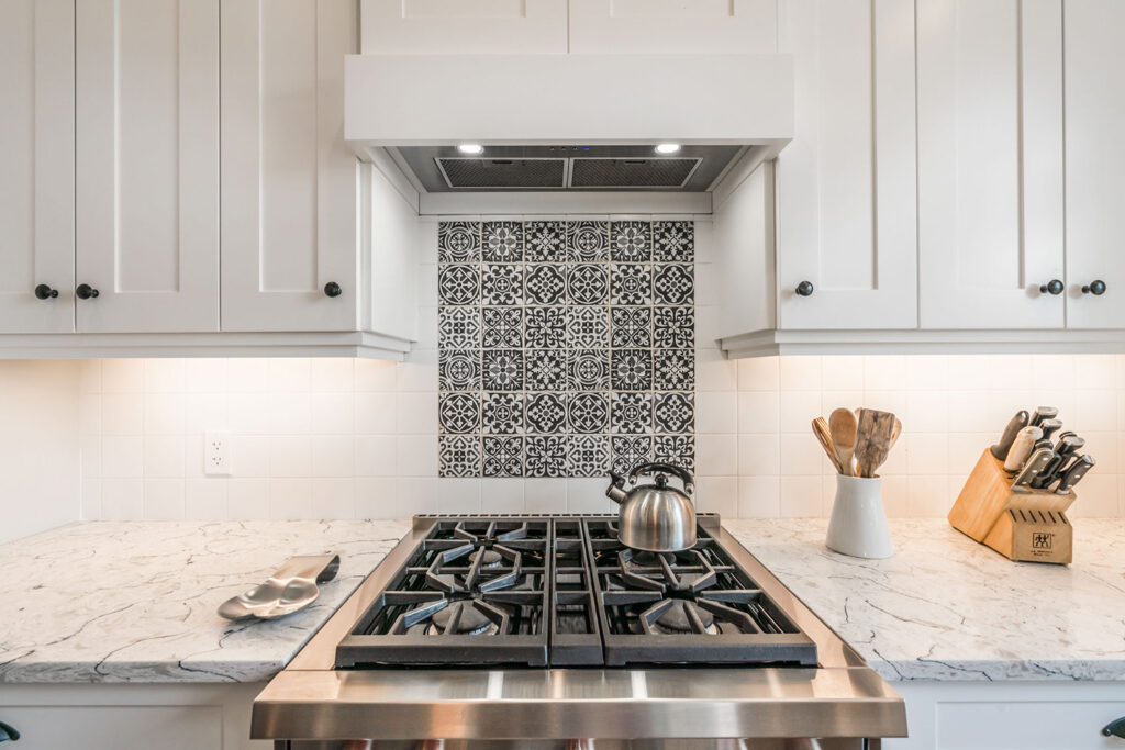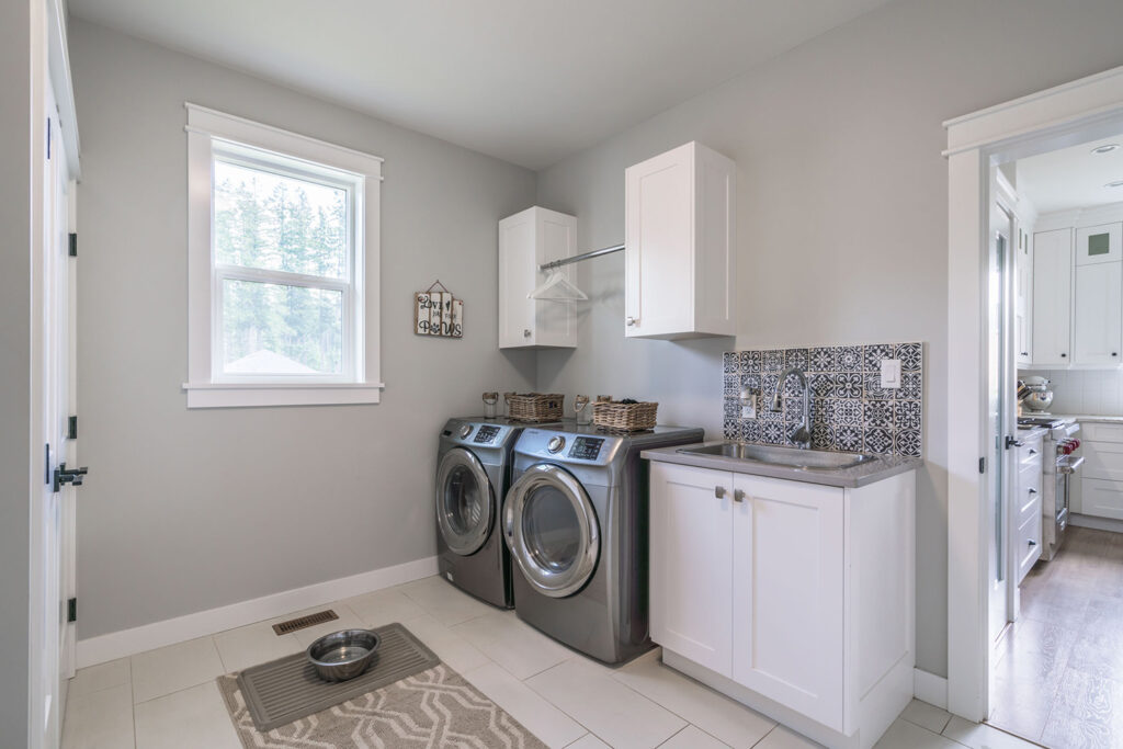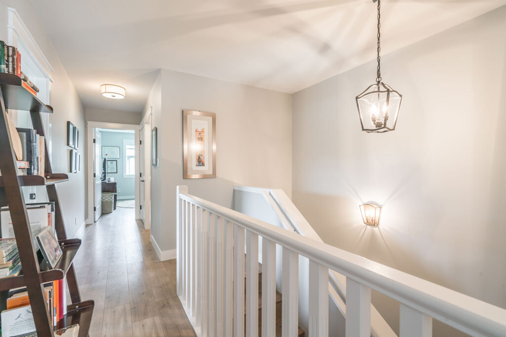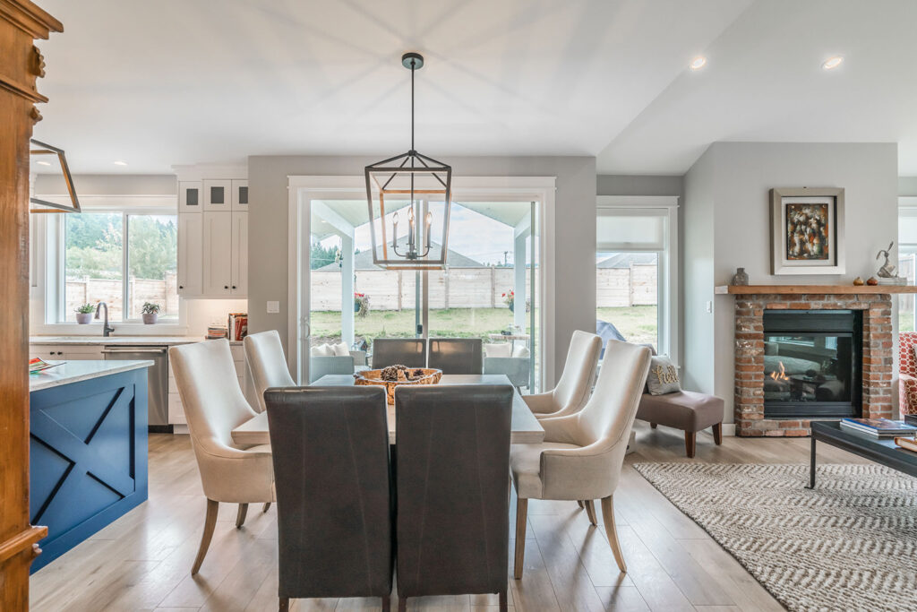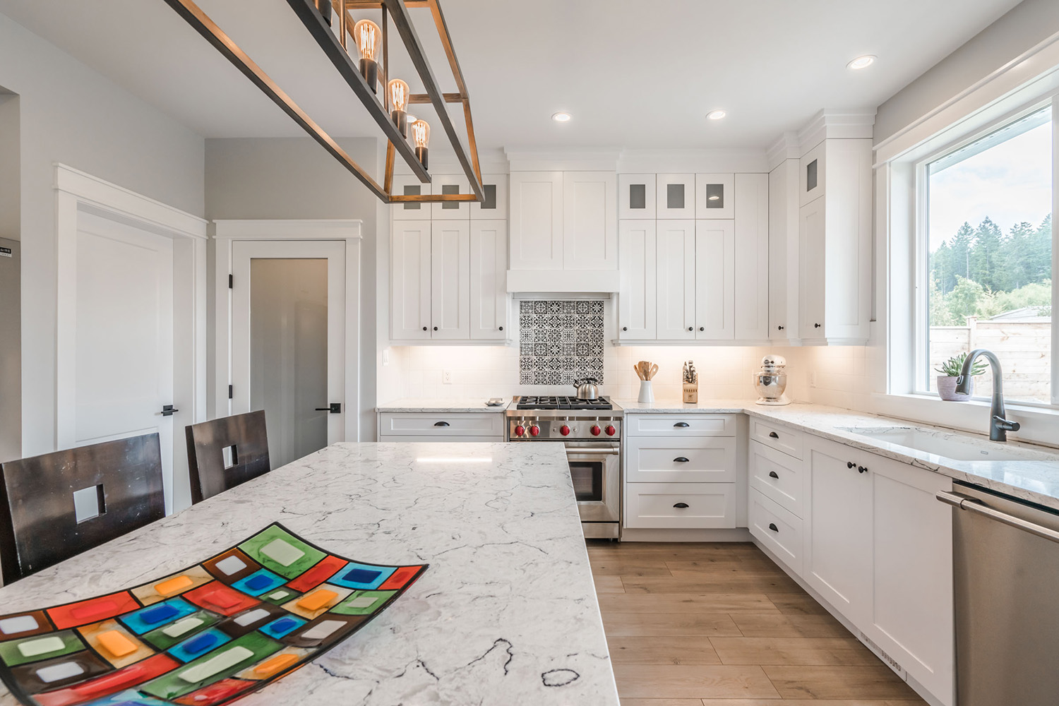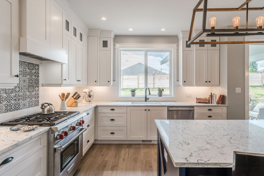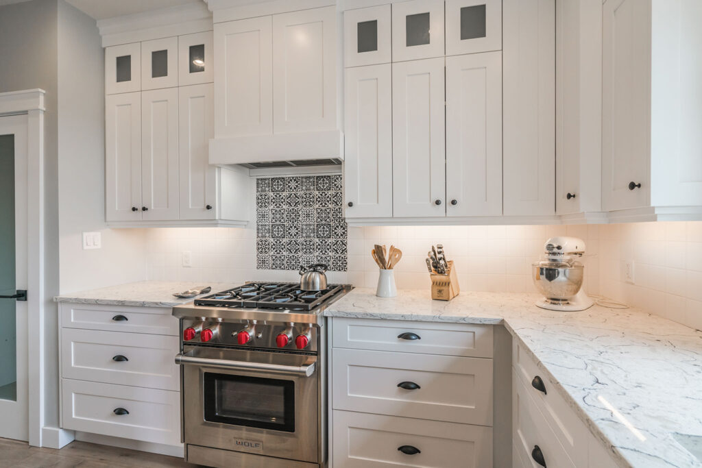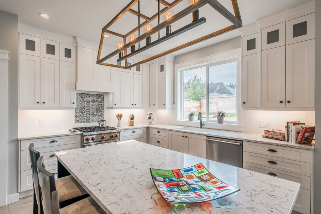 This custom 2-storey family home features a bright, modern kitchen with custom cabinetry, multi-purpose kitchen island, hardwood flooring, and a gorgeous tile backsplash.