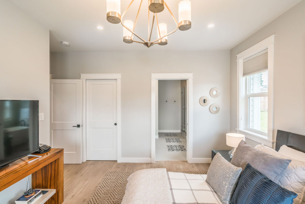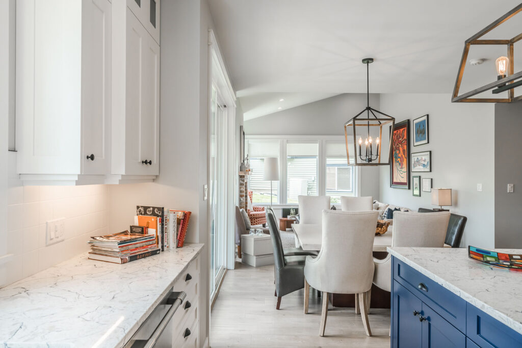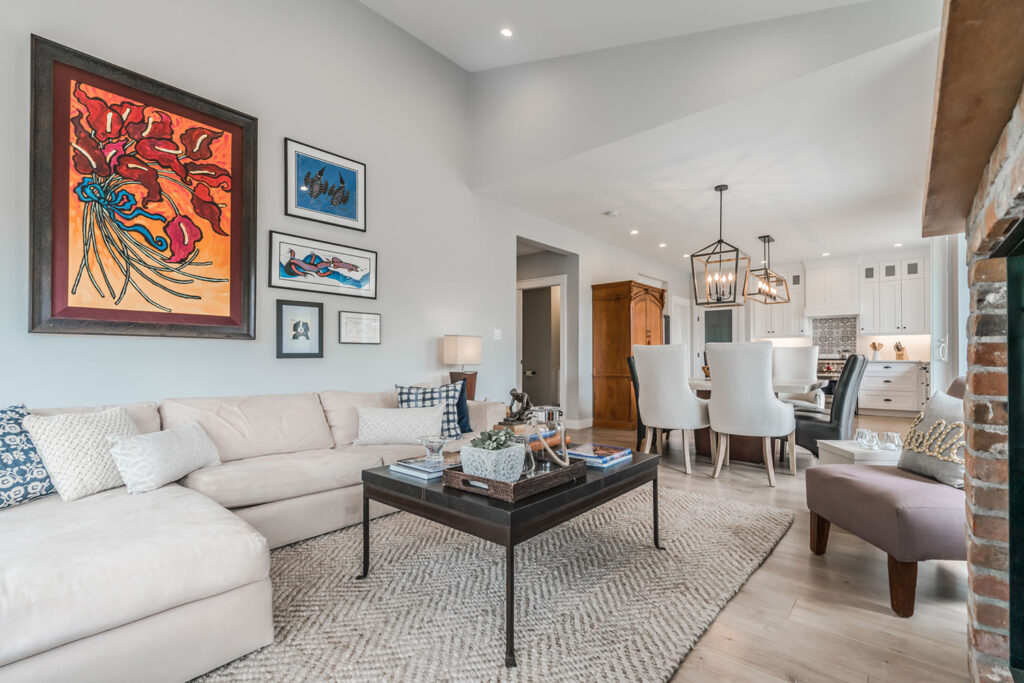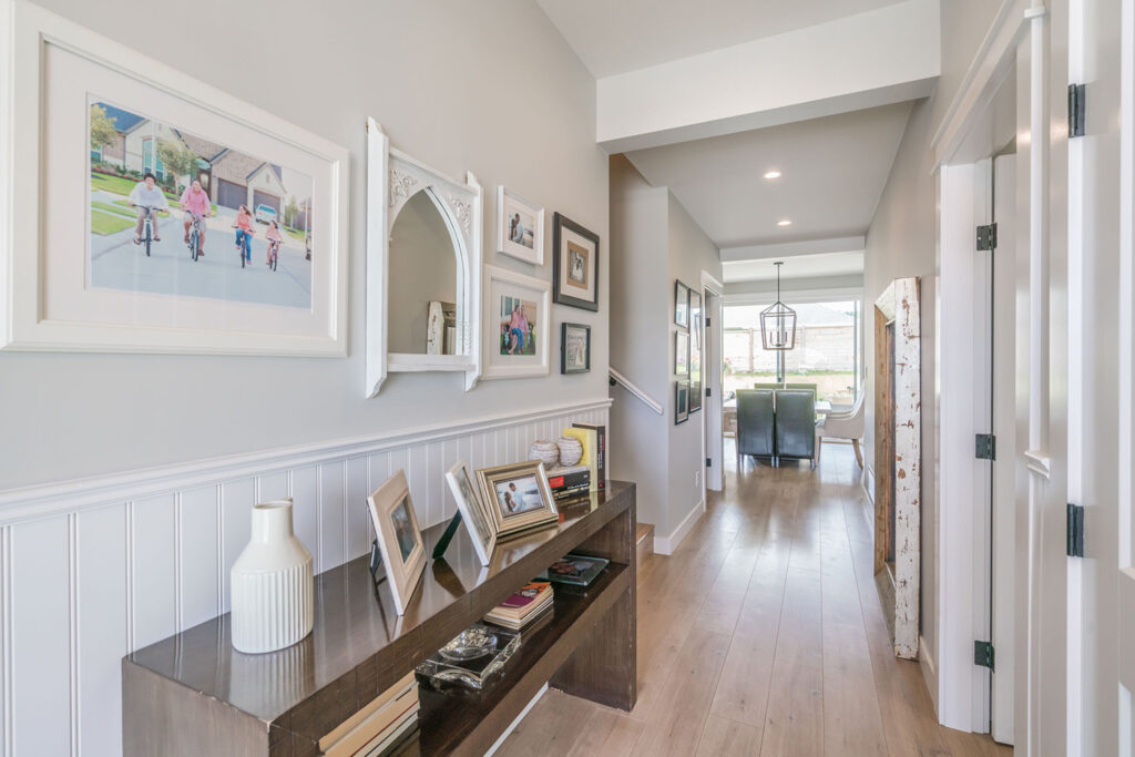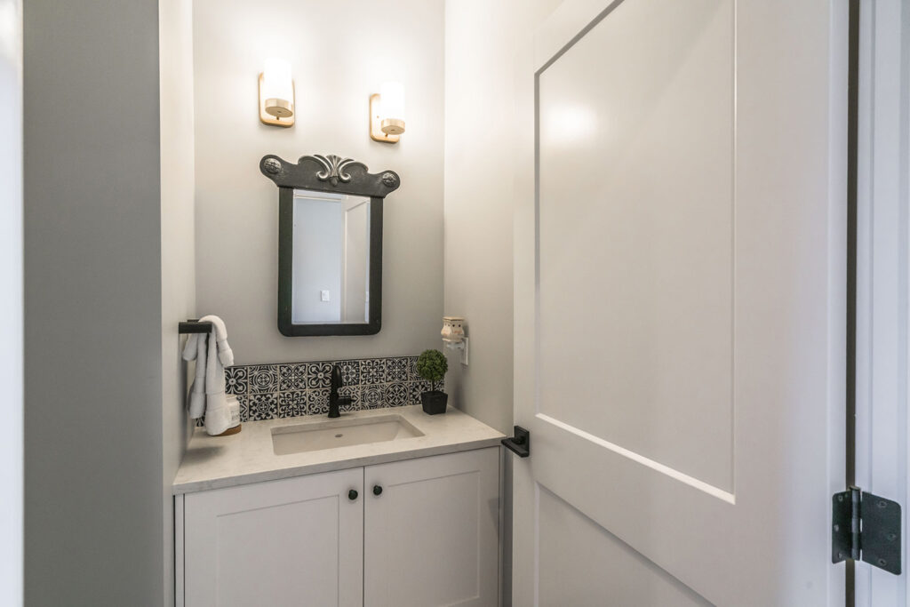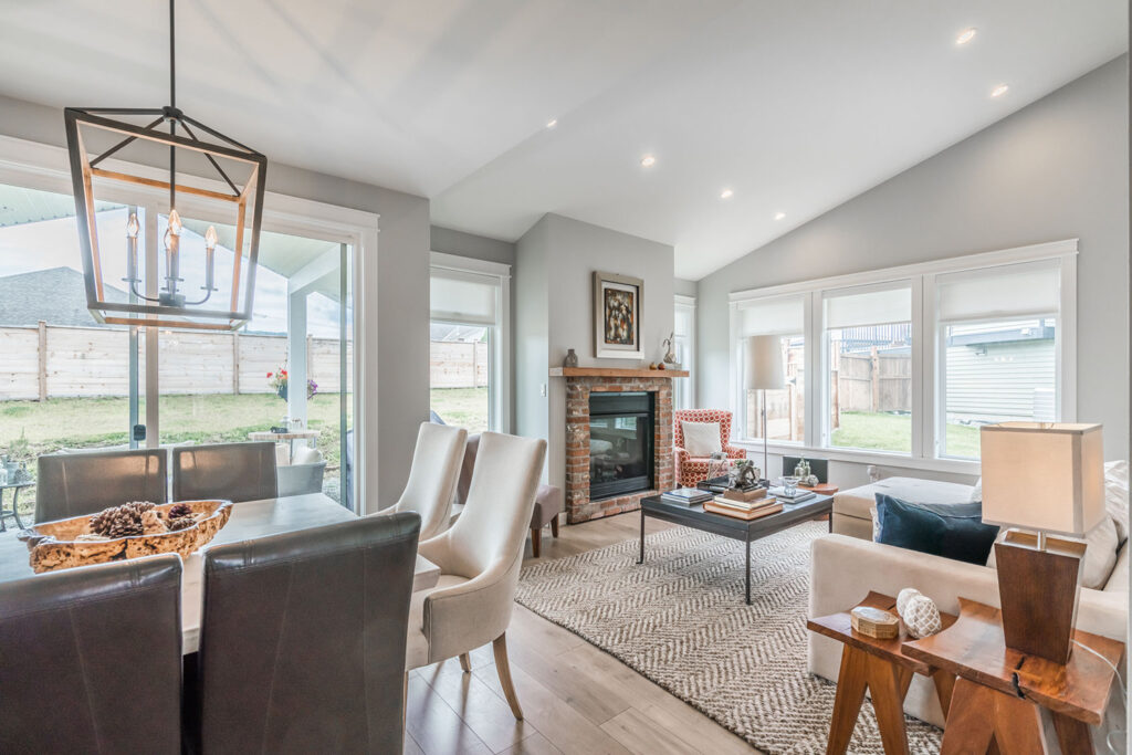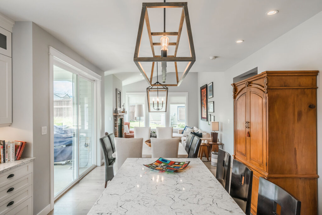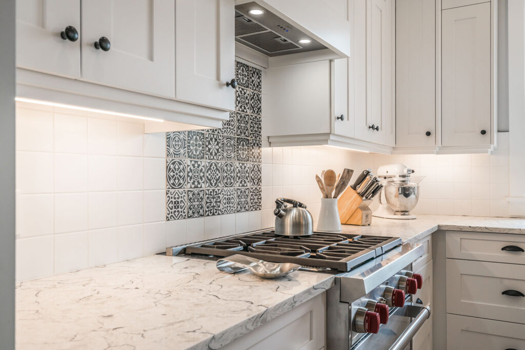 This custom 2-storey family home features a bright, modern kitchen with custom cabinetry, multi-purpose kitchen island, hardwood flooring, and a gorgeous tile backsplash.