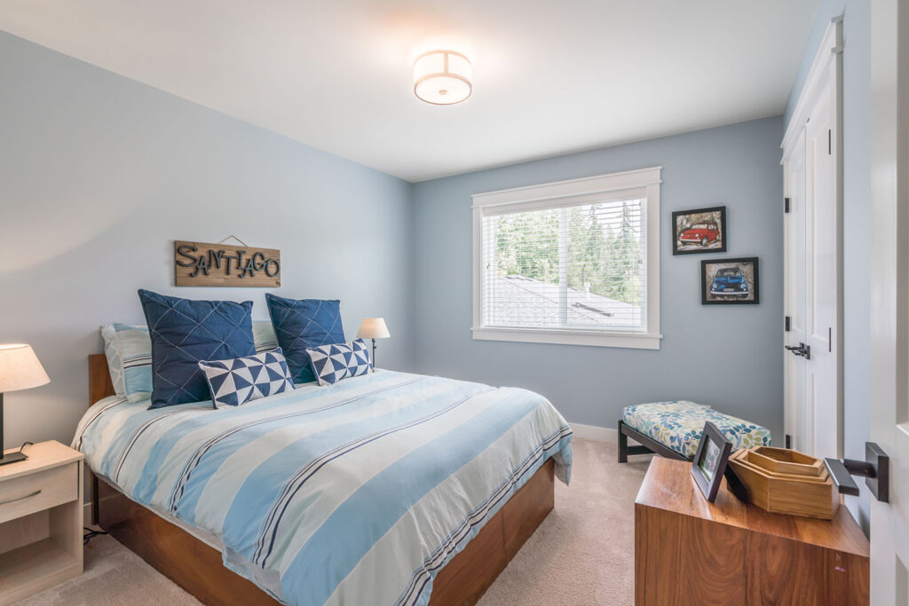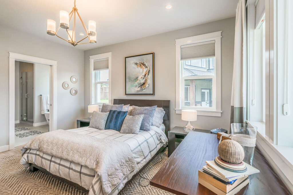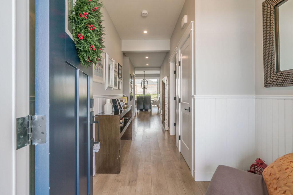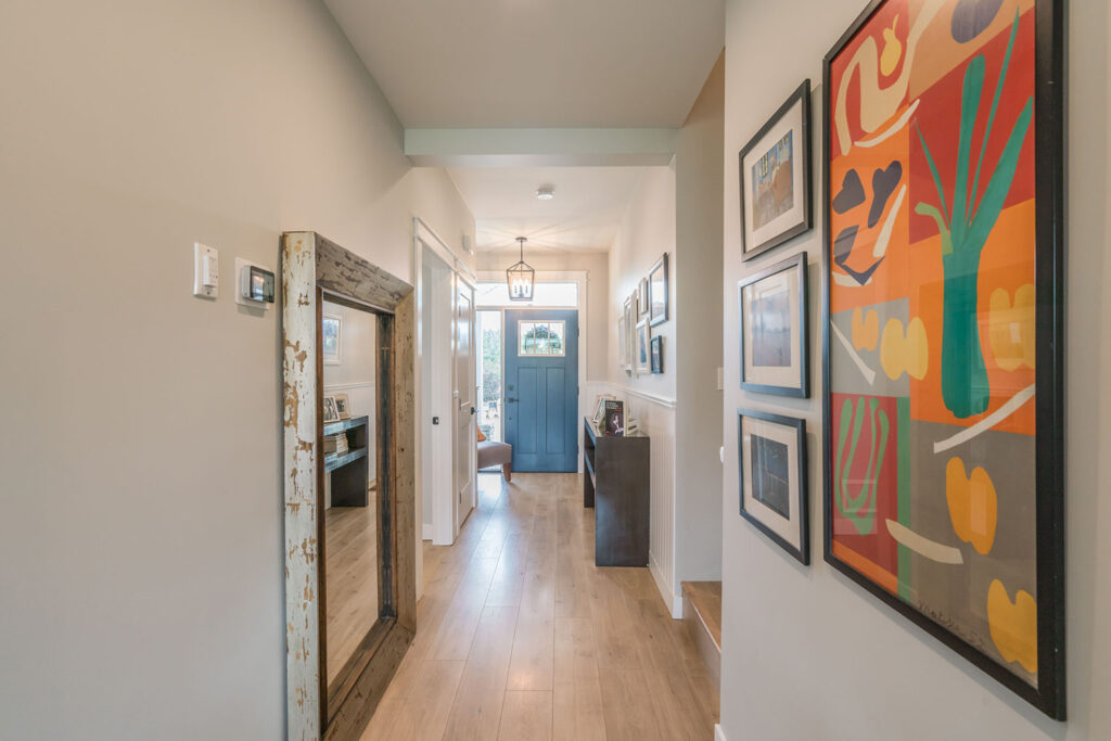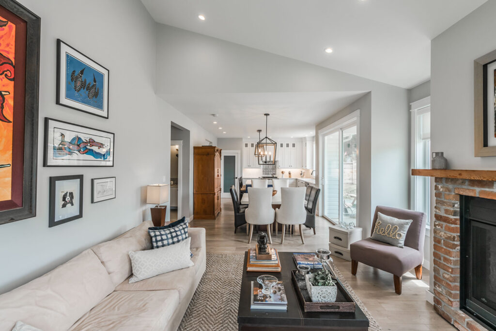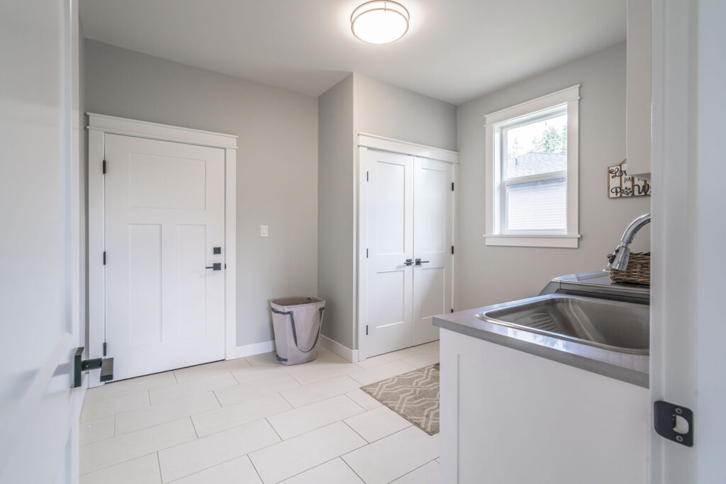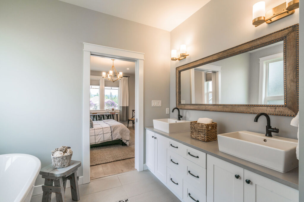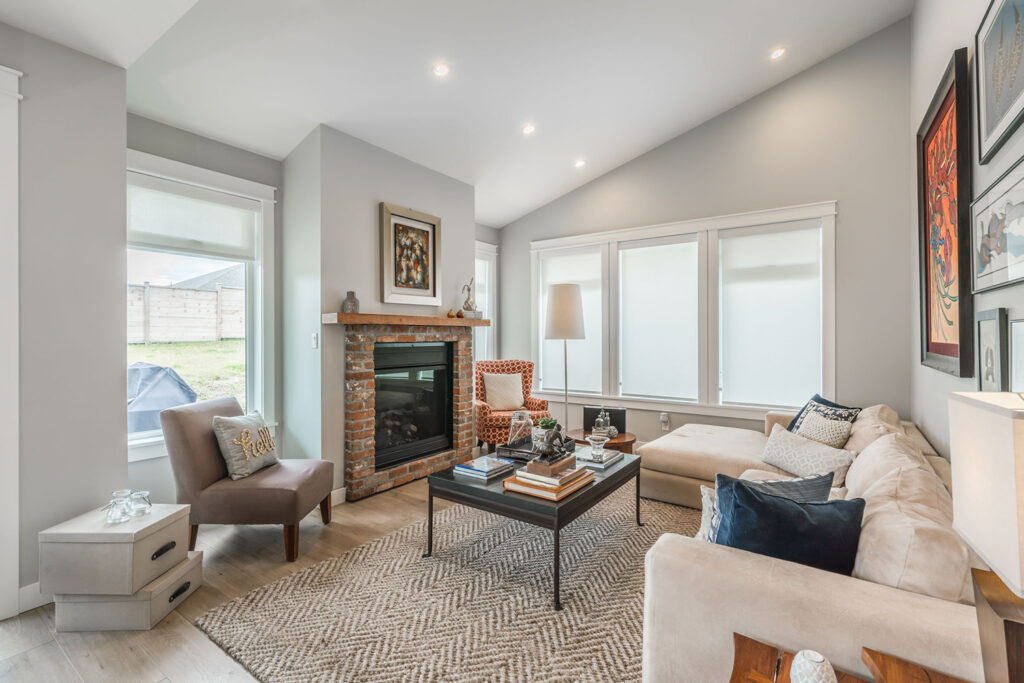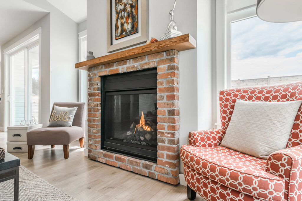 This custom 2-storey family home features a bright, modern kitchen with custom cabinetry, multi-purpose kitchen island, hardwood flooring, and a gorgeous tile backsplash.
