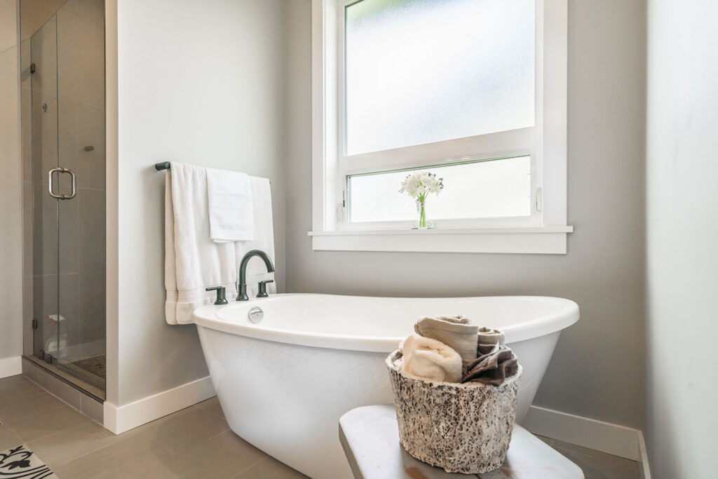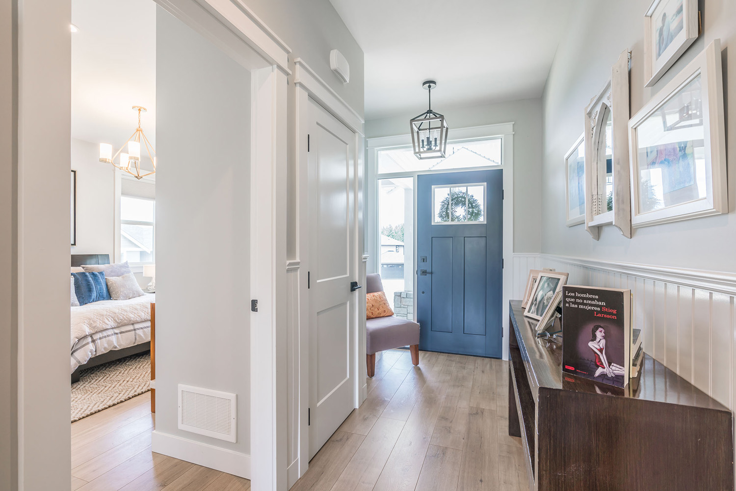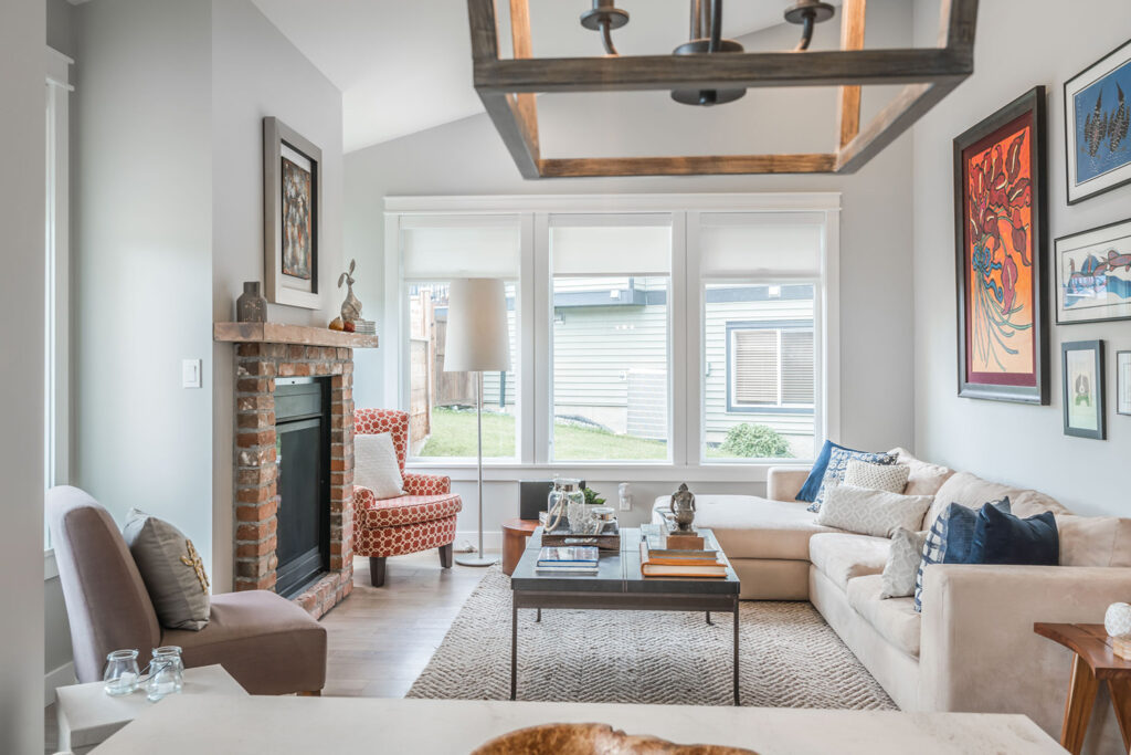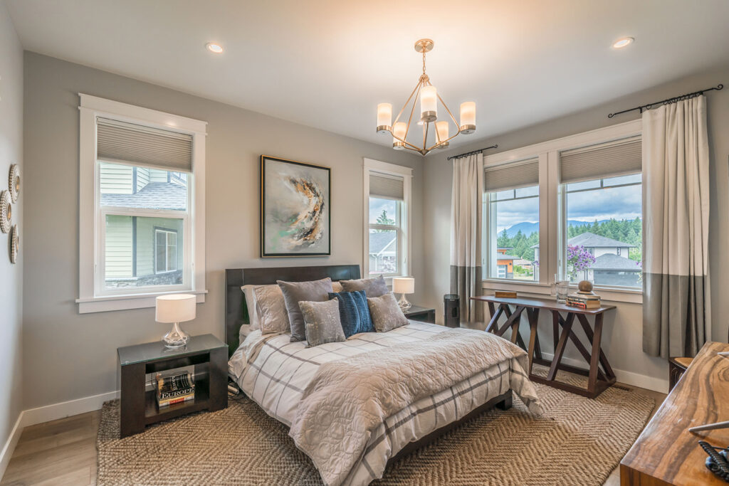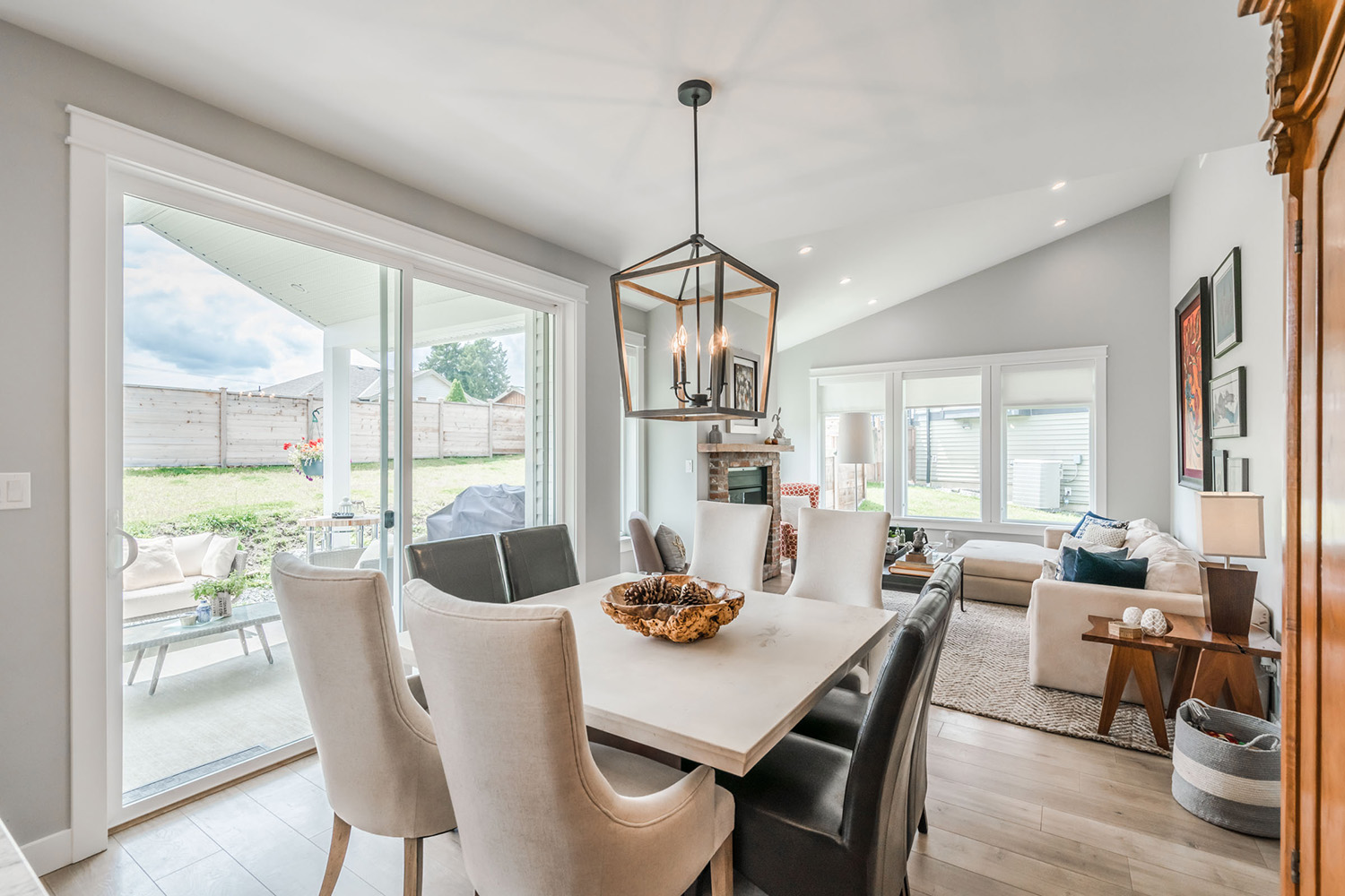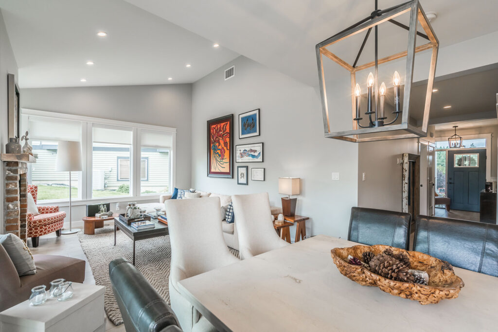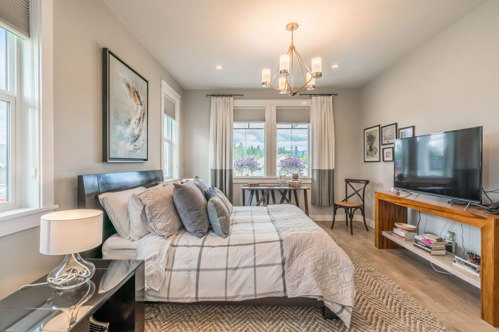 This custom 2-storey family home features a bright, modern kitchen with custom cabinetry, multi-purpose kitchen island, hardwood flooring, and a gorgeous tile backsplash.