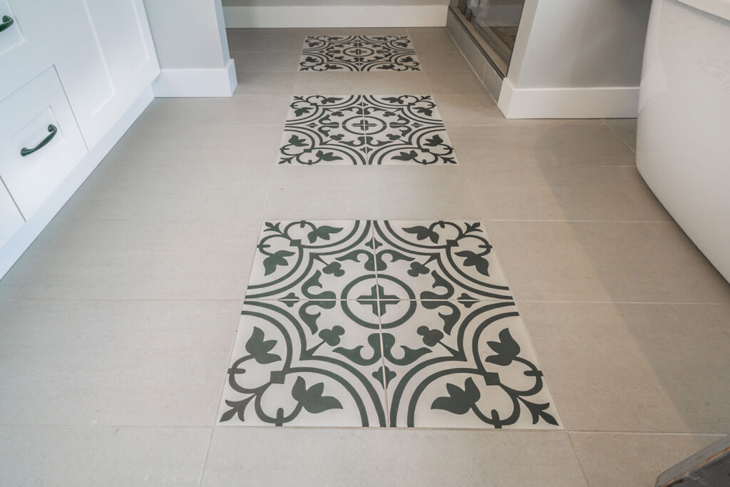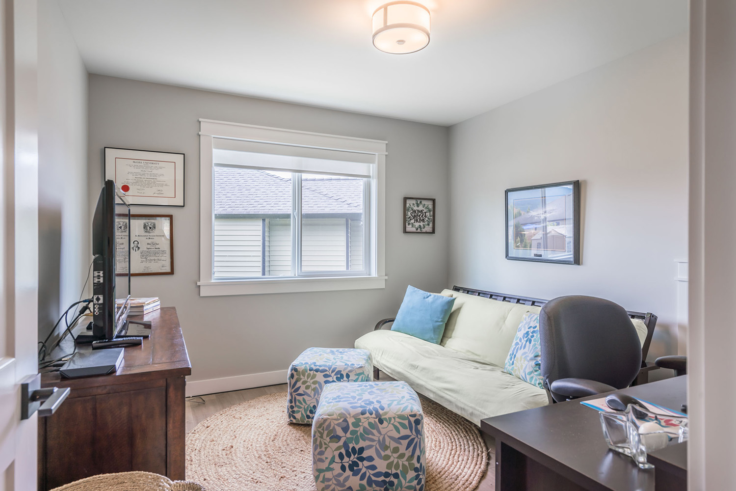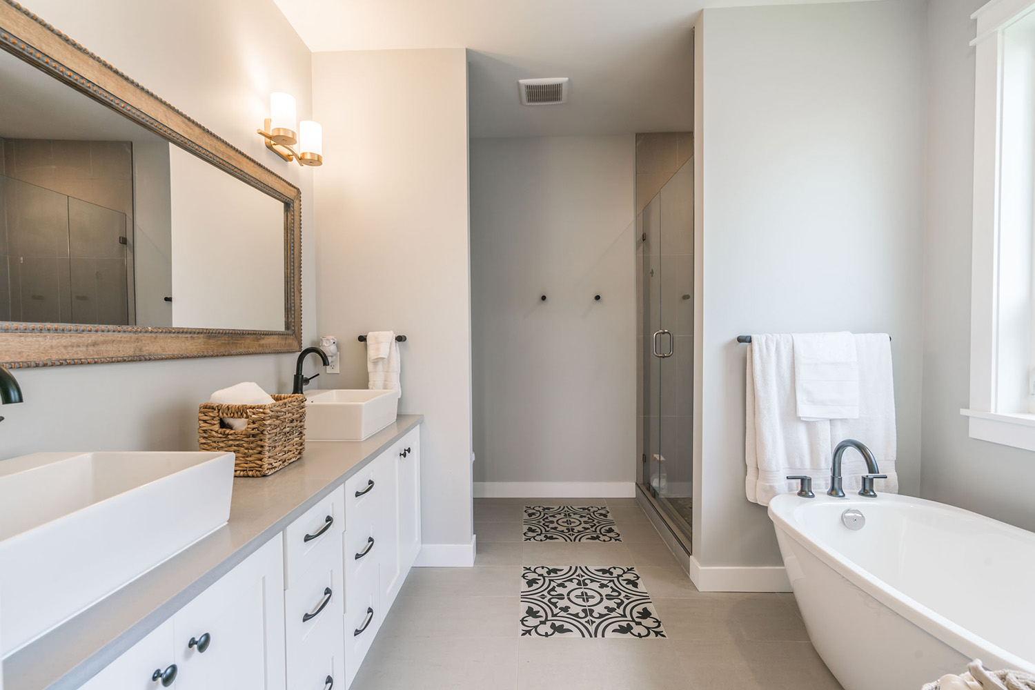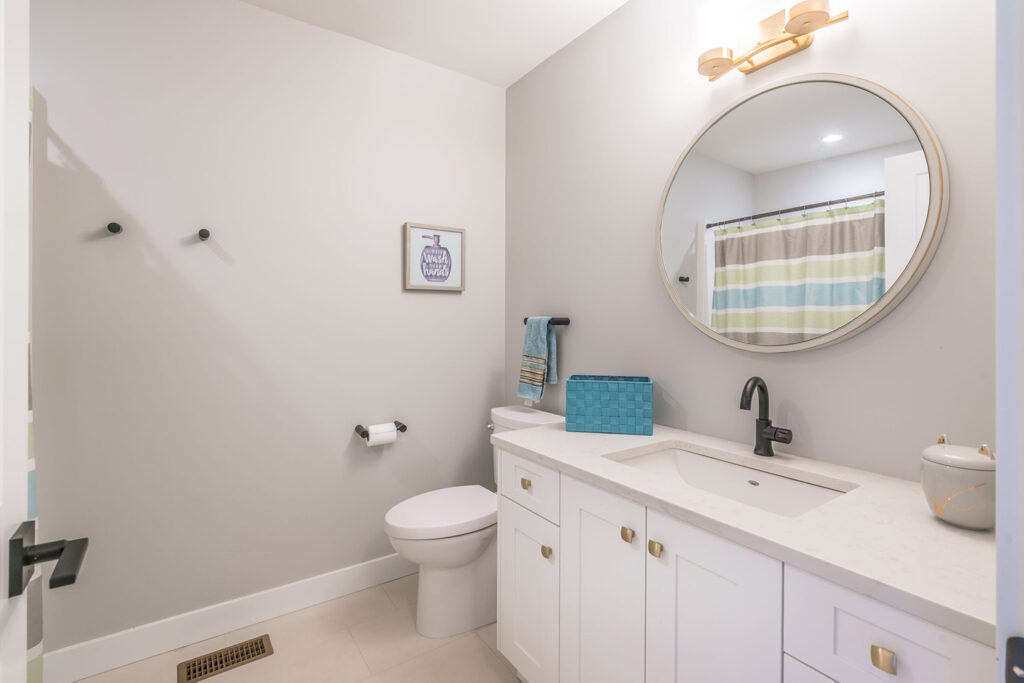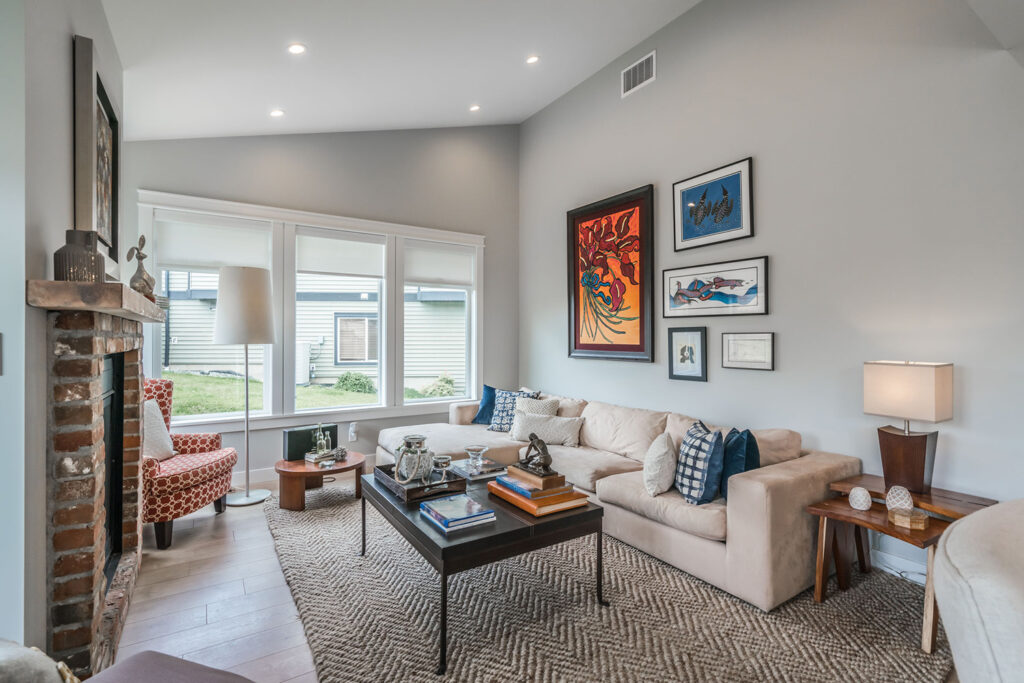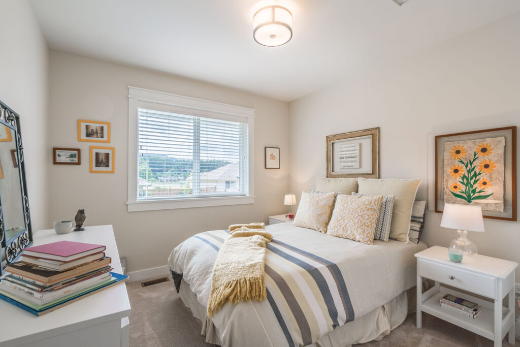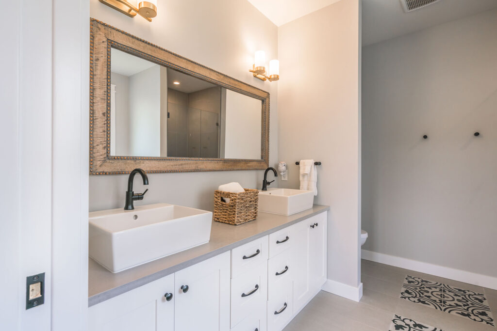 This custom 2-storey family home features a bright, modern kitchen with custom cabinetry, multi-purpose kitchen island, hardwood flooring, and a gorgeous tile backsplash.