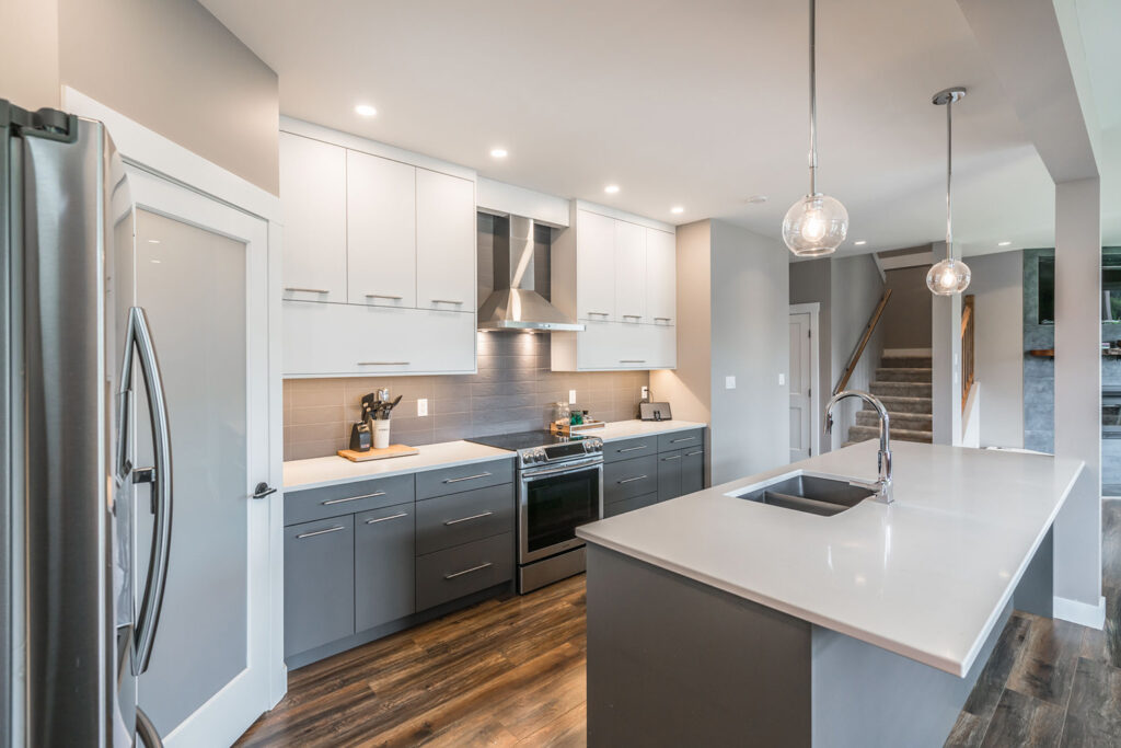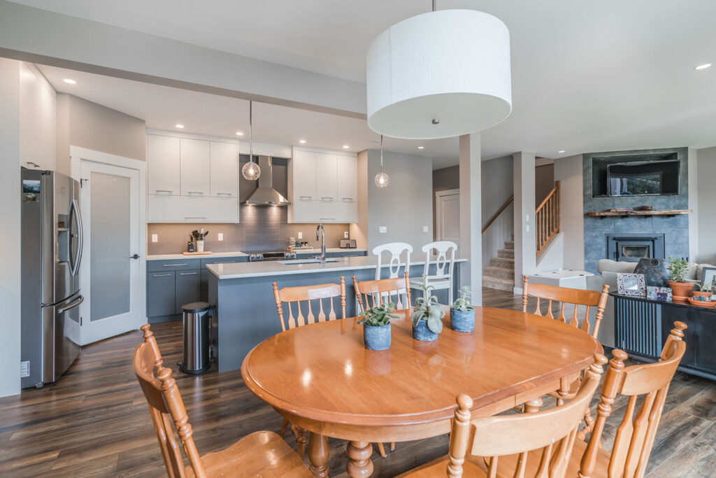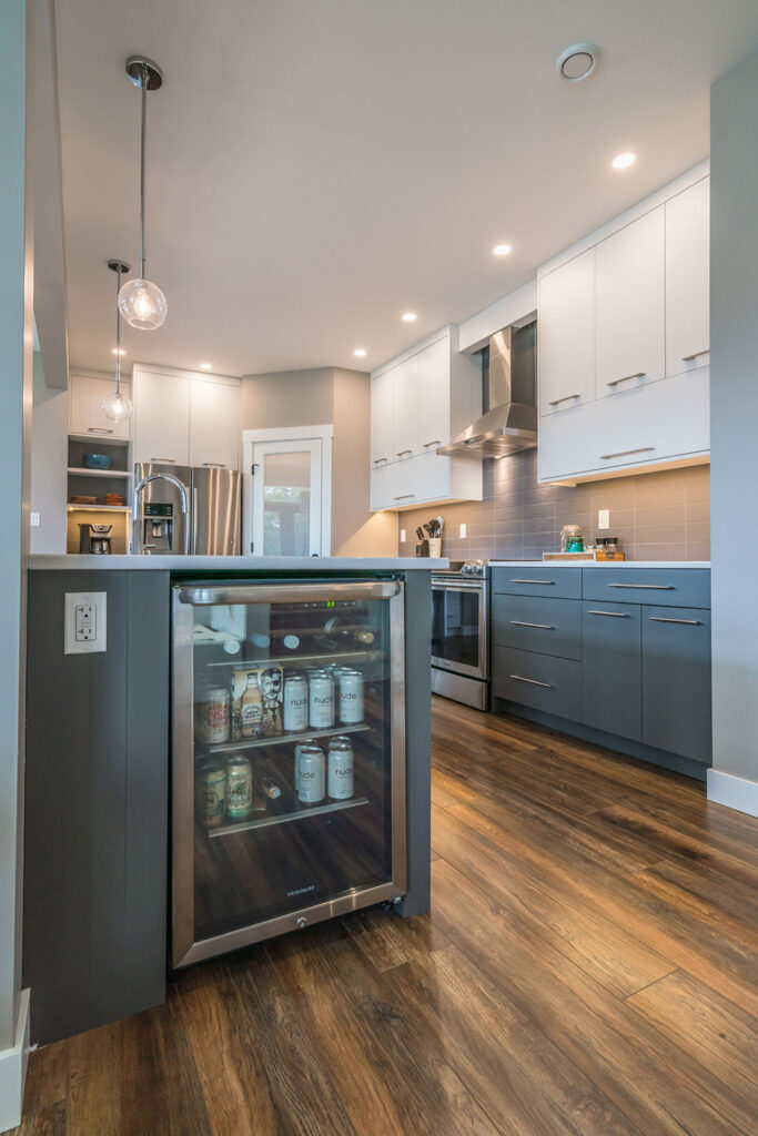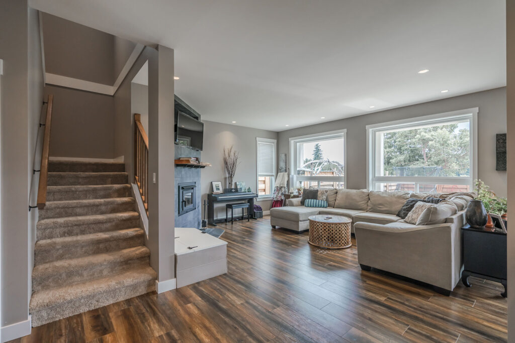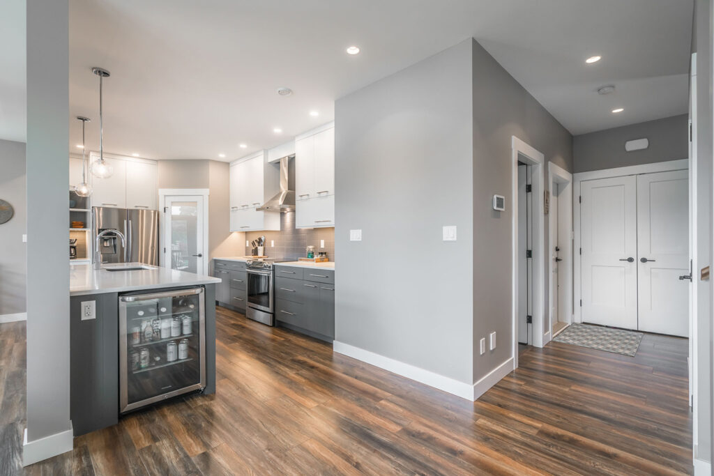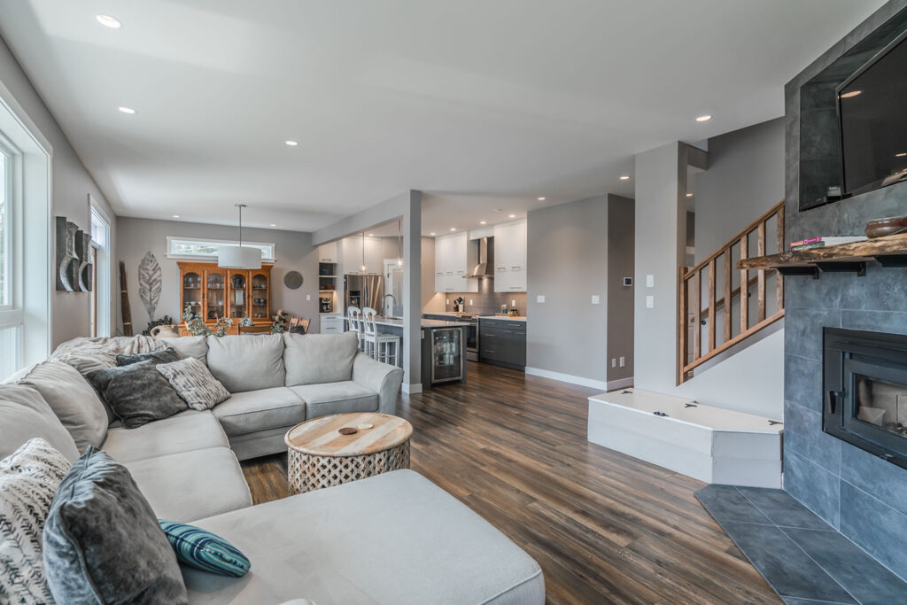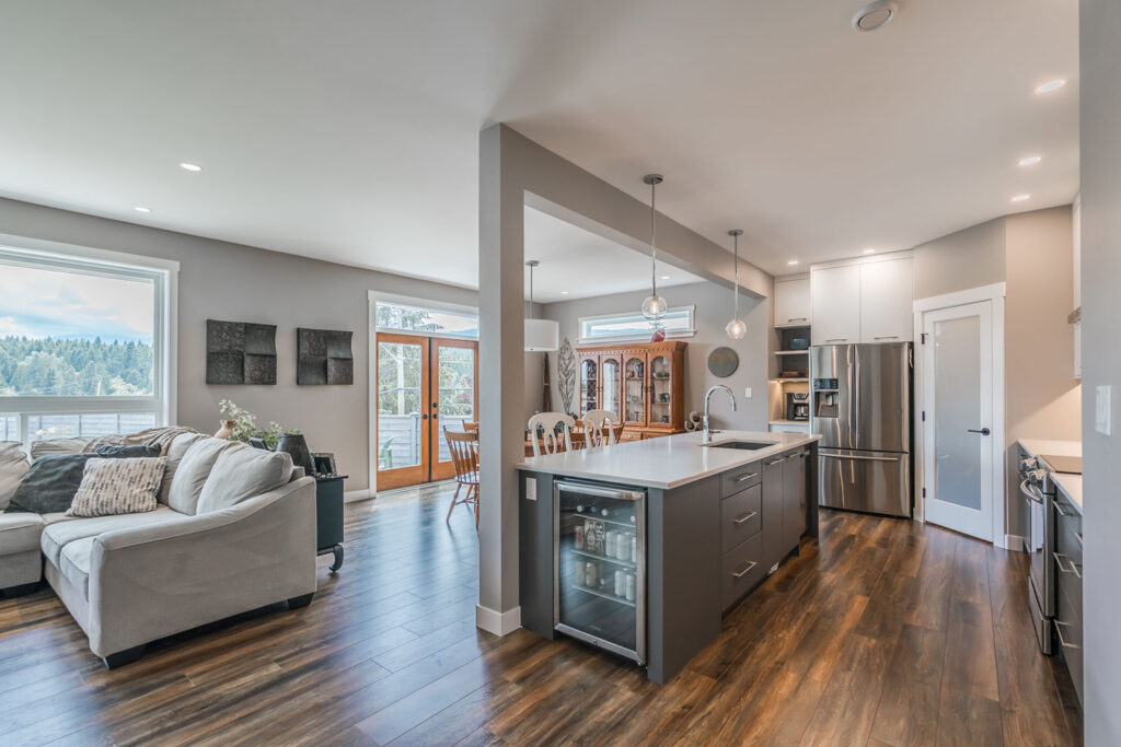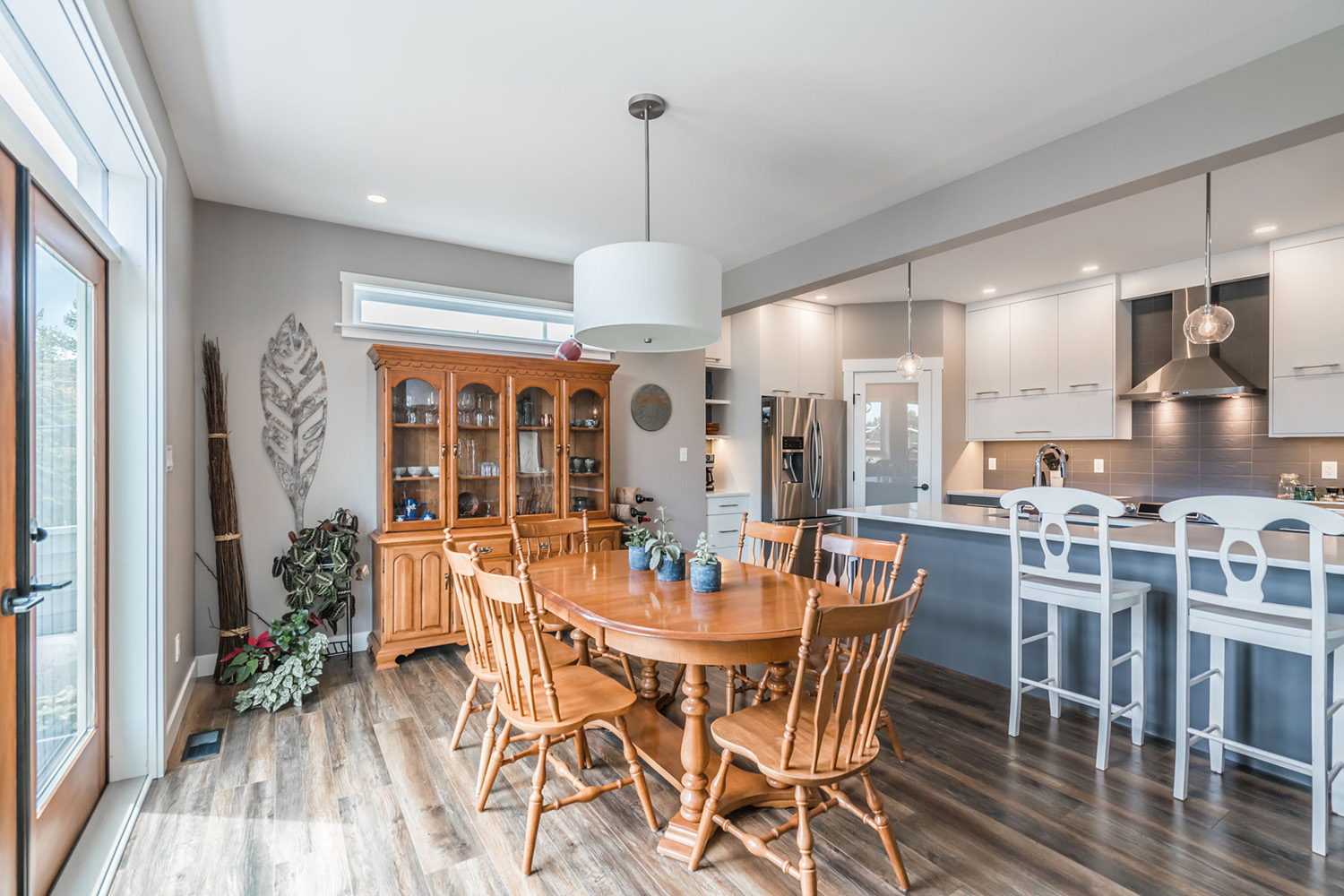 This 2 storey custom family home features an open concept main floor; combining the kitchen, dining, and living room into one bright and open space. The kitchen has lots of storage, including a beer and wine cooler built in to the kitchen island. A great space to relax or entertain guests in.