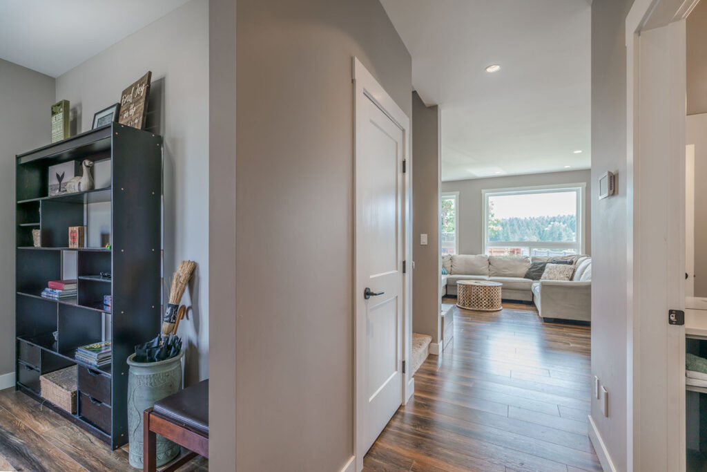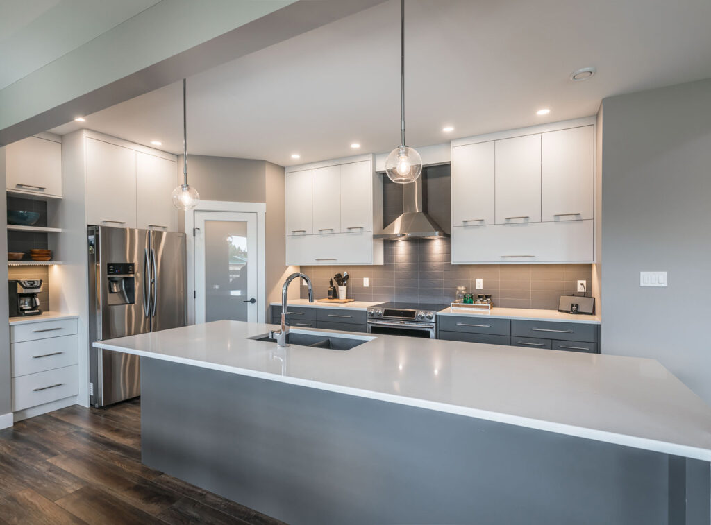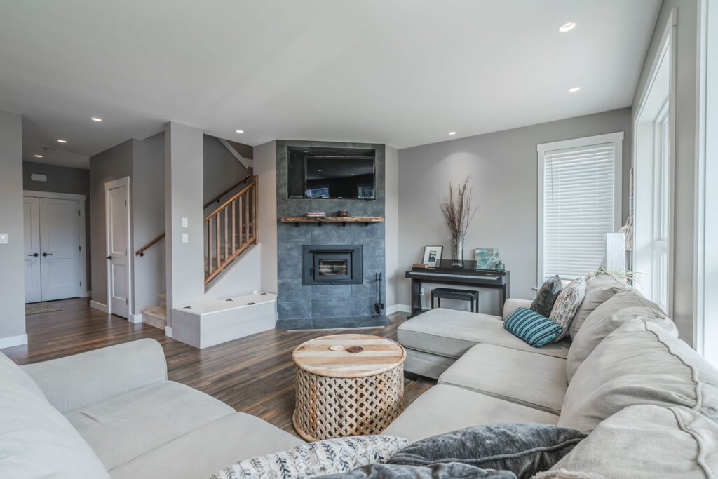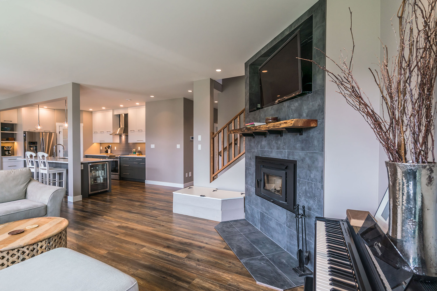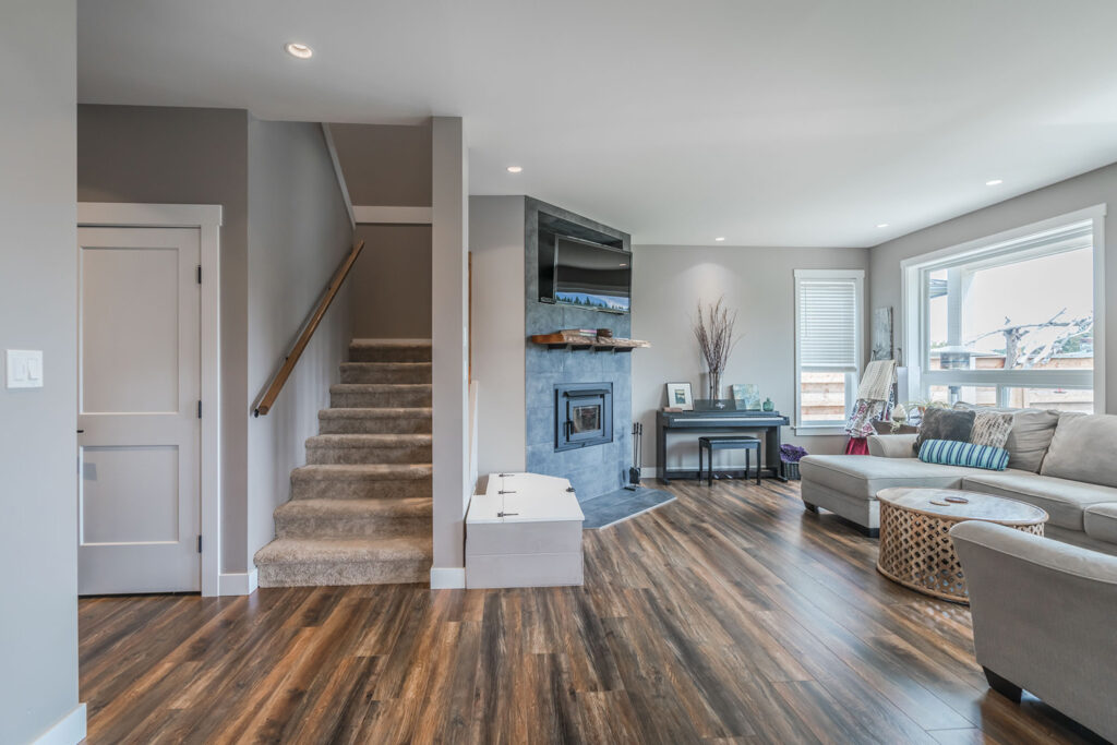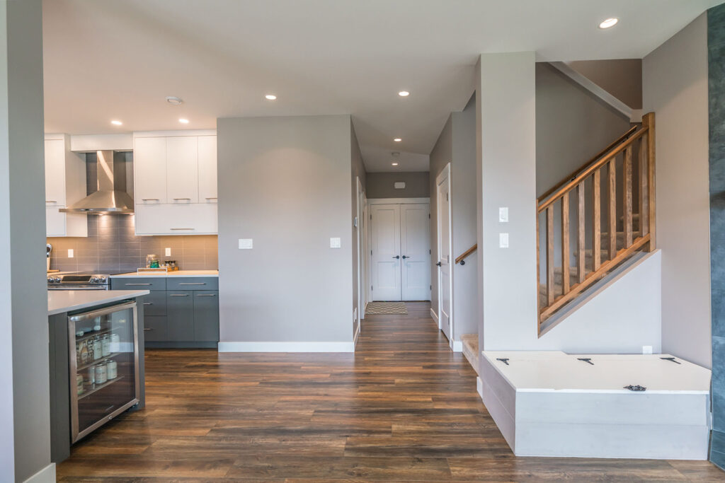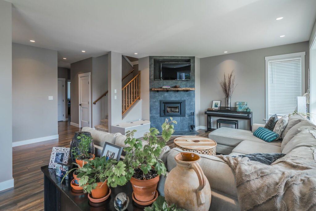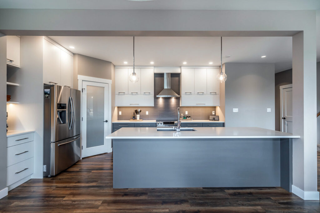 This 2 storey custom family home features an open concept main floor; combining the kitchen, dining, and living room into one bright and open space. The kitchen has lots of storage, including a beer and wine cooler built in to the kitchen island. A great space to relax or entertain guests in.