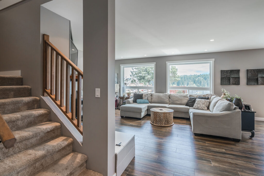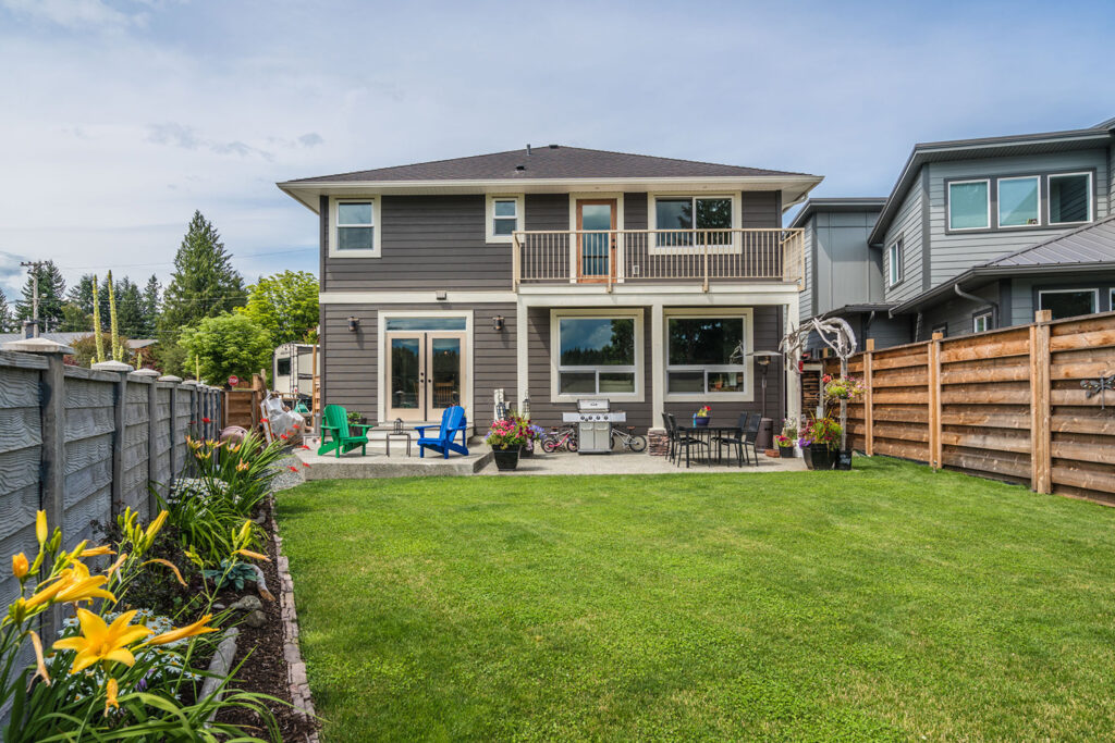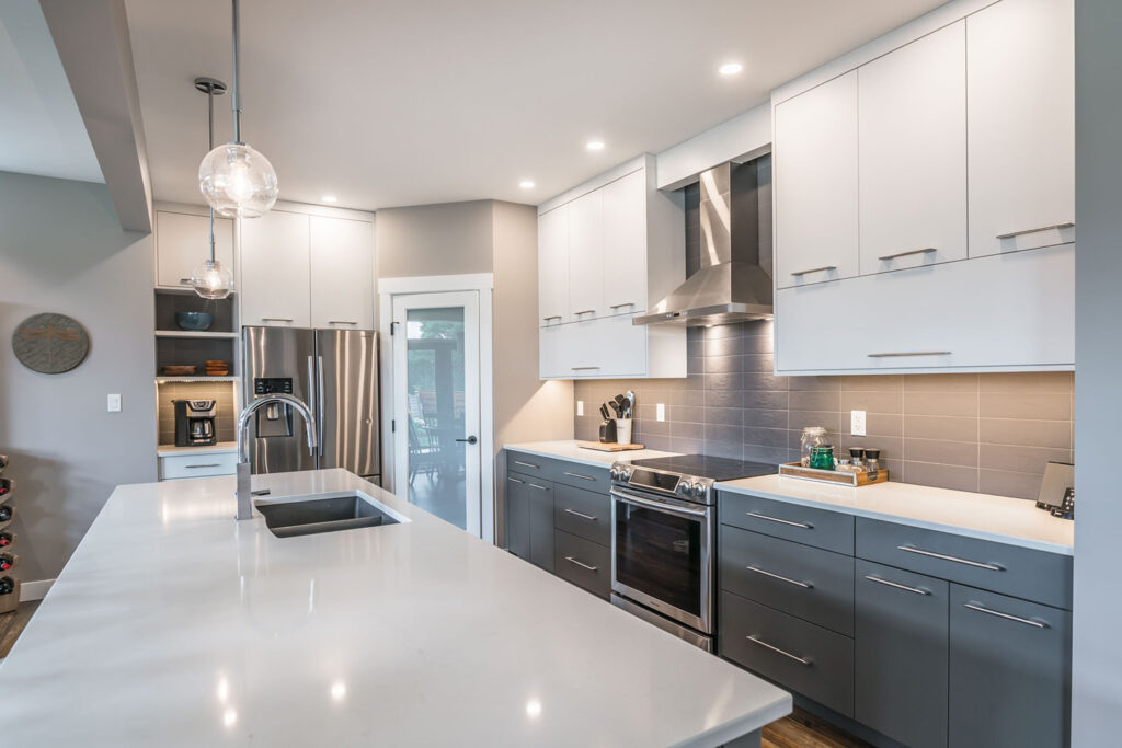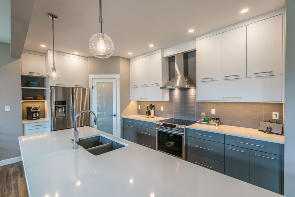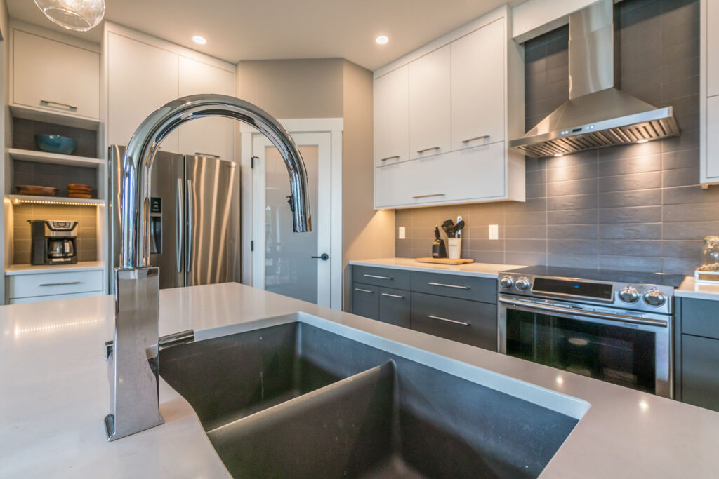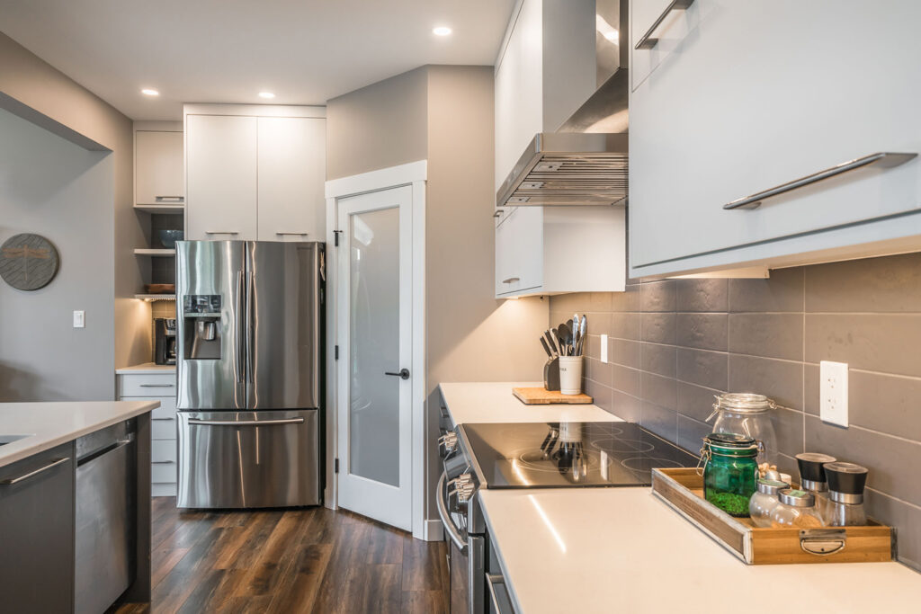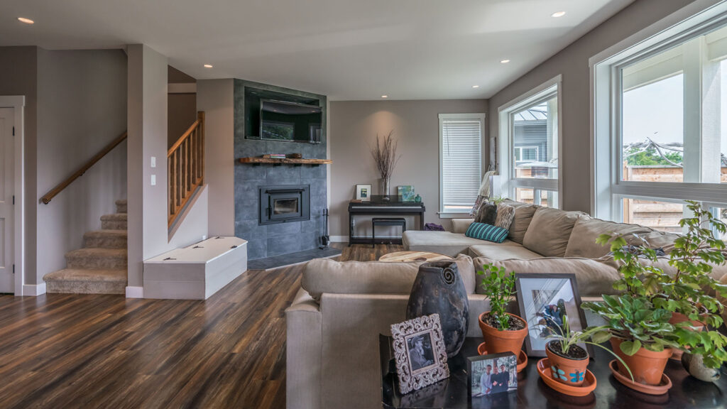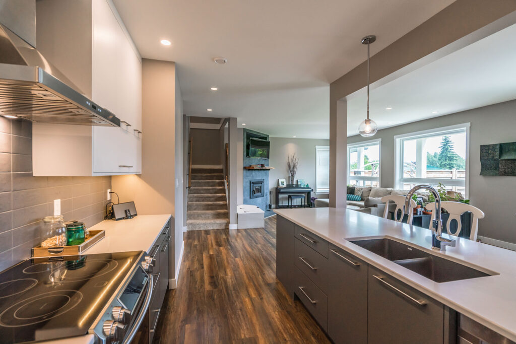 This 2 storey custom family home features an open concept main floor; combining the kitchen, dining, and living room into one bright and open space. The kitchen has lots of storage, including a beer and wine cooler built in to the kitchen island. A great space to relax or entertain guests in.