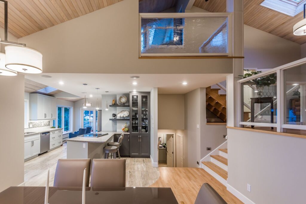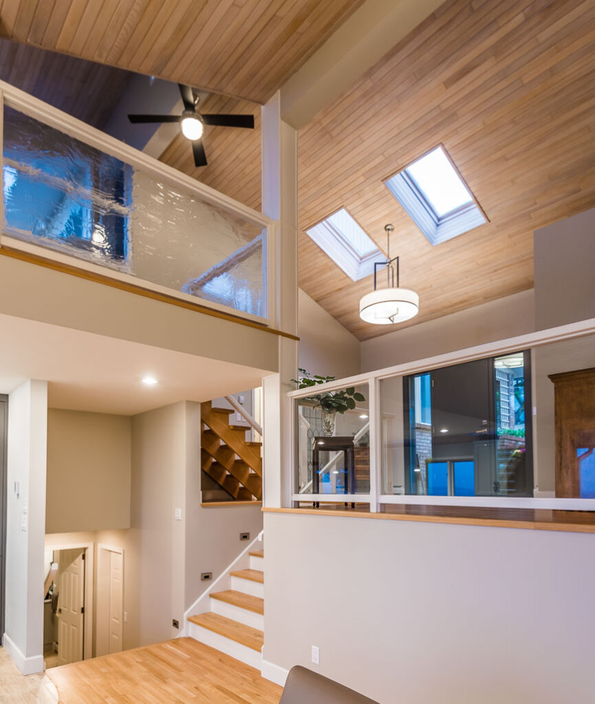 The home was originally designed and built by an award-winning architect. The dated finishes made the home feel small and dark. Our painter and floor finisher did an outstanding job; the entire ceiling was painted by hand to ensure each and every board had the same amount of stain. This was done to ensure a uniform look. The floor finisher sanded and stained the floors in place 3 times between the other trades working on site. The results speak for themselves.