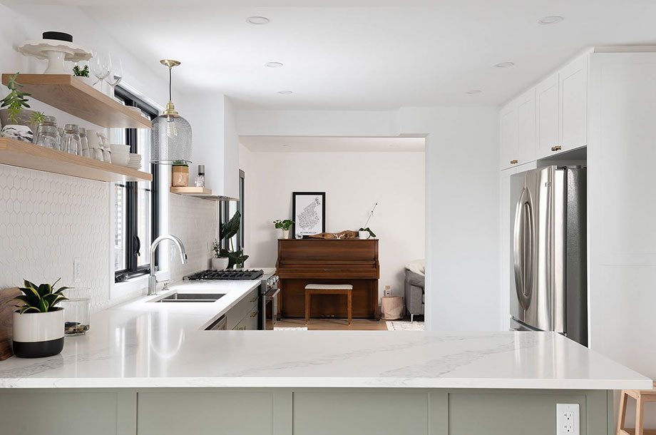 By reviewing their personal home evaluation beforehand, we were able to recognize the clients penchant for storage and modern shelving. To give them more prep space, we added modern floating shelves and all white custom cabinetry that blends naturally into the wall. The result was budget friendly and gave the kitchen a modern, minimalistic setup. Ultimately, the client was thrilled with the way we maximized the available space.