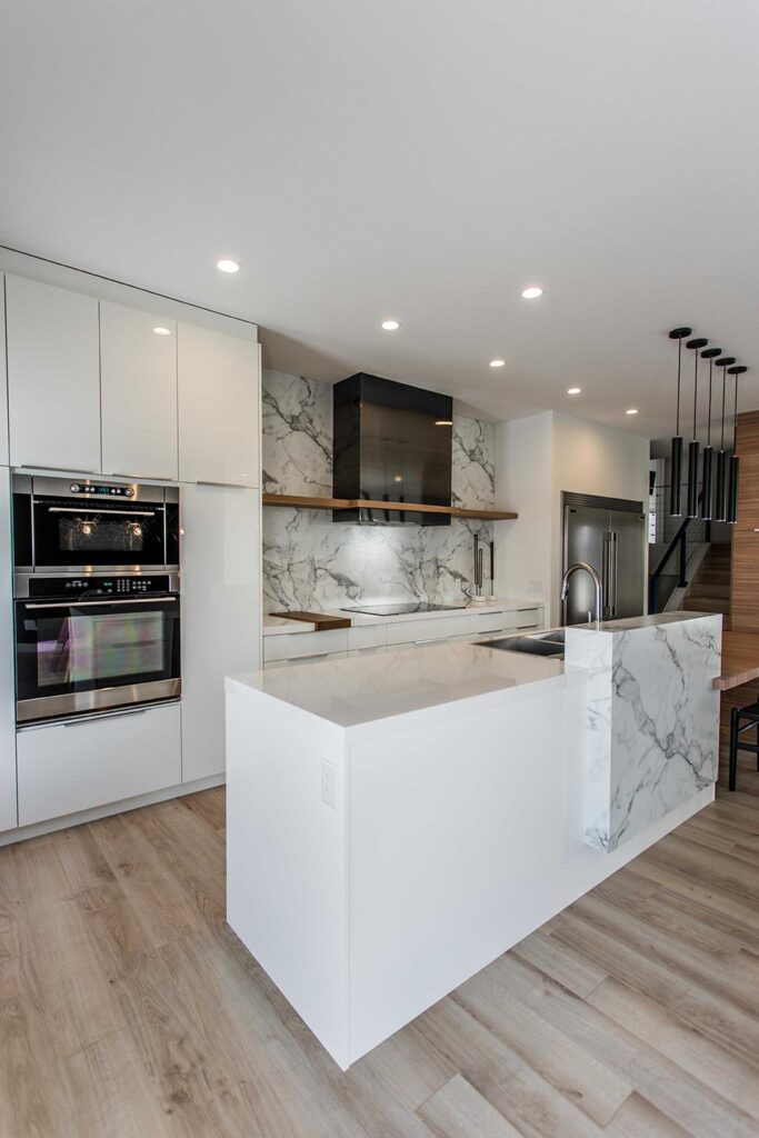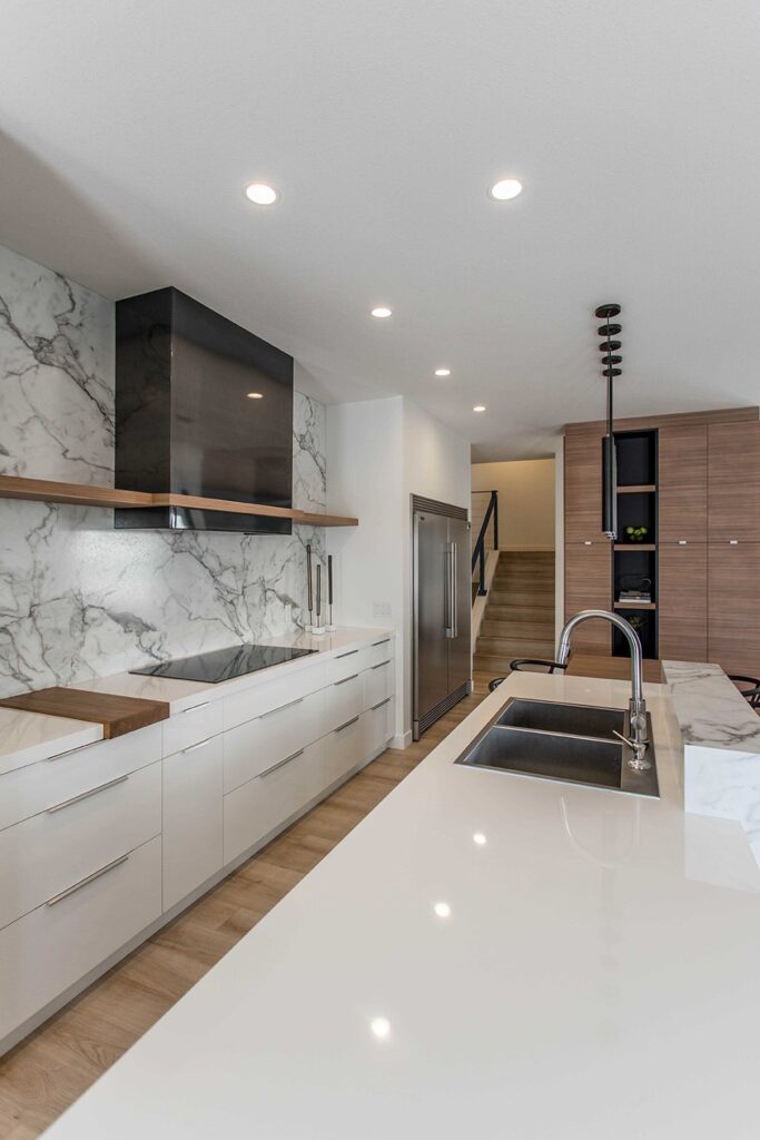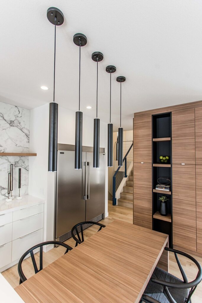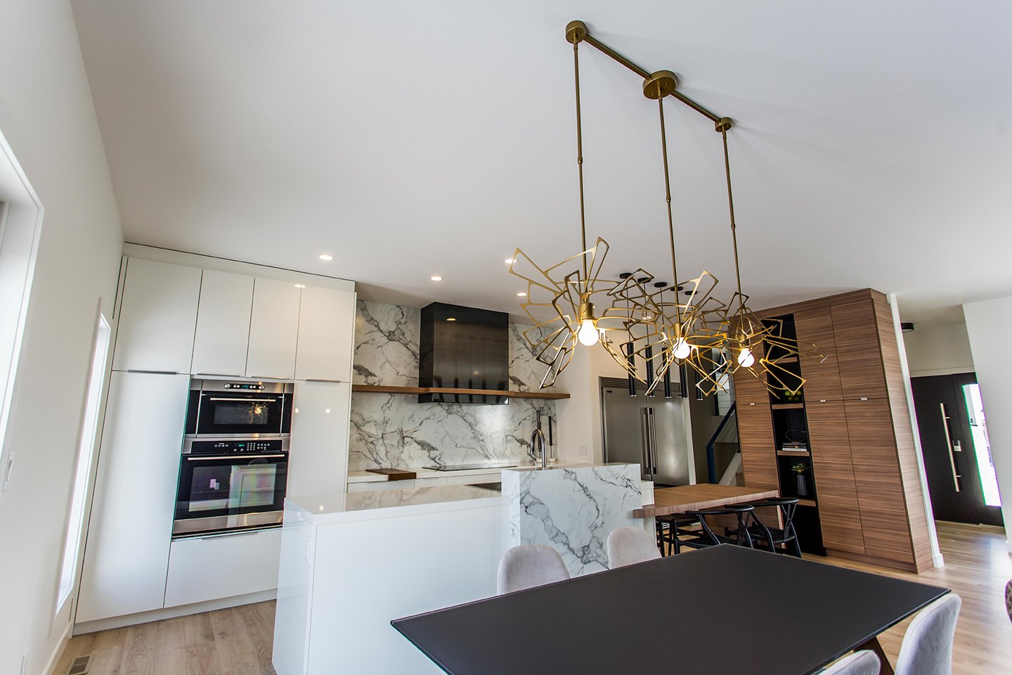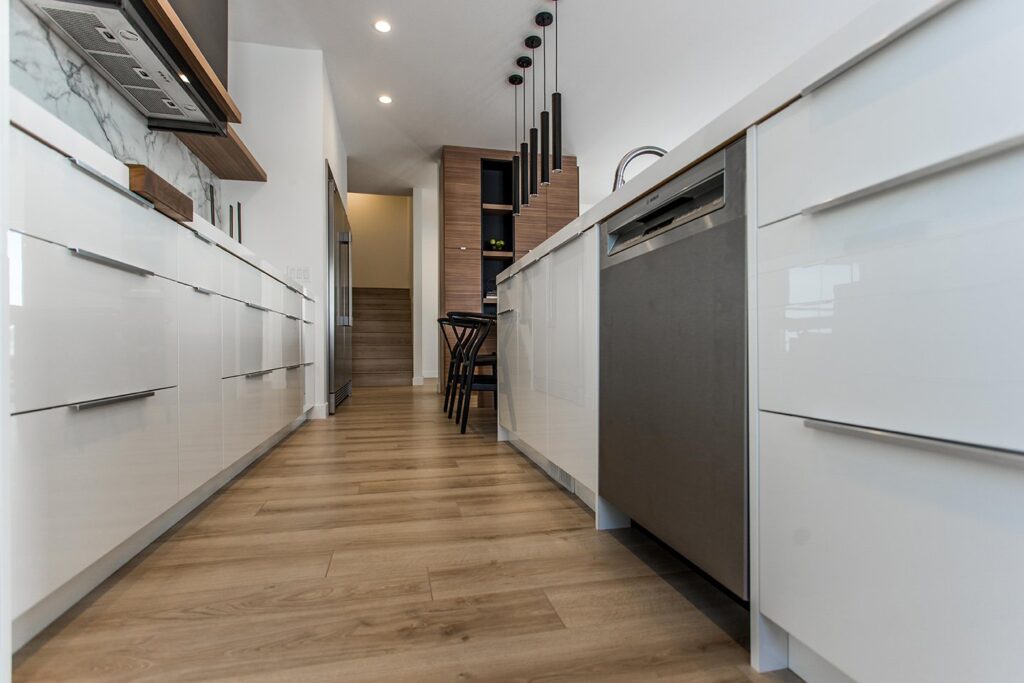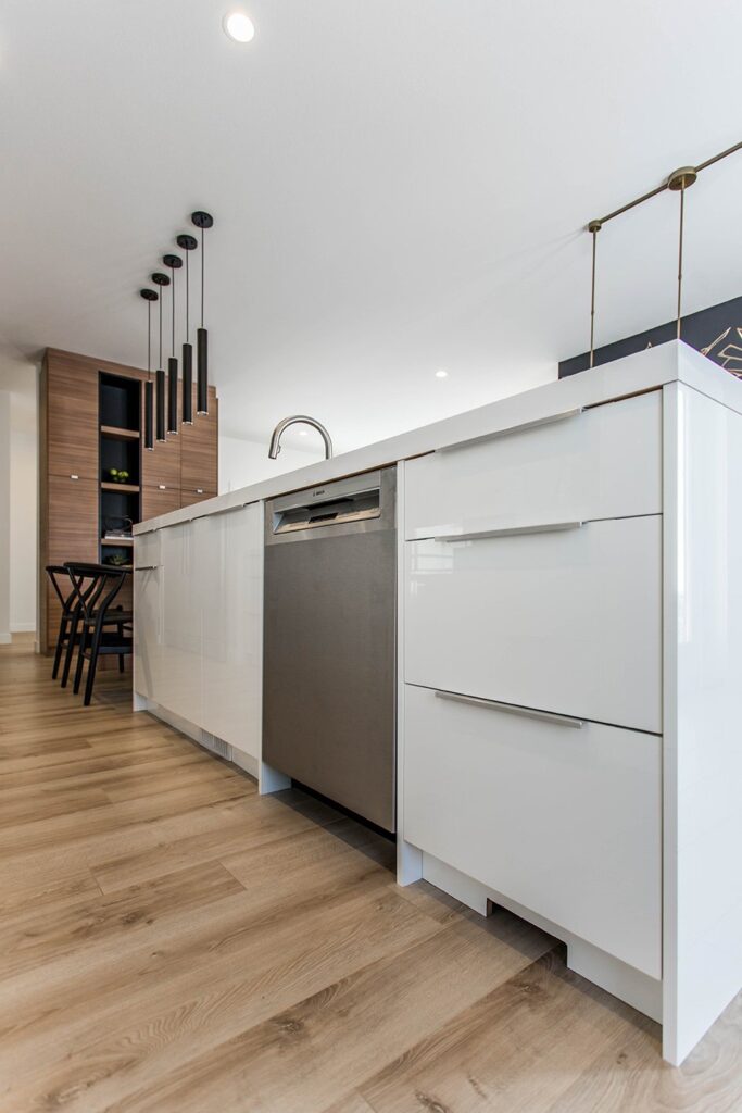 This home has a very cozy contemporary feel to it with a minimalist style. The space features high ceilings, light wood floors, and a beautiful custom kitchen.