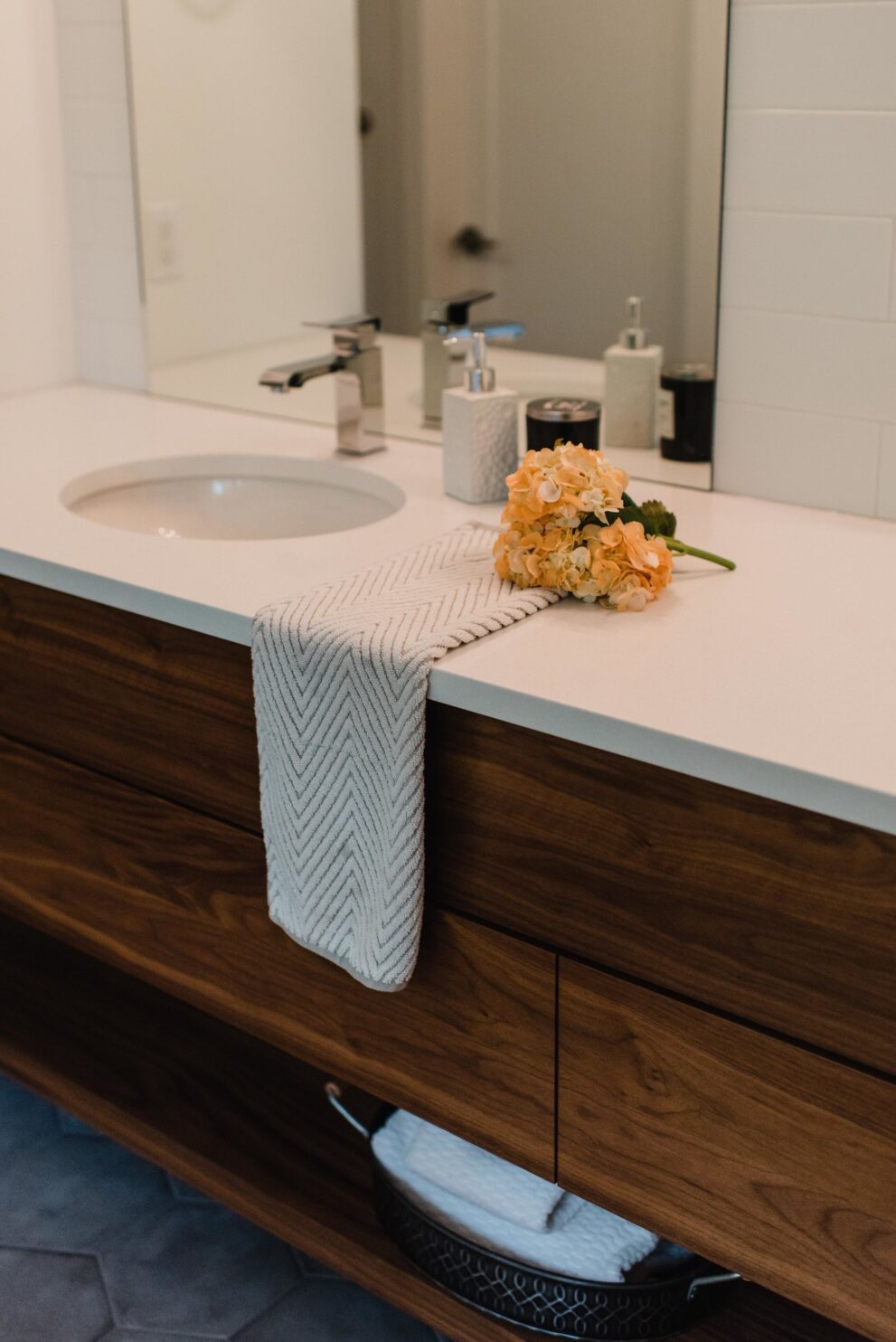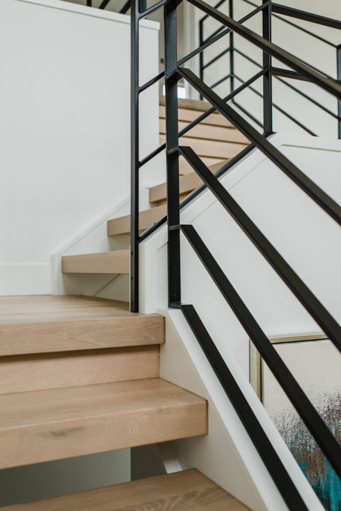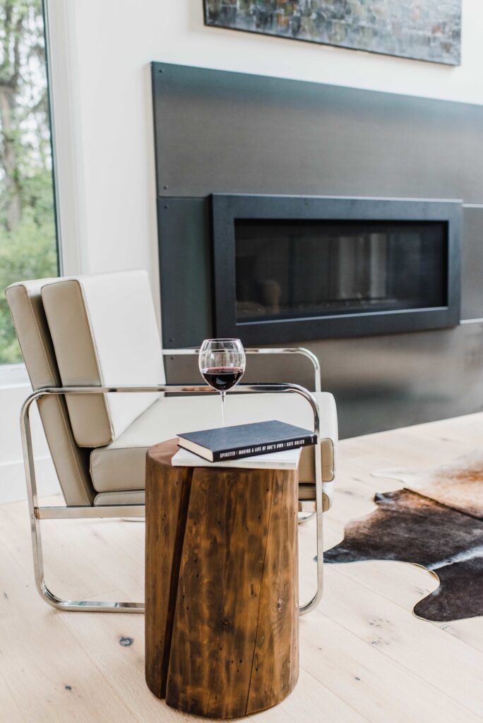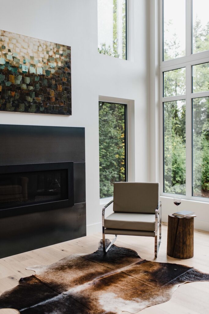 This contemporary custom home features and open concept layout, contemporary design, and luxurious finishes. The main living space has a unique, contemporary window layout that is nicely complimented by the high ceilings. The modern light wood floors and white walls bring a very bright and open feel that continues through to the kitchen/dining area. A unique element to this kitchen is the reclaimed wood feature wall. This adds a more rustic feel to the home that matches nicely to the dark tiled ribbon fireplace.