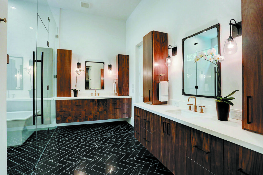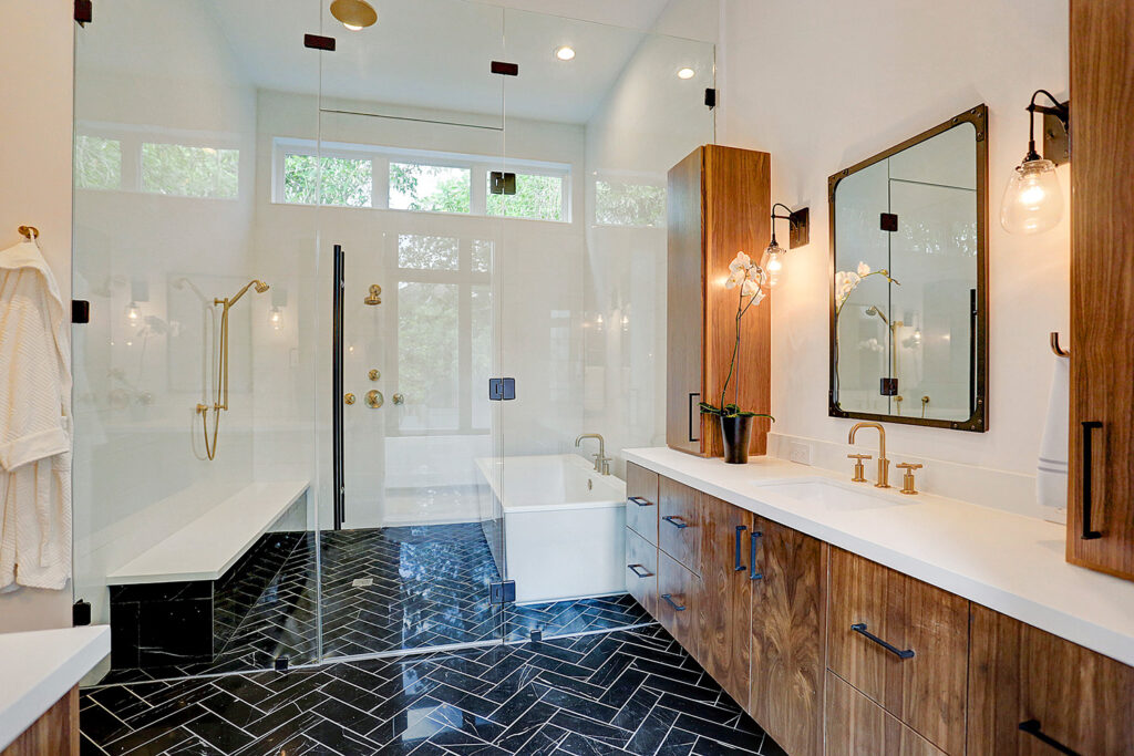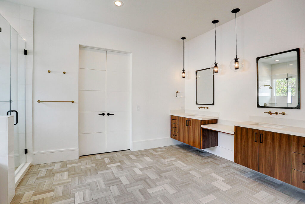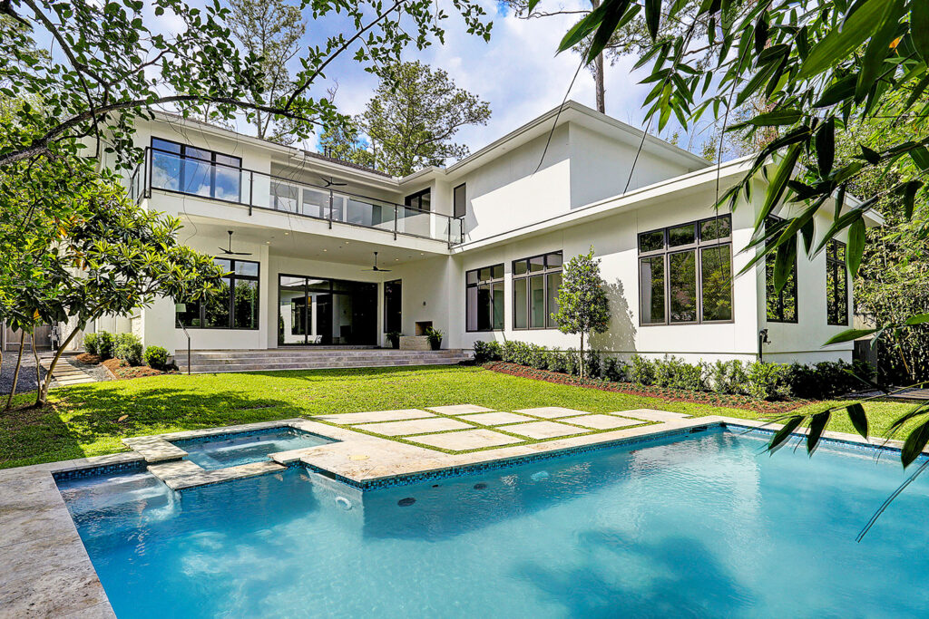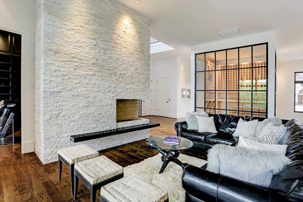 This updated version of a mid-century modern custom home features an expansive open layout, gourmet kitchen, personal elevator, and various luxurious living spaces. The clients were looking to create a beautiful home that could accommodate the immediate family and would have ample space for entertaining guests. The main living area features a custom wine storage area, a sleek fireplace and large stacking doors that lead to the outdoor pool area. This luxurious custom home is the perfect space for the clients to relax or entertain.