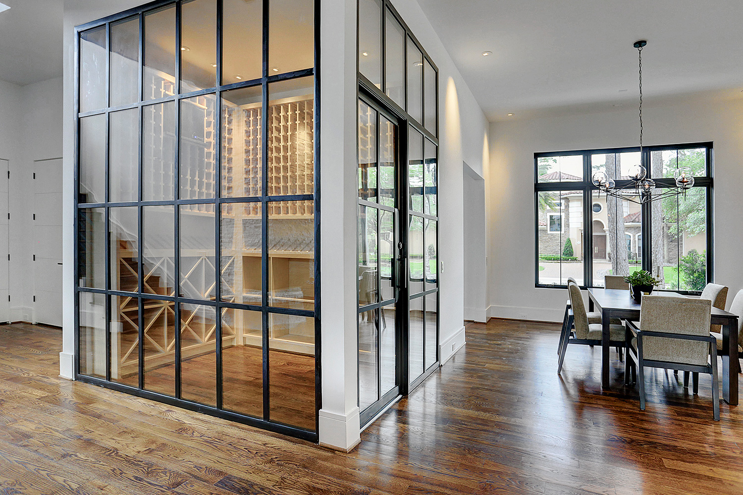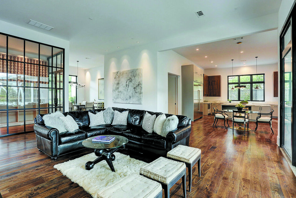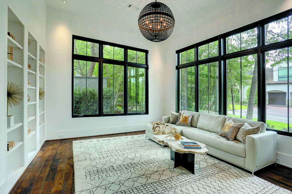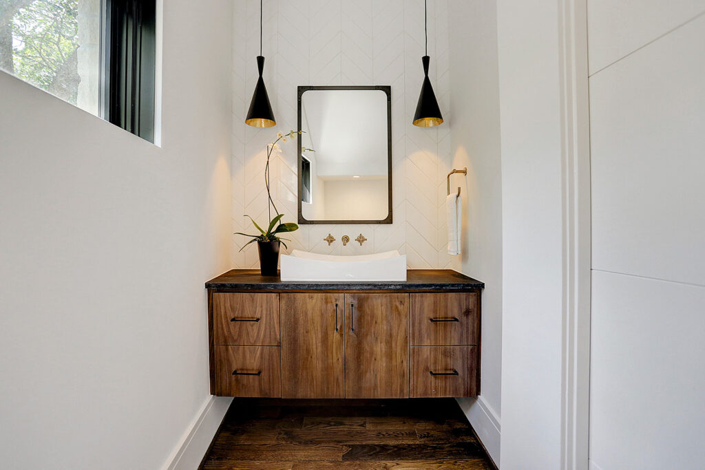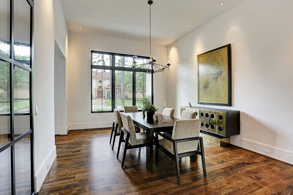 This updated version of a mid-century modern custom home features an expansive open layout, gourmet kitchen, personal elevator, and various luxurious living spaces. The clients were looking to create a beautiful home that could accommodate the immediate family and would have ample space for entertaining guests. The main living area features a custom wine storage area, a sleek fireplace and large stacking doors that lead to the outdoor pool area. This luxurious custom home is the perfect space for the clients to relax or entertain.