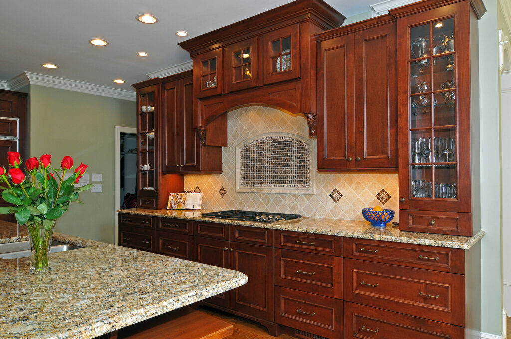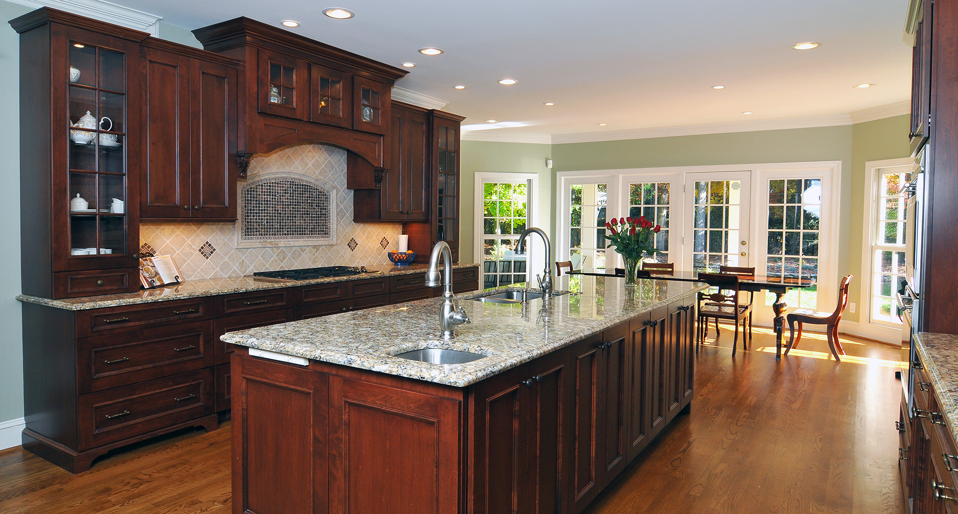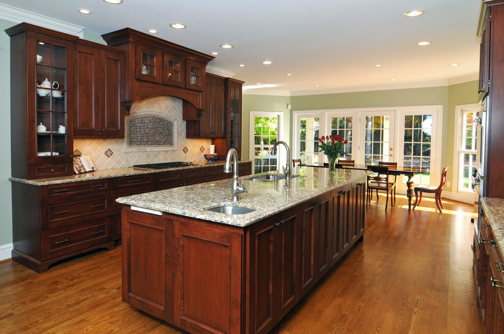 To enlarge the size of the kitchen area, a back staircase was straightened, which gave the client six extra feet of length in the kitchen. This was enough space to build an island 12’ wide x 4’ deep. The clients also wanted a bright kitchen and installed almost 50 can lights.