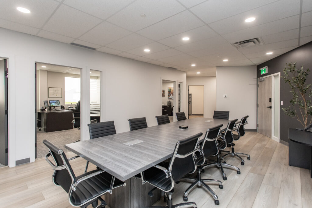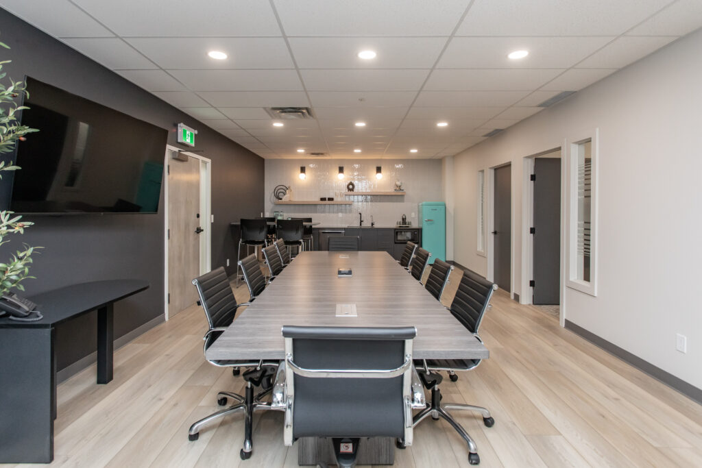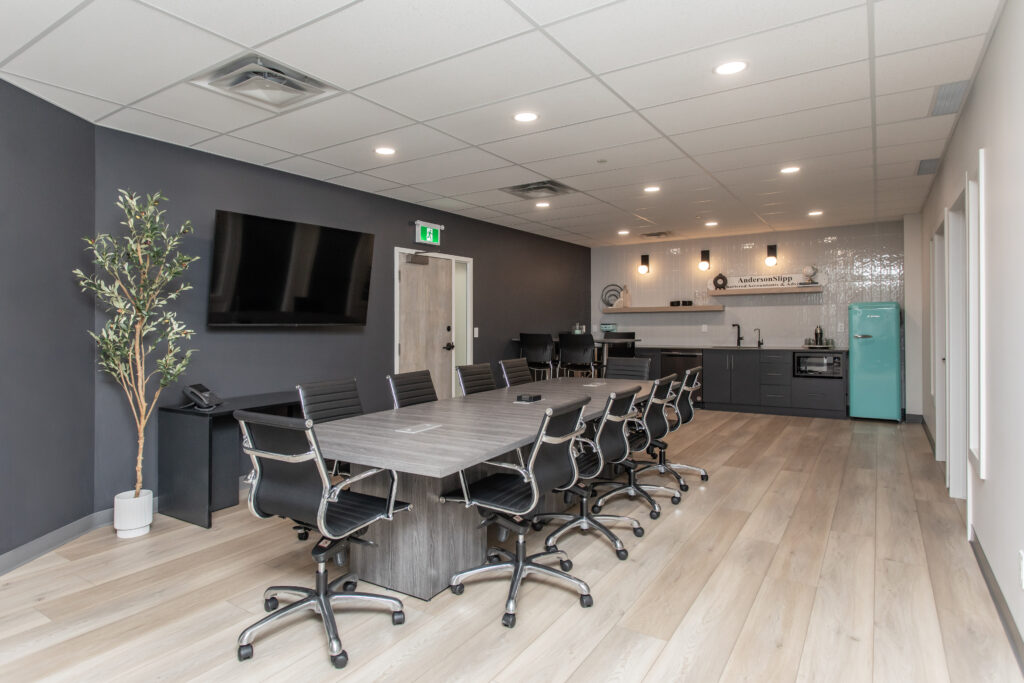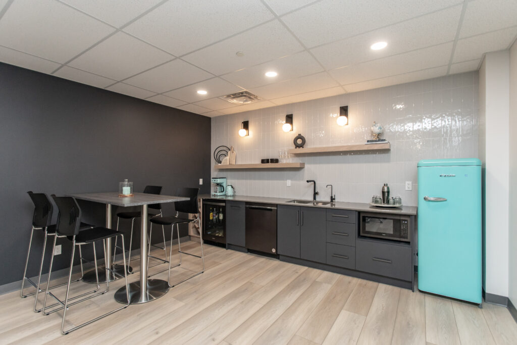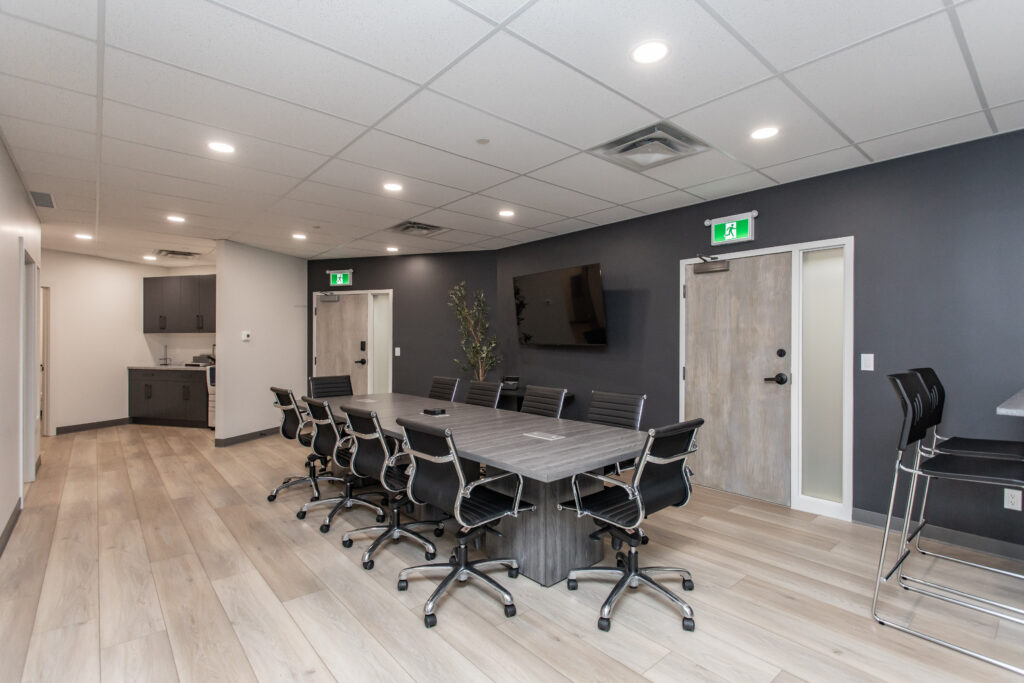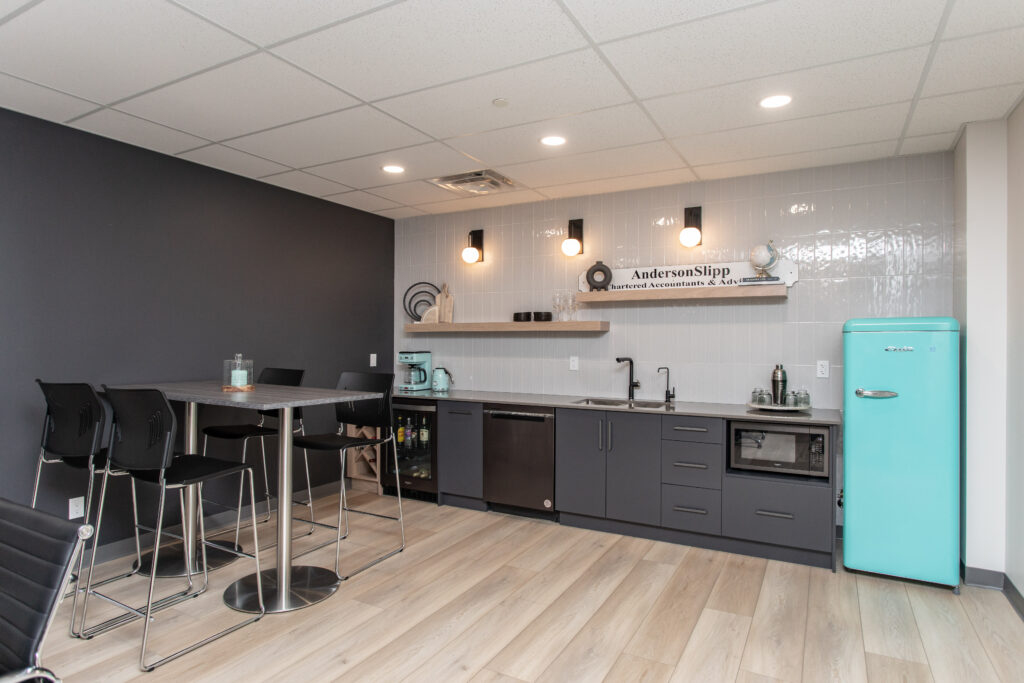 This modern commercial renovation by Alair Homes Red Deer brings together functionality, comfort, and elevated design. Featuring a spacious boardroom, sleek kitchenette, custom cabinetry, and warm wood-tone flooring, the space is tailored for collaboration and productivity. Thoughtful finishes—like matte black accents, open shelving, and the signature retro-mint fridge—add personality while maintaining a professional, cohesive aesthetic.