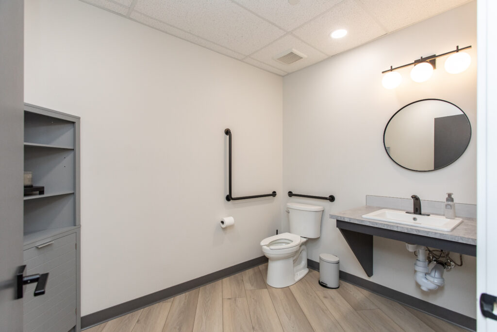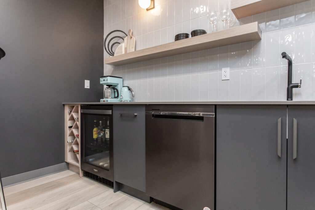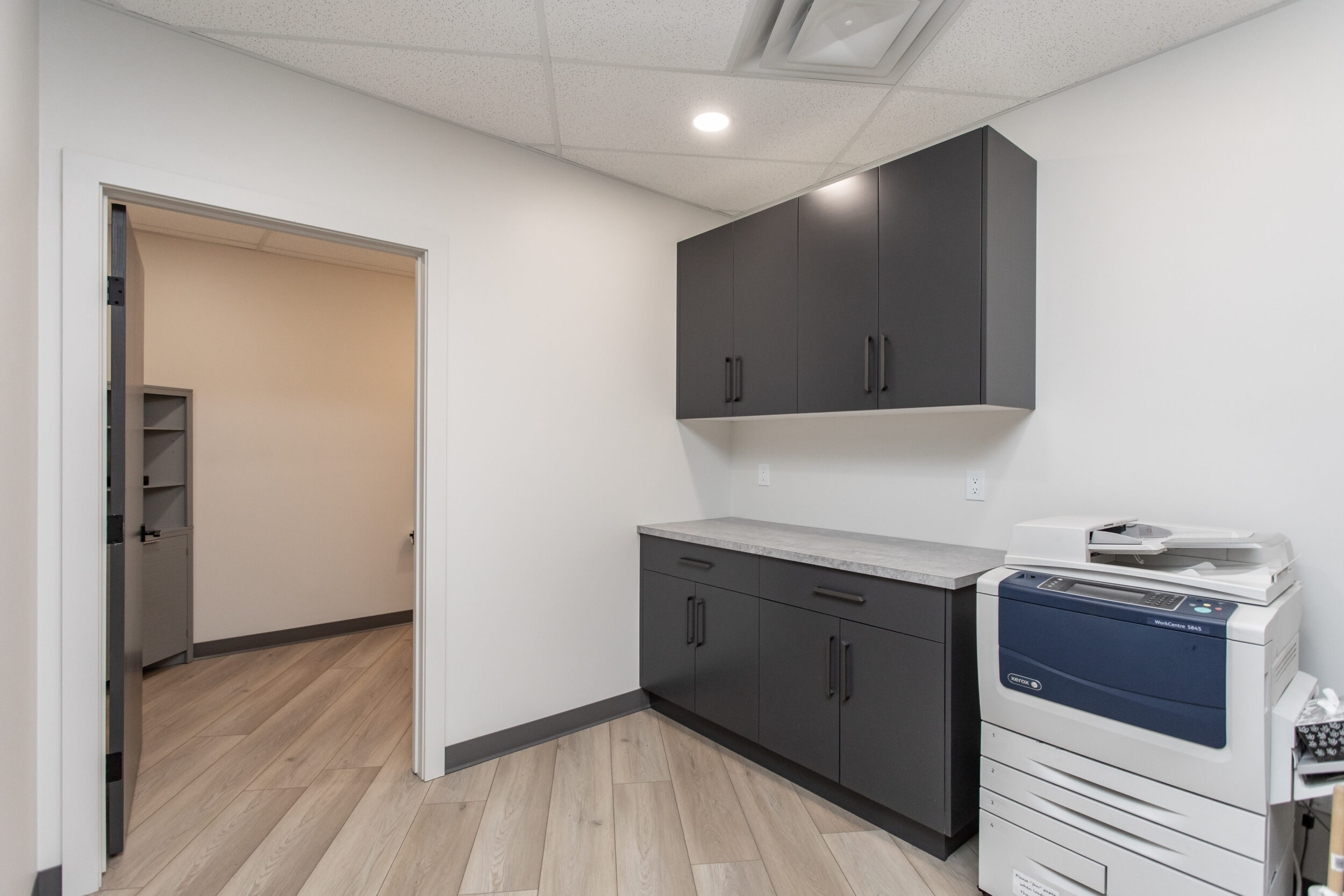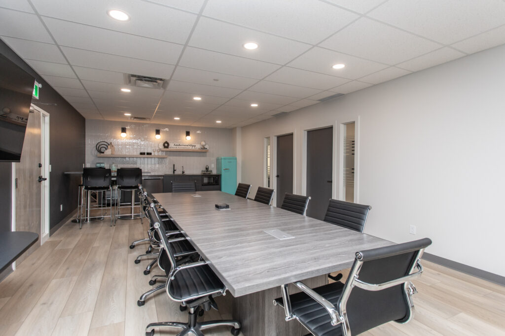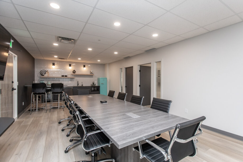 This modern commercial renovation by Alair Homes Red Deer brings together functionality, comfort, and elevated design. Featuring a spacious boardroom, sleek kitchenette, custom cabinetry, and warm wood-tone flooring, the space is tailored for collaboration and productivity. Thoughtful finishes—like matte black accents, open shelving, and the signature retro-mint fridge—add personality while maintaining a professional, cohesive aesthetic.