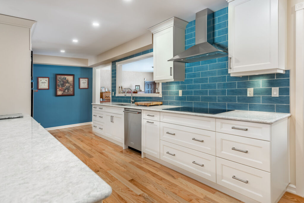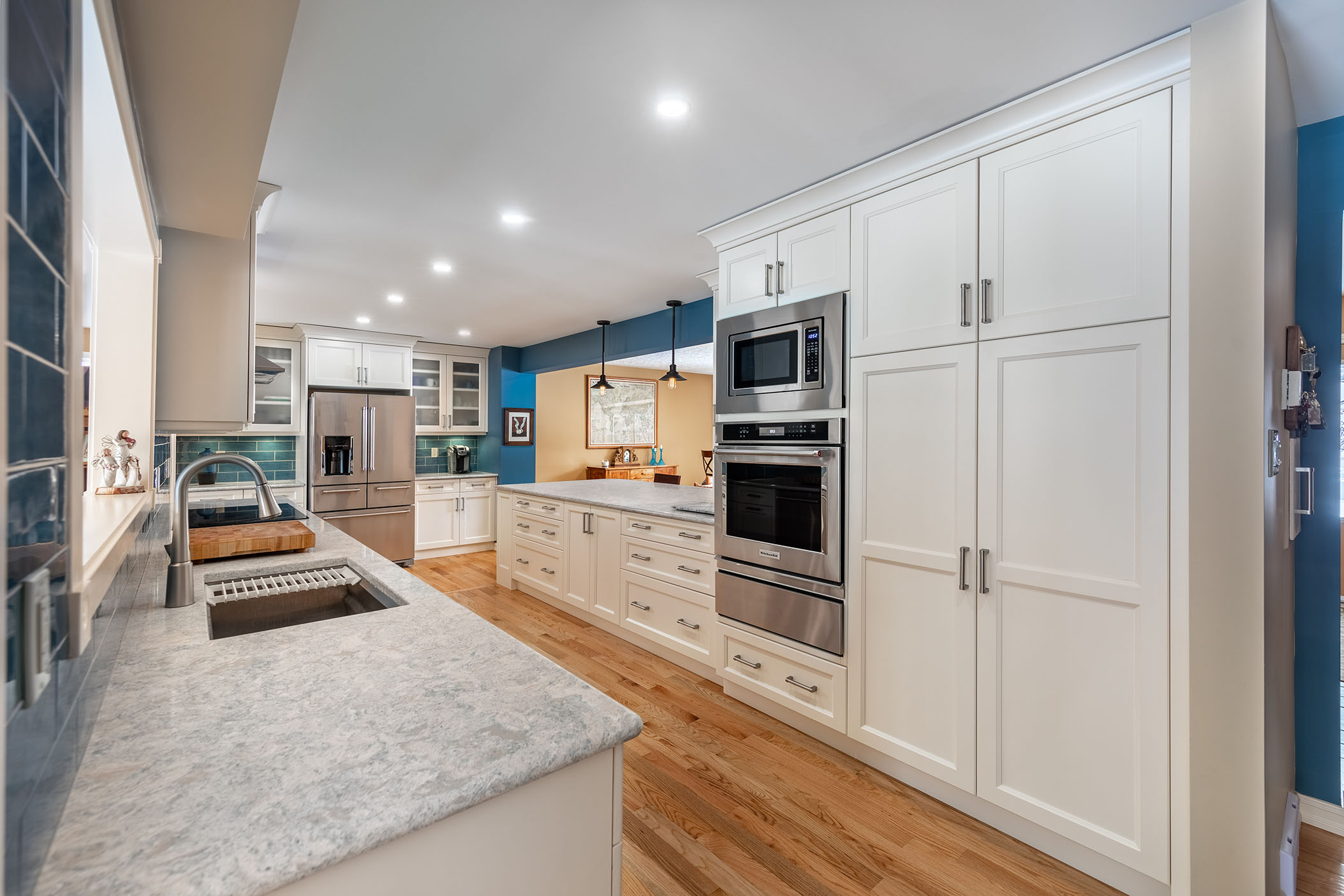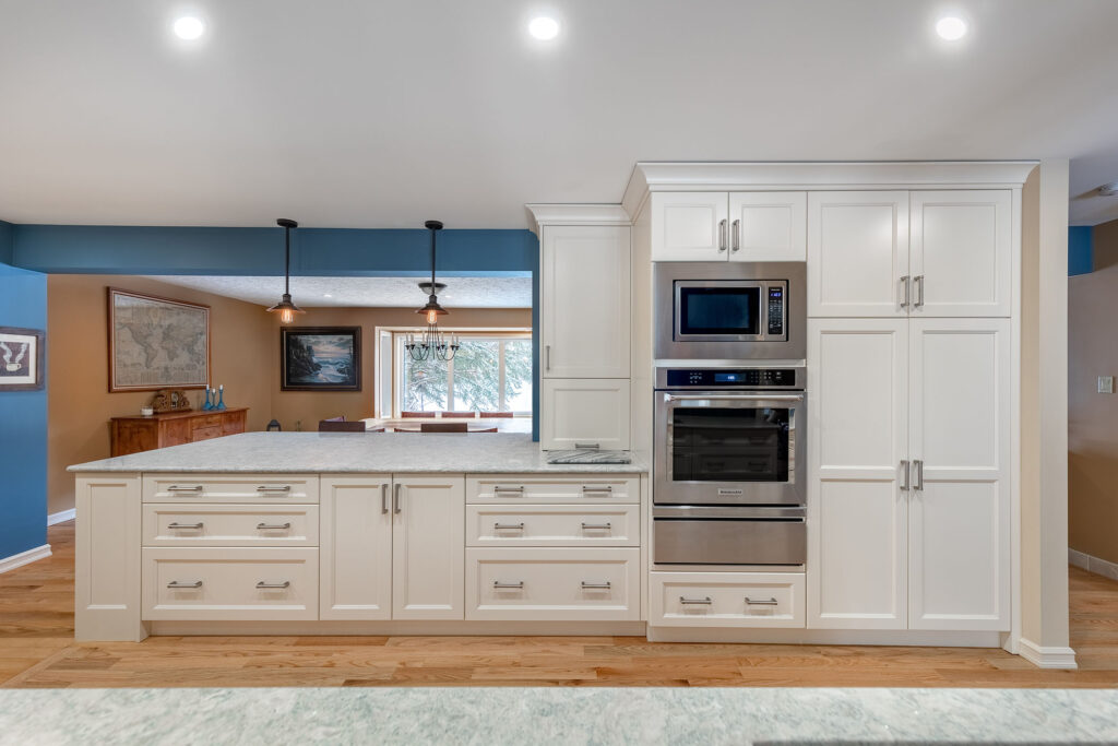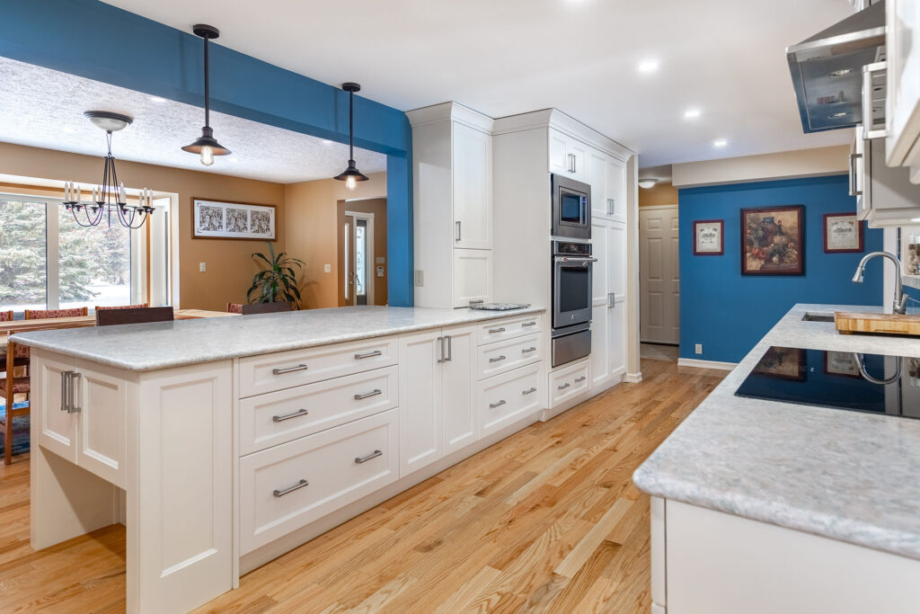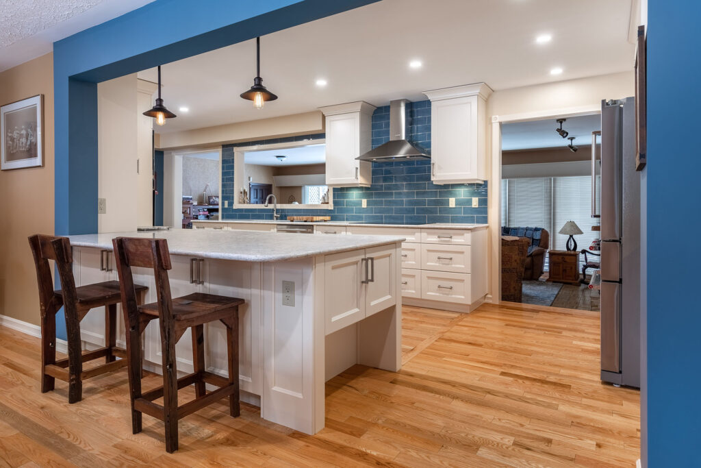 Fronting on one of the most sought after streets in Red Deer, the views of the forest across the way was top priority. First thing to accomplish was opening up the walls to allow these views and natural light to flow. Removing these walls also allowed us to DOUBLE the size of this soaring gallery style kitchen. This space is a chefs dream. Especially since the chef in this example loves to entertain!