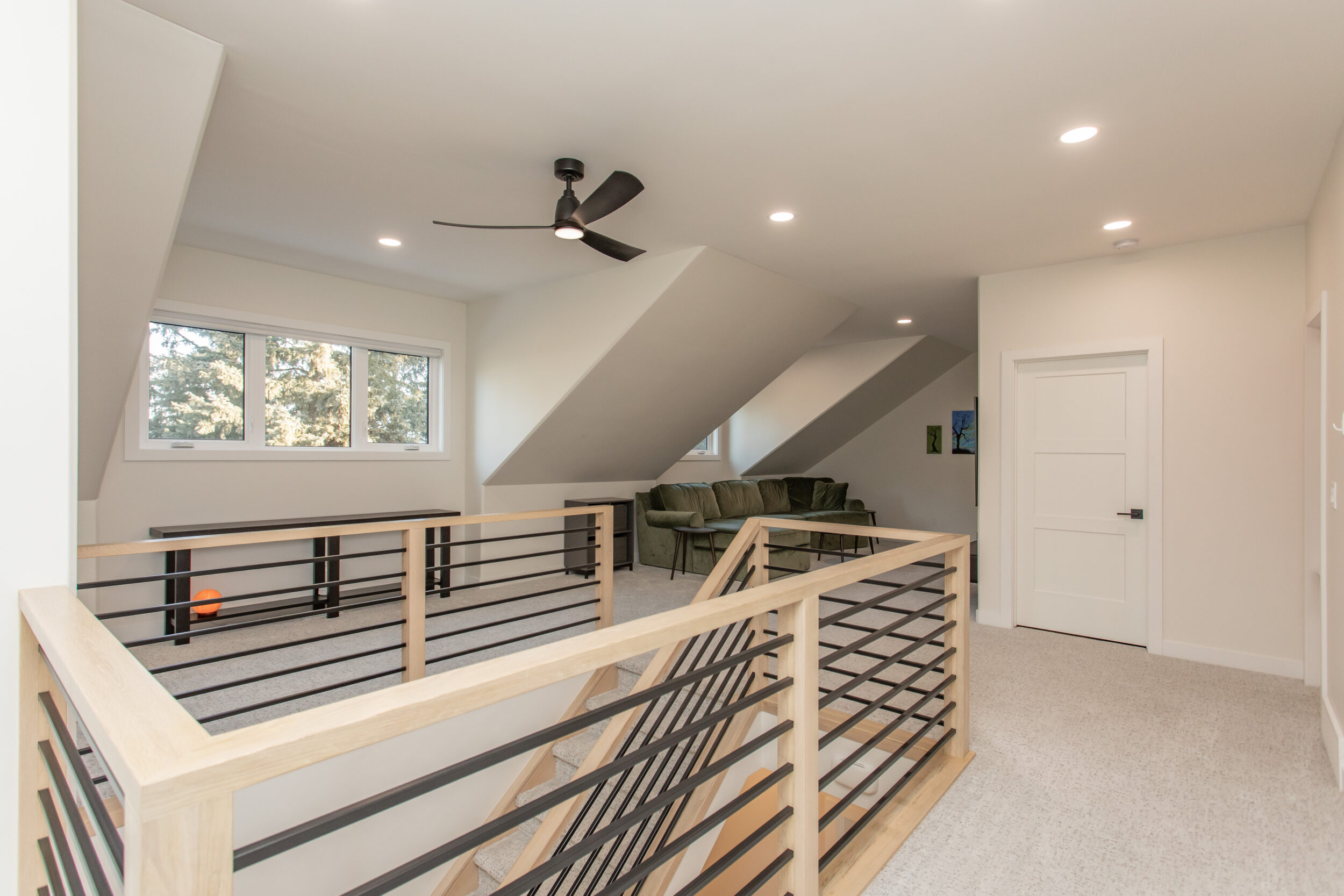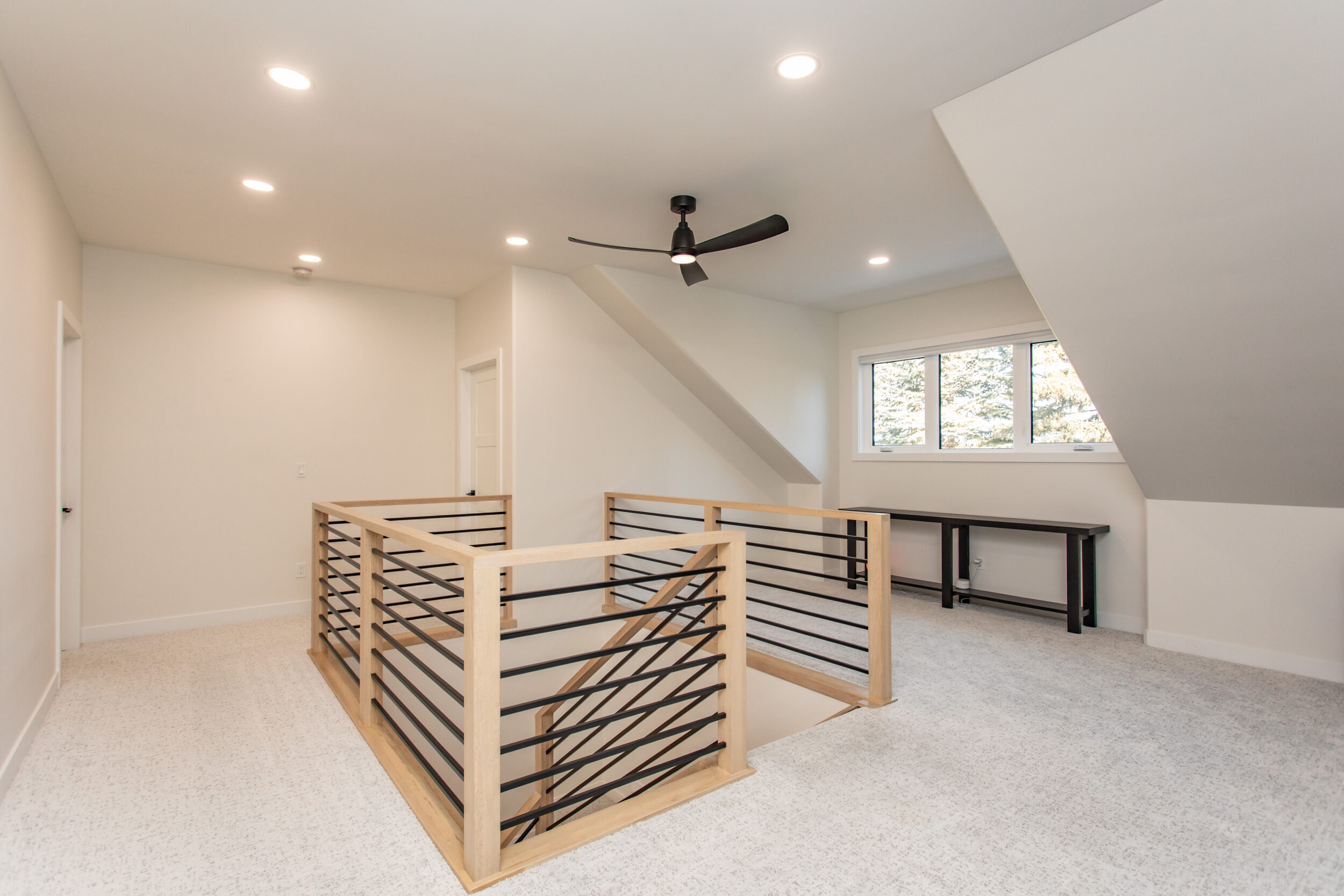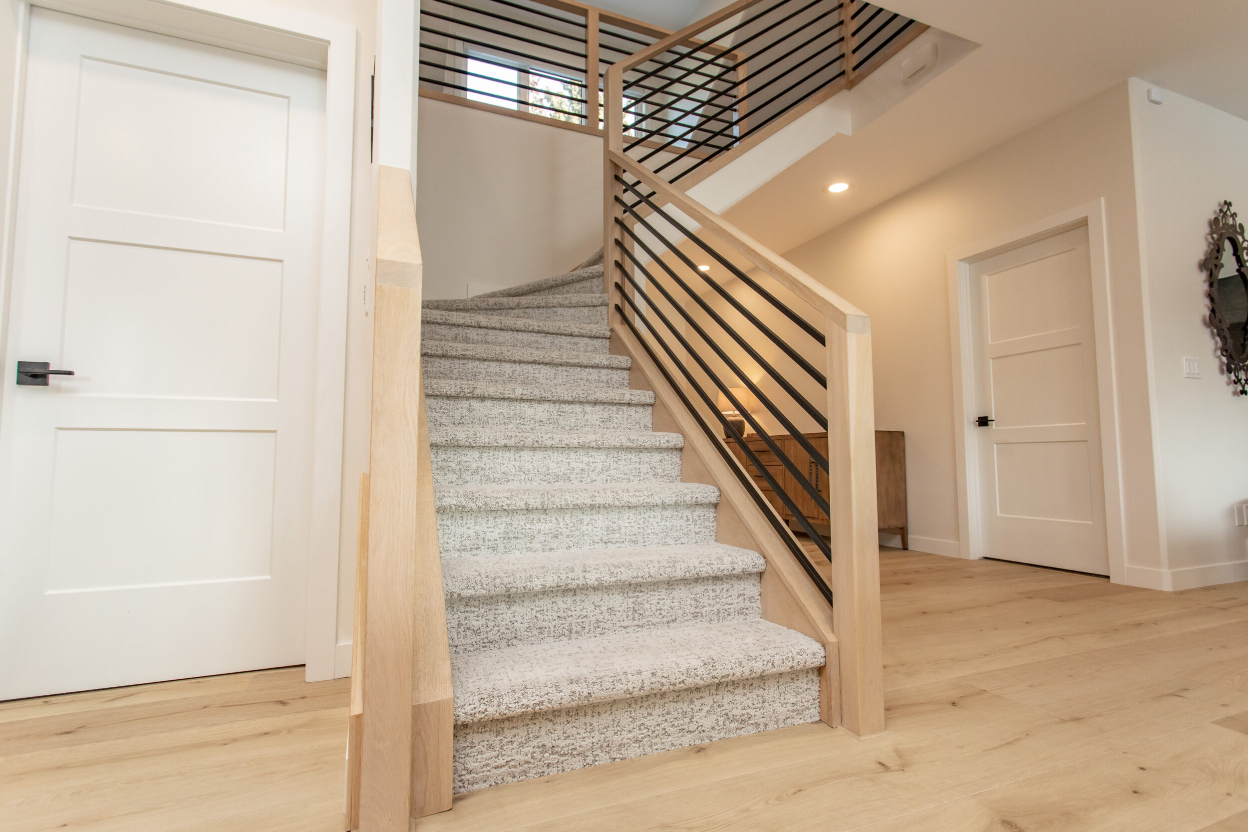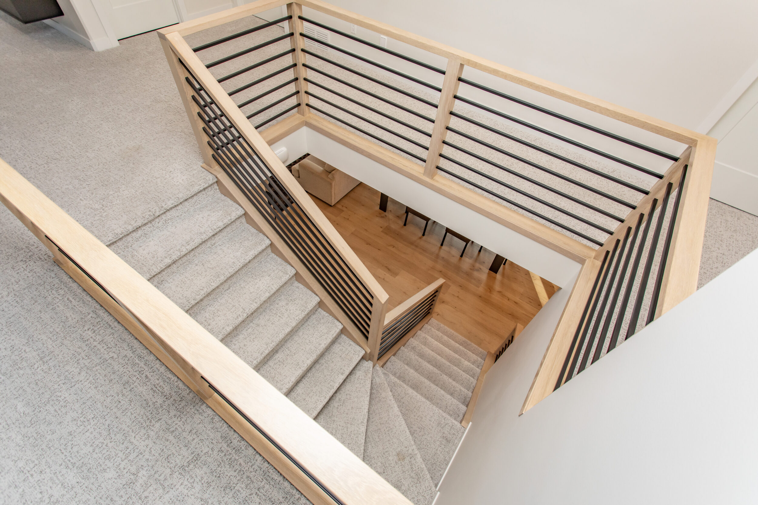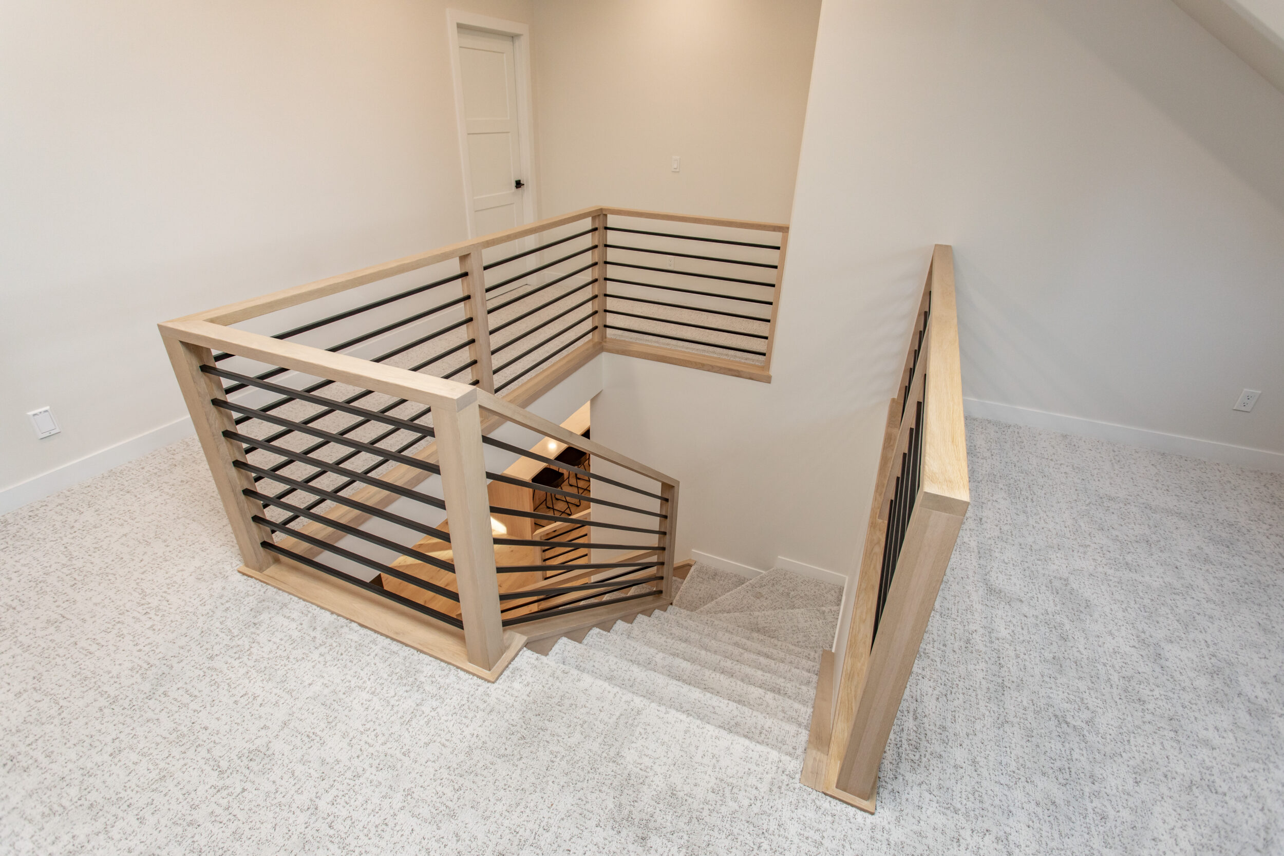The staircase was redesigned with updated railings, adding architectural interest while visually connecting the main floor to the upper level.