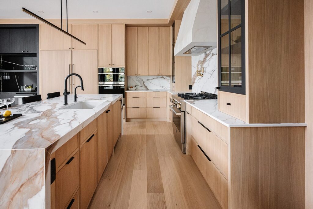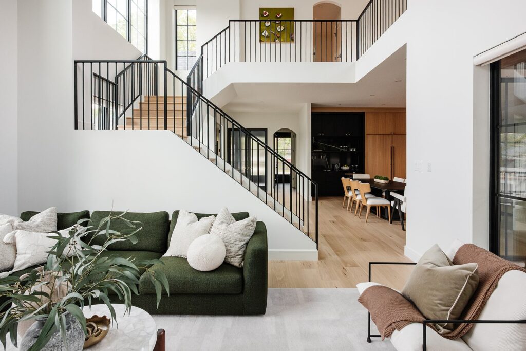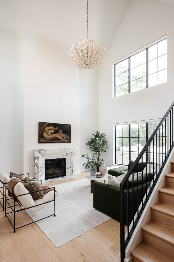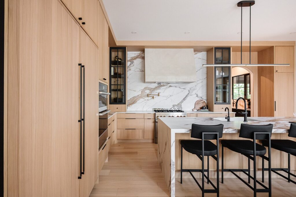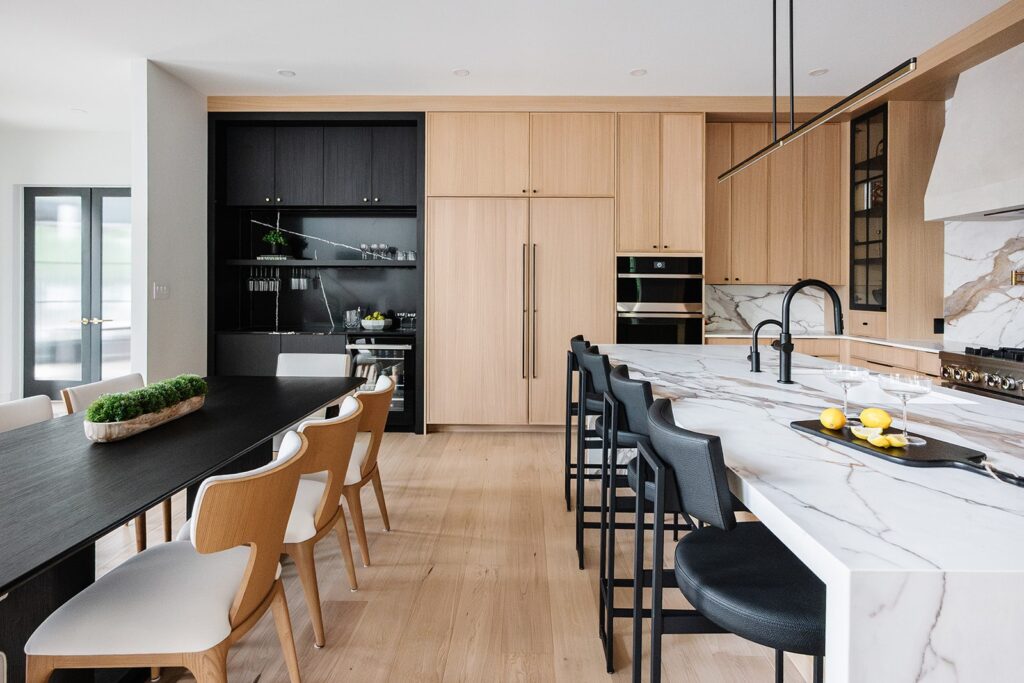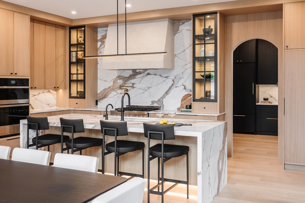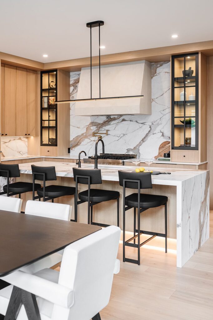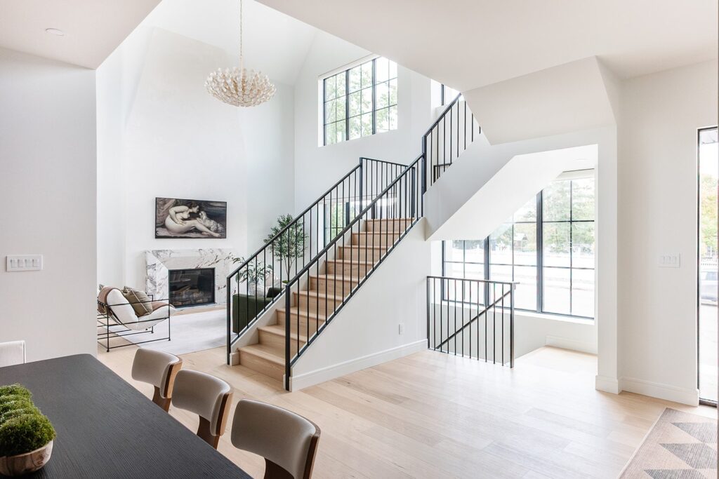 This home blends luxurious modern design with warm organic elements. Light-filled spaces feature white oak cabinetry and wide-plank engineered hardwood that create a soft, natural foundation. The kitchen showcases quartz countertops and full height backsplash that frames a Venetian player range hood, complimented by the modern black oak and sleek custom metal accents. In the living room, a striking porcelain fireplace and soaring ceilings add refined drama. Every detail, from the sculptural metal staircase railing to the hand crafted light fixtures and personalization of each room, reflects elevated craftsmanship and timeless contemporary style.